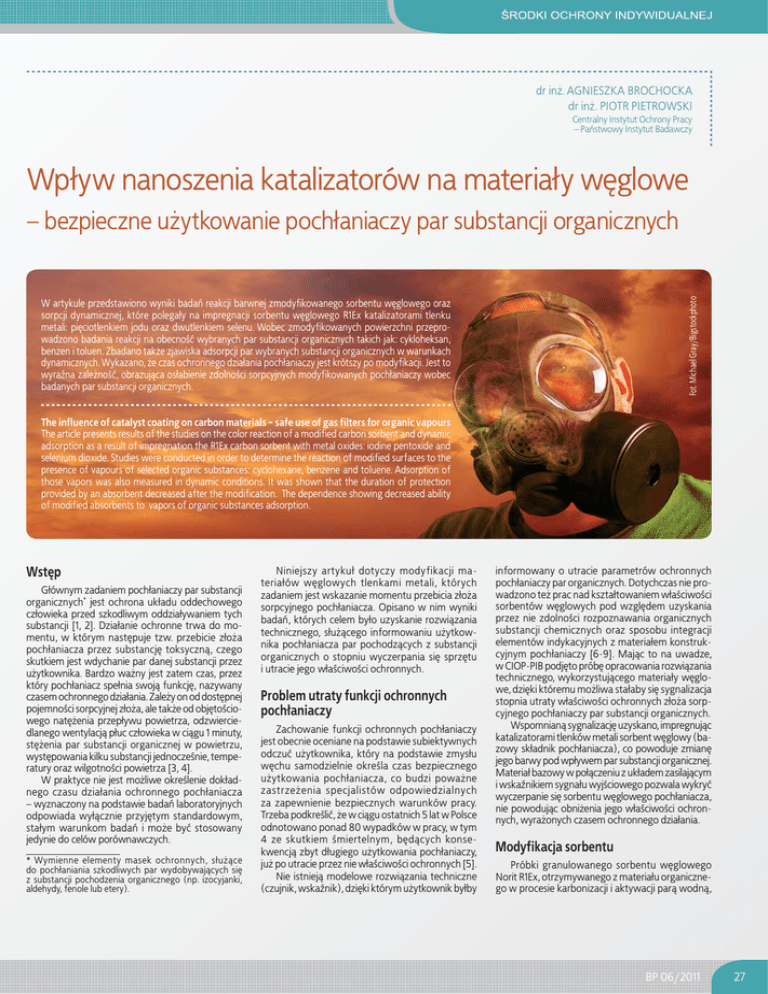 dr in¿. AGNIESZKA BROCHOCKA dr in¿. PIOTR PIETROWSKI Centralny Instytut Ochrony Pracy – Pañstwowy Instytut Badawczy Wp³yw nanoszenia katalizatorów na materia³y wêglowe Fot. Michael Gray/Bigstockphoto – bezpieczne u¿ytkowanie poch³aniaczy par substancji organicznych W artykule przedstawiono wyniki badañ reakcji barwnej zmodyfikowanego sorbentu wêglowego oraz sorpcji dynamicznej, które polega³y na impregnacji sorbentu wêglowego R1Ex katalizatorami tlenku metali: piêciotlenkiem jodu oraz dwutlenkiem selenu. Wobec zmodyfikowanych powierzchni przeprowadzono badania reakcji na obecnośæ wybranych par substancji organicznych takich jak: cykloheksan, benzen i toluen. Zbadano tak¿e zjawiska adsorpcji par wybranych substancji organicznych w warunkach dynamicznych. Wykazano, ¿e czas ochronnego dzia³ania poch³aniaczy jest krótszy po modyfikacji. Jest to wyraźna zale¿nośæ, obrazuj¹ca os³abienie zdolności sorpcyjnych modyfikowanych poch³aniaczy wobec badanych par substancji organicznych. The influence of catalyst coating on carbon materials - safe use of gas filters for organic vapours The article presents results of the studies on the color reaction of a modified carbon sorbent and dynamic adsorption as a result of impregnation the R1Ex carbon sorbent with metal oxides: iodine pentoxide and selenium dioxide. Studies were conducted in order to determine the reaction of modified surfaces to the presence of vapours of selected organic substances: cyclohexane, benzene and toluene. Adsorption of those vapors was also measured in dynamic conditions. It was shown that the duration of protection provided by an absorbent decreased after the modification. The dependence showing decreased ability of modified absorbents to vapors of organic substances adsorption. Wstêp G³ównym zadaniem poch³aniaczy par substancji organicznych* jest ochrona uk³adu oddechowego cz³owieka przed szkodliwym oddzia³ywaniem tych substancji [1, 2]. Dzia³anie ochronne trwa do momentu, w którym nastêpuje tzw. przebicie z³o¿a poch³aniacza przez substancjê toksyczn¹, czego skutkiem jest wdychanie par danej substancji przez u¿ytkownika. Bardzo wa¿ny jest zatem czas, przez który poch³aniacz spe³nia swoj¹ funkcjê, nazywany czasem ochronnego dzia³ania. Zale¿y on od dostêpnej pojemności sorpcyjnej z³o¿a, ale tak¿e od objêtościowego natê¿enia przep³ywu powietrza, odzwierciedlanego wentylacj¹ p³uc cz³owieka w ci¹gu 1 minuty, stê¿enia par substancji organicznej w powietrzu, wystêpowania kilku substancji jednocześnie, temperatury oraz wilgotności powietrza [3, 4]. W praktyce nie jest mo¿liwe określenie dok³adnego czasu dzia³ania ochronnego poch³aniacza – wyznaczony na podstawie badañ laboratoryjnych odpowiada wy³¹cznie przyjêtym standardowym, sta³ym warunkom badañ i mo¿e byæ stosowany jedynie do celów porównawczych. * Wymienne elementy masek ochronnych, s³u¿¹ce do poch³aniania szkodliwych par wydobywaj¹cych siê z substancji pochodzenia organicznego (np. izocyjanki, aldehydy, fenole lub etery). Niniejszy artyku³ dotyczy modyfikacji materia³ów wêglowych tlenkami metali, których zadaniem jest wskazanie momentu przebicia z³o¿a sorpcyjnego poch³aniacza. Opisano w nim wyniki badañ, których celem by³o uzyskanie rozwi¹zania technicznego, s³u¿¹cego informowaniu u¿ytkownika poch³aniacza par pochodz¹cych z substancji organicznych o stopniu wyczerpania siê sprzêtu i utracie jego w³aściwości ochronnych. Problem utraty funkcji ochronnych poch³aniaczy Zachowanie funkcji ochronnych poch³aniaczy jest obecnie oceniane na podstawie subiektywnych odczuæ u¿ytkownika, który na podstawie zmys³u wêchu samodzielnie określa czas bezpiecznego u¿ytkowania poch³aniacza, co budzi powa¿ne zastrze¿enia specjalistów odpowiedzialnych za zapewnienie bezpiecznych warunków pracy. Trzeba podkreśliæ, ¿e w ci¹gu ostatnich 5 lat w Polsce odnotowano ponad 80 wypadków w pracy, w tym 4 ze skutkiem śmiertelnym, bêd¹cych konsekwencj¹ zbyt d³ugiego u¿ytkowania poch³aniaczy, ju¿ po utracie przez nie w³aściwości ochronnych [5]. Nie istniej¹ modelowe rozwi¹zania techniczne (czujnik, wskaźnik), dziêki którym u¿ytkownik by³by informowany o utracie parametrów ochronnych poch³aniaczy par organicznych. Dotychczas nie prowadzono te¿ prac nad kszta³towaniem w³aściwości sorbentów wêglowych pod wzglêdem uzyskania przez nie zdolności rozpoznawania organicznych substancji chemicznych oraz sposobu integracji elementów indykacyjnych z materia³em konstrukcyjnym poch³aniaczy [6-9]. Maj¹c to na uwadze, w CIOP-PIB podjêto próbê opracowania rozwi¹zania technicznego, wykorzystuj¹cego materia³y wêglowe, dziêki któremu mo¿liwa sta³aby siê sygnalizacja stopnia utraty w³aściwości ochronnych z³o¿a sorpcyjnego poch³aniaczy par substancji organicznych. Wspomnian¹ sygnalizacjê uzyskano, impregnuj¹c katalizatorami tlenków metali sorbent wêglowy (bazowy sk³adnik poch³aniacza), co powoduje zmianê jego barwy pod wp³ywem par substancji organicznej. Materia³ bazowy w po³¹czeniu z uk³adem zasilaj¹cym i wskaźnikiem sygna³u wyjściowego pozwala wykryæ wyczerpanie siê sorbentu wêglowego poch³aniacza, nie powoduj¹c obni¿enia jego w³aściwości ochronnych, wyra¿onych czasem ochronnego dzia³ania. Modyfikacja sorbentu Próbki granulowanego sorbentu wêglowego Norit R1Ex, otrzymywanego z materia³u organicznego w procesie karbonizacji i aktywacji par¹ wodn¹, BP 06/2011 27 Rys. 1. Schemat dwuelektrodowego reaktora plazmowego RF Fig. 1. Scheme of the RF plasma reactor two-electrode Fot. Sposób umieszczenia obrabianego sorbentu wêglowego w komorze reaktora plazmowego Photo. Placement method of the carbon sorbent treated in the plasma reactor R3 5 6 R1 R2 7 3 8 2 Rys. 2. Schemat stanowiska do badania czasu przebicia i pojemności sorpcyjnej elementów oczyszczaj¹cych: 1 – źród³o powietrza; 2 – filtry; 3 – p³uczki zaw