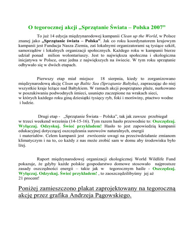 O tegorocznej akcji „Sprzątanie Świata – Polska 2007” To juŜ 14 edycja międzynarodowej kampanii Clean up the World, w Polsce znanej jako „Sprzątanie świata – Polska”. Jak co roku koordynatorem krajowym kampanii jest Fundacja Nasza Ziemia, zaś lokalnymi organizatorami są tysiące szkół, samorządów i lokalnych organizacji społecznych. KaŜdego roku w kampanii bierze udział ponad milion wolontariuszy. Jest to największa społeczna i ekologiczna inicjatywa w Polsce, oraz jedna z największych na świecie. W tym roku sprzątanie odbywało się w dwóch etapach. Pierwszy etap miał miejsce 18 sierpnia, kiedy to zorganizowano międzynarodową akcję Clean up Baltic Sea (Sprzątanie Bałtyku), zapraszając do niej wszystkie kraje leŜące nad Bałtykiem. W ramach akcji posprzątano plaŜe, nurkowano w poszukiwaniu podwodnych śmieci, usunięto zaczepione na wrakach sieci, w których kaŜdego roku giną dziesiątki tysięcy ryb, foki i morświny, ptactwo wodne i ludzie. Drugi etap - „Sprzątanie Świata – Polska”, tak jak zawsze przebiegał w trzeci weekend września (14-15-16). Tym razem hasło przewodnie to: Oszczędzaj. Wyłączaj. Odzyskuj. Świeć przykładem! Hasło to jest zapowiedzią kampanii edukacyjnej dotyczącej oszczędzania surowców naturalnych, energii i materiałów. Celem kampanii jest zwrócenie uwagi na przeciwdziałanie zmianom klimatyczym i na to, co kaŜdy z nas moŜe zrobić sam w domu aby środowisku było lŜej. Raport międzynarodowej organizacji ekologicznej World Wildlife Fund pokazuje, Ŝe gdyby kaŜde polskie gospodarstwo domowe stosowało najprostsze zasady oszczędności energii – takie jak w tegorocznym haśle - Oszczędzaj. Wyłączaj. Odzyskuj. Świeć przykładem! , to zaoszczędzilibyśmy jej aŜ 21 procent! PoniŜej zamieszczono plakat zaprojektowany na tegoroczną akcję przez grafika Andrzeja Pągowskiego. Oszczędzajmy wodę i energię – zapobiegajmy zmianom klimatu Zgaś zbędną Ŝarówkę, świeć przykładem. Wyłącz pięć Ŝarówek 60-cio watowych w korytarzu, przedpokoju lub pokojach, kiedy ich nie potrzebujesz, a zmniejszysz emisję dwutlenku węgla o 270 kg rocznie. Jeden stopień w domu mniej - Ziemi lŜej. ObniŜ temperaturę w domu o zaledwie 1 stopień Celsjusza, a ograniczysz emisję dwutlenku węgla nawet o 300 kg, a zuŜycie energii o 7,5 procent rocznie. Poza obniŜeniem emisji gazów cieplarnianych zaoszczędzisz teŜ pieniądze, bo ogrzewanie pochłania 70 procent energii uŜywanej przez gospodarstwo domowe. Zakupy codzienne z głową i własną torbą. Dzięki temu ograniczysz emisję dwutlenku węgla o 8 kg rocznie. PrzecieŜ kaŜdą plastikową, jednorazową torebkę trzeba wyprodukować i dostarczyć do sklepów – a do tego zuŜyć ropę naftową i energię. Nie lej wody. Upewnij się, Ŝe dobrze dokręcasz kurki, zreperuj cieknące krany i spłuczki. Zęby myj i gól się nie pod bieŜącą wodą. Rocznie w skali kraju marnujemy ponad 560.000 hektolitrów wody! Oszczędzając wodę oszczędzamy takŜe energię potrzebną do jej transportu, podgrzania i oczyszczania po uŜyciu. Gotowanie – nie przesadzaj z ogniem. UŜywaj pokrywek! Na herbatę lub kawę gotuj tylko tyle wody, ile potrzebujesz - ograniczysz emisję dwutlenku węgla o ok. 25 kg rocznie. Gdyby wszyscy Europejczycy gotowali tyle wody ile potrzebują, czyli średnio o 1 litr wody dziennie mniej, zaoszczędzona energia mogłaby zasilić jedną trzecią oświetlenia ulicznego w Europie. Wszystkie śmieci są nasze - poddawajmy je recyklingowi! Odzyskanie 1 kg puszek aluminiowych to obniŜenie emisji dwutlenku węgla o 9 kg i uniknięcie degradacji środowiska (pozyskujemy surowiec wtórny do produkcji w hutach, zamiast pozyskiwania i uŜywania boksytów). Wykorzystanie w produkcji 1 tony makulatury to uratowanie 17 drzew, oszczędność 25 procent energii, aŜ o 75 procent mniej zanieczyszczeń atmosfery oraz oszczędność 26.000 litrów wody! Zbierajmy zatem makulaturę i inne surowce wtórne, wybierajmy teŜ opakowania i produkty pochodzące z recyklingu.