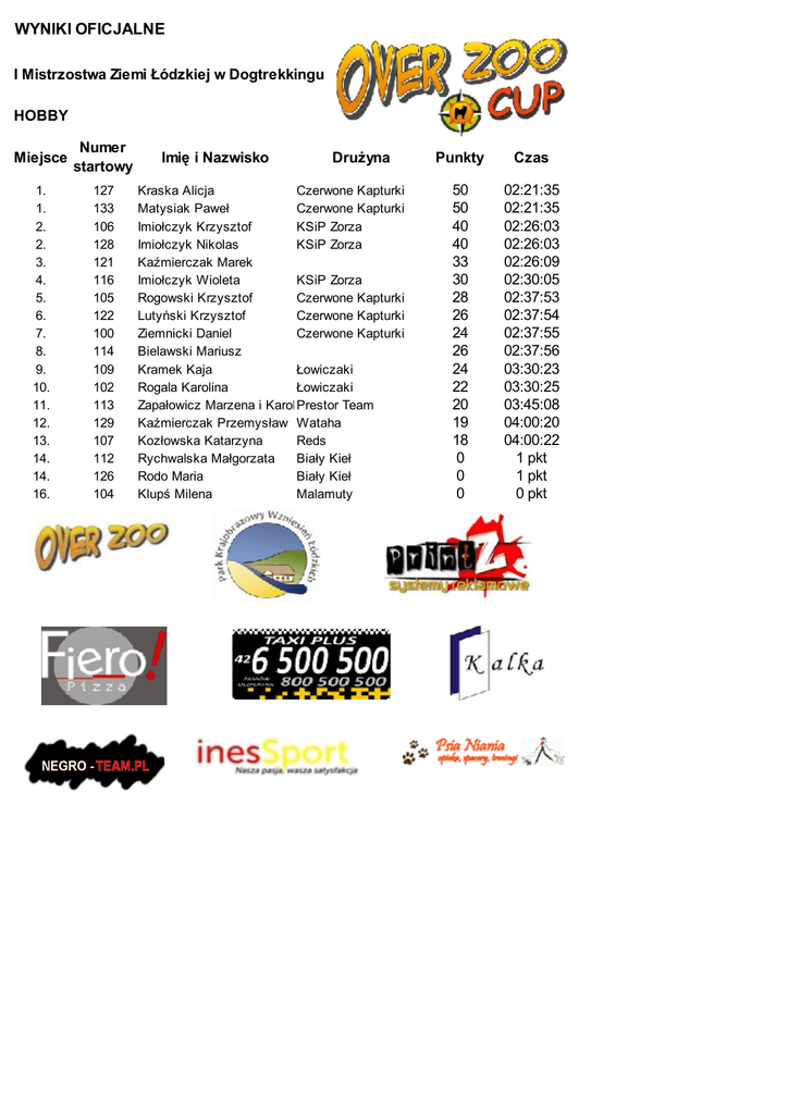 WYNIKI OFICJALNE I Mistrzostwa Ziemi Łódzkiej w Dogtrekkingu HOBBY Miejsce Numer startowy 1. 1. 2. 2. 3. 4. 5. 6. 7. 8. 9. 10. 11. 12. 13. 14. 14. 16. 127 133 106 128 121 116 105 122 100 114 109 102 113 129 107 112 126 104 Imię i Nazwisko Drużyna Kraska Alicja Czerwone Kapturki Matysiak Paweł Czerwone Kapturki Imiołczyk Krzysztof KSiP Zorza Imiołczyk Nikolas KSiP Zorza Kaźmierczak Marek Imiołczyk Wioleta KSiP Zorza Rogowski Krzysztof Czerwone Kapturki Lutyński Krzysztof Czerwone Kapturki Ziemnicki Daniel Czerwone Kapturki Bielawski Mariusz Kramek Kaja Łowiczaki Rogala Karolina Łowiczaki Zapałowicz Marzena i Karolina Prestor Team Kaźmierczak Przemysław Wataha Kozłowska Katarzyna Reds Rychwalska Małgorzata Biały Kieł Rodo Maria Biały Kieł Klupś Milena Malamuty Punkty Czas 50 50 40 40 33 30 28 26 24 26 24 22 20 19 18 0 0 0 02:21:35 02:21:35 02:26:03 02:26:03 02:26:09 02:30:05 02:37:53 02:37:54 02:37:55 02:37:56 03:30:23 03:30:25 03:45:08 04:00:20 04:00:22 1 pkt 1 pkt 0 pkt