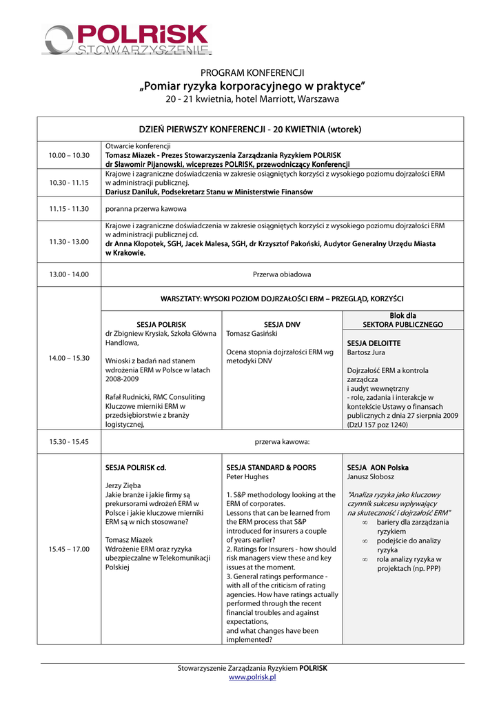 PROGRAM KONFERENCJI „Pomiar ryzyka korporacyjnego w praktyce” 20 - 21 kwietnia, hotel Marriott, Warszawa DZIEŃ PIERWSZY KONFERENCJI - 20 KWIETNIA (wtorek) 10.00 – 10.30 10.30 - 11.15 Otwarcie konferencji Tomasz Miazek - Prezes Stowarzyszenia Zarządzania Ryzykiem POLRISK POLRISK dr Sławomir Pijanowski, wiceprezes POLRISK, przewodniczący Konferencji Krajowe i zagraniczne doświadczenia w zakresie osiągniętych korzyści z wysokiego poziomu dojrzałości ERM w administracji publicznej. Dariusz Daniluk, Podsekretarz Stanu Stanu w Ministerstwie Finansów 11.15 - 11.30 poranna przerwa kawowa 11.30 - 13.00 Krajowe i zagraniczne doświadczenia w zakresie osiągniętych korzyści z wysokiego poziomu dojrzałości ERM w administracji publicznej cd. dr Anna Kłopotek, SGH, Jacek Malesa, SGH, SGH, dr Krzysztof Pakoński, Audytor Generalny Urzędu Miasta w Krakowie. 13.00 - 14.00 Przerwa obiadowa WARSZTATY: WYSOKI POZIOM DOJRZAŁOŚCI ERM – PRZEGLĄD, KORZYŚCI SESJA POLRISK dr Zbigniew Krysiak, Szkoła Główna Handlowa, 14.00 – 15.30 Wnioski z badań nad stanem wdrożenia ERM w Polsce w latach 2008-2009 SESJA DNV Tomasz Gasiński Ocena stopnia dojrzałości ERM wg metodyki DNV przerwa kawowa: SESJA POLRISK cd. Jerzy Zięba Jakie branże i jakie firmy są prekursorami wdrożeń ERM w Polsce i jakie kluczowe mierniki ERM są w nich stosowane? 15.45 – 17.00 SESJA DELOITTE Bartosz Jura Dojrzałość ERM a kontrola zarządcza i audyt wewnętrzny - role, zadania i interakcje w kontekście Ustawy o finansach publicznych z dnia 27 sierpnia 2009 (DzU 157 poz 1240) Rafał Rudnicki, RMC Consuliting Kluczowe mierniki ERM w przedsiębiorstwie z branży logistycznej, 15.30 - 15.45 Blok dla SEKTORA PUBLICZNEGO PUBLICZNEGO Tomasz Miazek Wdrożenie ERM oraz ryzyka ubezpieczalne w Telekomunikacji Polskiej SESJA STANDARD & POORS Peter Hughes SESJA AON Polska Janusz Słobosz 1. S&P methodology looking at the ERM of corporates. Lessons that can be learned from the ERM process that S&P introduced for insurers a couple of years earlier? 2. Ratings for Insurers - how should risk managers view these and key issues at the moment. 3. General ratings performance with all of the criticism of rating agencies. How have ratings actually performed through the recent financial troubles and against expectations, and what changes have been implemented? "Analiza ryzyka jako kluczowy czynnik sukcesu wpływający na skuteczność i dojrzałość ERM" Stowarzyszenie Zarządzania Ryzykiem POLRISK www.polrisk.pl • • • bariery dla zarządzania ryzykiem podejście do analizy ryzyka rola analizy ryzyka w projektach (np. PPP) DZIEŃ DRUGI KONFERENCJI - 21 KWIETNIA (środa) 9.30 – 11.30 Panel dyskusyjny: „Ile ryzyka w strategii oraz Strategii w ryzyku?” Kluczowe mierniki ryzyka (szans i zagrożeń) przedsiębiorstwa istotne dla rad nadzorczych Prowadzenie Panelu: Andrzej S. Nartowski, prezes Polskiego Instytutu Dyrektorów Specjalny Specjalny Gość: dr Wiesław Rozłucki, przewodniczący Rady Programowej, Polski Instytut Dyrektorów Paneliści: Beata Stelmach, SEG, Jakub Bojanowski, Deloitte, dr Łukasz Kononowicz, Stratex, dr Sławomir Pijanowski, Polrisk 11.30 – 12.00 poranna przerwa kawowa 12.00 – 13.00 Non Standard risks insurance Charlie Hanbury, Special Risks Underwriter, Hiscox London Market, Syndykat Lloyds 13.00 – 14.00 przerwa na obiad WARSZTATY – WSKAŹNIKI RYZYKA KORPORACYJNEGO Sesja AON POLSKA Sesja AXA CORPORATE SOLUTIONS Radosław Ziomko Sesja DELOITTE "Pomiar ryzyka a możliwości jego transferu" • 14.00 – 15.15 • • "Czy każde ryzyko można ubezpieczyć?" - cechy ryzyk umożliwiających ich transfer. "Czy wysokość składki jest najważniejszym elementem wyboru ubezpieczenia?" koncepcja Łącznych Kosztów Ryzyka i ich wpływ na kształt programu ubezpieczenia "Czy ubezpieczenie jest jedyną formą transferu ryzyka" - wprowadzenie do captives. 15.15-15.30 Jean Francois Spoiden Robert Kurzac Risk Management tools to serve an industrial company and the Insurance needs 1. Property Risk identification COPE + CATNAT meaning of this information. What is a Loss Estimate. How to BI Value: fixed and variable costs, seasonal activity, identifying the Value chain. 2. Liability Risk identificationBasis of insurer analysis of the liability risks. Lech Dąbrowski, Menedżer w Dziale Zarządzania Ryzykiem Deloitte Wskaźniki ryzyka w jednostkach finansów publicznych 1. Model oceny i wyceny ryzyk w jednostkach finansów publicznych. przerwa na kawę Sesja AXA CORPORATE SOLUTIONS cd. Sesja AON Joanna Tyra Piotr Roslon "Tworzenie i zarządzanie zależnymi towarzystwami ubezpieczeniowymi (captive)" 15.30 – 17.00 Blok dla SEKTORA PUBLICZNEGO 1. Czym jest captive? - przesłanki tworzenia spółek captive - zalety spółki captive 2. Aspekty tworzenia captive - regulacje prawne, proces uzyskania licencji - wymogi kapitałowe, wypłacalność - opodatkowanie, rezerwy techniczne - istota i charakter spółki 3. Szwajcaria jako siedziba captive 3. Risk Management – data analyzed by insurer. 4. Effects of Risk Management on a company Procedures, internal inspection of premises, score card for: housekeeping, industrial hygiene, existing fire protection features, smoking, hot work, management of dangerous products. Stowarzyszenie Zarządzania Ryzykiem POLRISK www.polrisk.pl SESJA DELOITTE cd. Elżbieta Pałkowska, Dyrektor w Dziale Zarządzania Ryzykiem Deloitte 2. Istotność KRI w zarządzaniu ryzykiem w jednostkach finansów publicznych. 3. Przegląd wskaźników stosowanych w jednostkach finansów publicznych Stowarzyszenie Zarządzania Ryzykiem POLRISK www.polrisk.pl