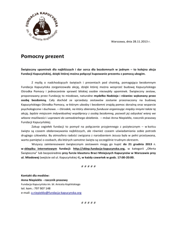 Warszawa, dnia 28.11.2013 r. Pomocny prezent Świąteczny upominek dla najbliższych i dar serca dla bezdomnych w jednym – to kolejna akcja Fundacji Kapucyńskiej, dzięki której można połączyć kupowanie prezentu z pomocą ubogim. Z myślą o nadchodzących świętach i prezentach pod choinką, pomagająca bezdomnym Fundacja Kapucyńska zorganizowała akcję, dzięki której można wesprzeć budowę Kapucyńskiego Ośrodka Pomocy i jednocześnie sprawić bliskiej osobie niezwykły upominek. Świąteczny zestaw, proponowany przez Fundację to miodowe, naturalne mydełko Nadzieja i różaniec wykonany przez osobę bezdomną. Cały dochód ze sprzedaży zestawów zostanie przeznaczony na budowę Kapucyńskiego Ośrodka Pomocy, w którym ubodzy i bezdomni znajdą pomoc doraźną oraz wsparcie psychologiczne i duchowe. – Ośrodek, na który zbieramy fundusze organizując między innymi także tę akcję, będzie miejscem indywidualnej współpracy z osobą bezdomną, pozwoli jej odzyskać wiarę we własne możliwości i usprawni do samodzielnego działania. – mówi Anna Niepiekło, rzecznik prasowy Fundacji Kapucyńskiej. Zakup cegiełek fundacji to pomysł na połączenie przyjemnego z pożytecznym – w końcu święta są czasem obdarowywania najbliższych, ale również czasem uświadamiania sobie potrzeb drugiego człowieka. By atmosfera radości związana z narodzeniem Jezusa była w pełni przeżywana, warto pamiętać o osobach, dla których samotne święta są szczególnie trudnym okresem. Wszyscy zainteresowani świątecznym zestawem mogą go kupić do 21 grudnia 2013 r. w sklepiku internetowym fundacji: http://sklep.fundacja-kapucynska.org, w kategorii „Oferta Świąteczna” lub bezpośrednio przy furcie klasztoru Braci Mniejszych Kapucynów w Warszawie przy ul. Miodowej (wejście od ul. Kapucyńskiej 4), w każdy czwartek w godz. 17:00-20:00. # # # # # Kontakt dla mediów: Anna Niepiekło - rzecznik prasowy Fundacja Kapucyńska im. bł. Aniceta Koplińskiego tel. kom.: 797 907 148 e-mail: [email protected] # # # # # „Fundacja Kapucyńska im. bł. Aniceta Koplińskiego” powstała w 2010 roku z inicjatywy Braci Mniejszych Kapucynów z Warszawy oraz ludzi świeckich. Fundatorem Fundacji jest Radosław Pazura. Fundacja wspiera działalność Braci Mniejszych Kapucynów skierowaną do ludzi potrzebujących. Bracia od 20 lat prowadzą przyklasztorną Jadłodajnię dla ubogich i bezdomnych w Warszawie, przy ulicy Miodowej 13. Z jadłodajni korzysta codziennie około 200 osób, które otrzymują strawę nie tylko dla ciała, ale i duszy. W przyjaznym środowisku jadłodajni istnieje również duszpasterstwo bezdomnych oraz organizowane są rekolekcje i spotkania formacyjne. Realizacja działań możliwa jest dzięki wsparciu blisko 100 wolontariuszy oraz pomocy wielu ludzi dobrej woli. Wszystkie przedsięwzięcia prowadzone przez Fundację mają na celu pomoc ludziom ubogim i bezdomnym. Stałym elementem działań jest projekt „Anioł w Warszawie” – asystent osoby bezdomnej, spotkania wspólnoty duszpasterskiej ludzi bezdomnych "Schody do nieba" oraz cotygodniowe „Bezdomnych spotkania z kulturą”, na które zapraszani są znani ludzie ze świata mediów. W 2010 roku „Fundacja Kapucyńska im. bł. Aniceta Koplińskiego” podpisała „Deklarację partnerstwa na rzecz wychodzenia z bezdomności”. „Fundacja Kapucyńska im. bł. Aniceta Koplińskiego” Klasztor Braci Mniejszych Kapucynów w Warszawie, ul. Kapucyńska 4, 00-245 Warszawa www.fundacja-kapucynska.org www.jadlodajnia-miodowa.org