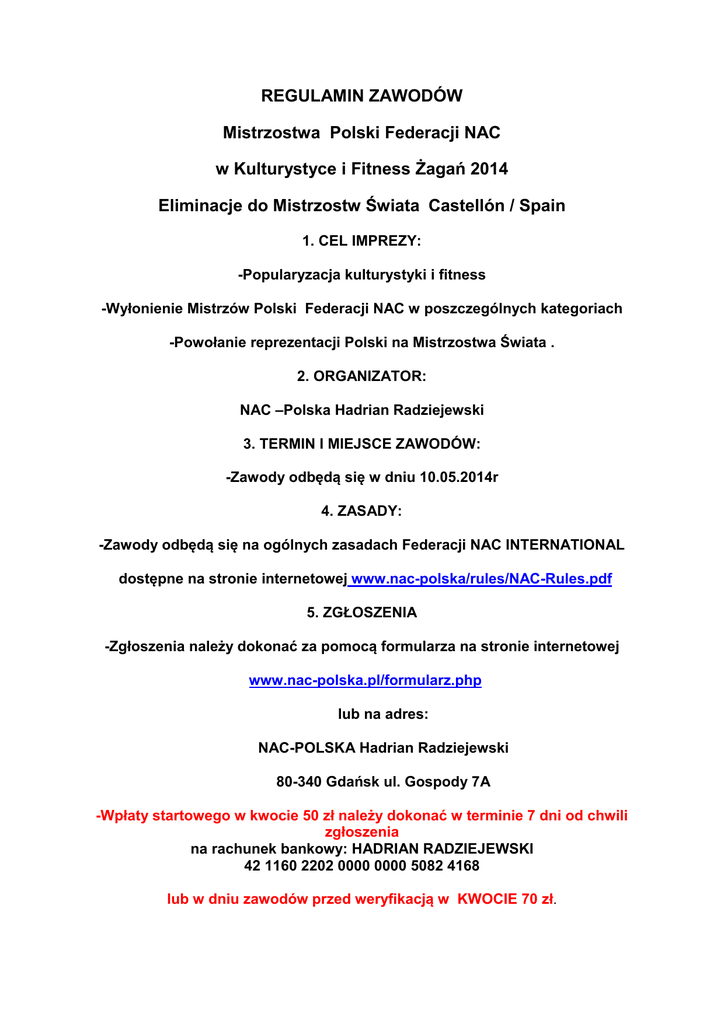 REGULAMIN ZAWODÓW Mistrzostwa Polski Federacji NAC w Kulturystyce i Fitness Żagań 2014 Eliminacje do Mistrzostw Świata Castellón / Spain 1. CEL IMPREZY: -Popularyzacja kulturystyki i fitness -Wyłonienie Mistrzów Polski Federacji NAC w poszczególnych kategoriach -Powołanie reprezentacji Polski na Mistrzostwa Świata . 2. ORGANIZATOR: NAC –Polska Hadrian Radziejewski 3. TERMIN I MIEJSCE ZAWODÓW: -Zawody odbędą się w dniu 10.05.2014r 4. ZASADY: -Zawody odbędą się na ogólnych zasadach Federacji NAC INTERNATIONAL dostępne na stronie internetowej www.nac-polska/rules/NAC-Rules.pdf 5. ZGŁOSZENIA -Zgłoszenia należy dokonać za pomocą formularza na stronie internetowej www.nac-polska.pl/formularz.php lub na adres: NAC-POLSKA Hadrian Radziejewski 80-340 Gdańsk ul. Gospody 7A -Wpłaty startowego w kwocie 50 zł należy dokonać w terminie 7 dni od chwili zgłoszenia na rachunek bankowy: HADRIAN RADZIEJEWSKI 42 1160 2202 0000 0000 5082 4168 lub w dniu zawodów przed weryfikacją w KWOCIE 70 zł. 6. WERYFIKACJA -Weryfikacja zawodników odbędzie się w dniu zawodów od godz. 10.00 do 12.00 w miejscu zawodów. -Przy weryfikacji wymagany jest dokument tożsamości i potwierdzenie wpłaty. -Podczas weryfikacji zawodników odbędzie się ważenie i pomiar wzrostu -Zawodnik zobowiązany jest do dostarczenia podkładu muzycznego TYLKO na płycie CD opisanych nazwiskiem zawodnika. (nagranie należy umieścić na początku nośnika). 7. KATEGORIE -dostępne na stronie: http://www.nac-polska.pl/categories/categories.htm 8. PRZYJAZD I ZAKWATEROWANIE -Uczestnicy zawodów przyjeżdżają na koszt własny. -Organizator przygotował 50 bezpłatnych miejsc noclegowych dla zawodników dojeżdżających z dalszych regionów Polski (powyżej 200km) REZERWACJI NOCLEGÓW NALEŻY DOKONAĆ NAJPÓŹNIEJ DO 20.04.2014r. (rezerwacja jest ważna tylko po uprzednim uregulowaniu opłaty startowej) 9. NAGRODY Juniorzy , Masters (Weterani) -I miejsce nagroda pieniężna lub nagroda rzeczowa o wartości minimum 500PLN + puchar -II miejsce nagroda pieniężna lub nagroda rzeczowa o wartości minimum 300PLN + puchar -III miejsce nagroda pieniężna lub nagroda rzeczowa o wartości minimum 200PLN+ puchar Athletic(Kulturystyka Klasyczna);Grupa 1:powyżej 1,75m,Grupa 2: do 1,75m włącznie: -I miejsce nagroda pieniężna lub nagroda rzeczowa o wartości minimum 1000PLN+ puchar -II miejsce nagroda pieniężna lub nagroda rzeczowa o wartości minimum 300PLN+ puchar -III miejsce nagroda pieniężna lub nagroda rzeczowa o wartości minimum 200PLN+ puchar Men Body(Mr. Muskulatury);Grupa 1:powyżej 1,79m wzrostu, Grupa 2:1,73m do 1,79m wyłącznie, Grupa 3:do 1,72m włącznie -I miejsce nagroda pieniężna lub nagroda rzeczowa o wartości minimum 1000PLN+ puchar -II miejsce nagroda pieniężna lub nagroda rzeczowa o wartości minimum 500PLN+ puchar -III miejsce nagroda pieniężna minimum lub nagroda rzeczowa o wartości minimum 300PLN+ puchar -Kategoria OPEN - statuetka + nagroda pieniężna minimum 3000PLN Ms. Figure,Ms., Ms.Shape (bikini) -I miejsce nagroda pieniężna lub nagroda rzeczowa o wartości minimum 500PLN+ puchar -II miejsce nagroda pieniężna lub nagroda rzeczowa o wartości minimum 300PLN+ puchar -III miejsce nagroda pieniężna lub nagroda rzeczowa o wartości minimum 200PLN+ puchar COUPLES(Pary) -I miejsce nagroda rzeczowa + puchar -II miejsce nagroda rzeczowa + puchar -III miejsce nagroda rzeczowa + puchar Debiuty -I miejsce nagroda rzeczowa + puchar -II miejsce nagroda rzeczowa + puchar -III miejsce nagroda rzeczowa + puchar 10. POSTANOWIENIA KOŃCOWE -Organizator zastrzega sobie zmianę wysokości nagród pieniężnych jeśli w grupie występuje mniej niż 5 zawodników lub zawodniczek. -Skład reprezentacji na MŚ zostanie ogłoszony po zakończeniu zawodów. -Przystąpienie do rywalizacji oznacza akceptację niniejszego Regulaminu. -Sprawy sporne wynikłe podczas zawodów, a nie ujęte w niniejszym regulaminie rozstrzyga sędzia główny zawodów i organizator. 11. INFORMACJE -Wszelkich dodatkowych informacji o zawodach udziela Prezydium Federacji NAC-POLSKA.