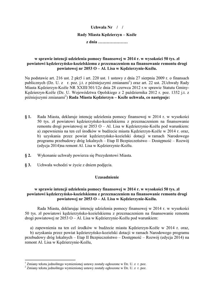 Uchwała Nr / / Rady Miasta Kędzierzyn – Koźle z dnia ………………… w sprawie intencji udzielenia pomocy finansowej w 2014 r. w wysokości 50 tys. zł powiatowi kędzierzyńsko-kozielskiemu z przeznaczeniem na finansowanie remontu drogi powiatowej nr 2053 O – Al. Lisa w Kędzierzynie-Koźlu. Na podstawie art. 216 ust. 2 pkt5 i art. 220 ust. 1 ustawy z dnia 27 sierpnia 2009 r. o finansach publicznych (Dz. U. z r. poz. j.t. z późniejszymi zmianami1) oraz art. 22 ust. 2Uchwały Rady Miasta Kędzierzyn-Koźle NR XXIII/301/12z dnia 28 czerwca 2012 r.w sprawie Statutu GminyKędzierzyn-Koźle (Dz. U. Województwa Opolskiego z 2 października 2012 r. poz. 1352 j.t. z późniejszymi zmianami2) Rada Miasta Kędzierzyn – Koźle uchwala, co następuje: § 1. Rada Miasta, deklaruje intencję udzielenia pomocy finansowej w 2014 r. w wysokości 50 tys. zł powiatowi kędzierzyńsko-kozielskiemu z przeznaczeniem na finansowanie remontu drogi powiatowej nr 2053 O – Al. Lisa w Kędzierzynie-Koźlu pod warunkiem: a) zapewnienia na ten cel środków w budżecie miasta Kędzierzyn-Koźle w 2014 r. oraz, b) uzyskania przez powiat kędzierzyńsko-kozielski dotacji w ramach Narodowego programu przebudowy dróg lokalnych – Etap II Bezpieczeństwo – Dostępność – Rozwój (edycja 2014)na remont Al. Lisa w Kędzierzynie-Koźlu. § 2. Wykonanie uchwały powierza się Prezydentowi Miasta. § 3. Uchwała wchodzi w życie z dniem podjęcia. Uzasadnienie w sprawie intencji udzielenia pomocy finansowej w 2014 r. w wysokości 50 tys. zł powiatowi kędzierzyńsko-kozielskiemu z przeznaczeniem na finansowanie remontu drogi powiatowej nr 2053 O – Al. Lisa w Kędzierzynie-Koźlu. Rada Miasta, deklarując intencję udzielenia pomocy finansowej w 2014 r. w wysokości 50 tys. zł powiatowi kędzierzyńsko-kozielskiemu z przeznaczeniem na finansowanie remontu drogi powiatowej nr 2053 O – Al. Lisa w Kędzierzynie-Koźlu pod warunkiem: a) zapewnienia na ten cel środków w budżecie miasta Kędzierzyn-Koźle w 2014 r. oraz, b) uzyskania przez powiat kędzierzyńsko-kozielski dotacji w ramach Narodowego programu przebudowy dróg lokalnych – Etap II Bezpieczeństwo – Dostępność – Rozwój (edycja 2014) na remont Al. Lisa w Kędzierzynie-Koźlu, 1 2 Zmiany tekstu jednolitego wymienionej ustawy zostały ogłoszone w Dz. U. z r. poz. Zmiany tekstu jednolitego wymienionej ustawy zostały ogłoszone w Dz. U. z r. poz. umożliwi powiatowi kędzierzyńsko-kozielskiemu uzyskanie większej liczby punktów przy ocenie wniosku o dofinansowanie. Ewentualne uzyskanie pomocy i remont Al. Lisa przyczyni się do zwiększenia bezpieczeństwa, przepustowości i komfortu jazdy na przedmiotowym odcinku drogi.