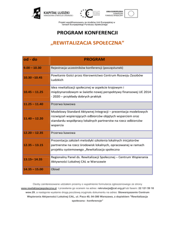 Projekt współfinansowany ze środków Unii Europejskiej w ramach Europejskiego Funduszu Społecznego PROGRAM KONFERENCJI „REWITALIZACJA SPOŁECZNA” od - do PROGRAM 9.00 – 10.30 Rejestracja uczestników konferencji (poczęstunek) 10.30 –10.45 Powitanie Gości przez Kierownictwo Centrum Rozwoju Zasobów Ludzkich 10.45 – 11.25 Idea rewitalizacji społecznej w aspekcie krajowym i międzynarodowym w świetle nowej perspektywy finansowej UE 2014 - 2020 – przykłady dobrych praktyk 11.25 – 11.40 Przerwa kawowa 11.40 – 12.20 Modelowy Standard Aktywnej Integracji – prezentacja modelowych rozwiązań wspierających odbiorców objętych wsparciem oraz standardu współpracy lokalnych partnerstw na rzecz odbiorców wsparcia 12.20 – 12.35 Przerwa kawowa 12.35 – 13.15 Prezentacja założeń metodyki szkolenia lokalnych inicjatorów partnerstw na rzecz środowisk lokalnych, opracowanej w ramach projektu systemowego „Rewitalizacja społeczna 13.15– 14.35 Regionalny Panel ds. Rewitalizacji Społecznej – Centrum Wspierania Aktywności Lokalnej CAL w Warszawie 14.35 – 15.00 Obiad Osoby zainteresowane udziałem prosimy o wypełnienie formularza zgłoszeniowego ze strony www.rewitalizacjaspoleczna.pl i przesłanie go scanem na adres: [email protected] lub faxem: 22 121 59 10 wew.29, a następnie wysłanie drogą pocztową oryginału dokumentu na adres: Stowarzyszenie Centrum Wspierania Aktywności Lokalnej CAL, ul. Paca 40, 04-386 Warszawa, z dopiskiem "Rewitalizacja społeczna - konferencje" Projekt współfinansowany ze środków Unii Europejskiej w ramach Europejskiego Funduszu Społecznego HARMONOGRAM KONFERENCJI „REWITALIZACJA SPOŁECZNA” L.P MIASTO DATA 1 OPOLE 6 października 2014 r. 2 WROCŁAW 7 października 2014 r. 3 KIELCE 9 października 2014 r. 4 RZESZÓW 10 października 2014 r. 5 ZIELONA GÓRA 13 października 2014 r. 6 SZCZECIN 14 października 2014 r. 7 KRAKÓW 17 października 2014 r. 8 OLSZTYN 20 października 2014 r. 9 GDAŃSK 21 października 2014 r. 10 TORUŃ 22 października 2014 r. 11 ŁÓDŹ 29 października 2014 r. 12 POZNAŃ 30 października 2014 r. 13 LUBLIN 3 listopada 2014 r. 14 KATOWICE 4 listopada 2014 r. 15 BIAŁYSTOK 5 listopada 2014 r. 16 WARSZAWA 6 listopada 2014 r. Osoby zainteresowane udziałem prosimy o wypełnienie formularza zgłoszeniowego ze strony www.rewitalizacjaspoleczna.pl i przesłanie go scanem na adres: [email protected] lub faxem: 22 121 59 10 wew.29, a następnie wysłanie drogą pocztową oryginału dokumentu na adres: Stowarzyszenie Centrum Wspierania Aktywności Lokalnej CAL, ul. Paca 40, 04-386 Warszawa, z dopiskiem "Rewitalizacja społeczna - konferencje"