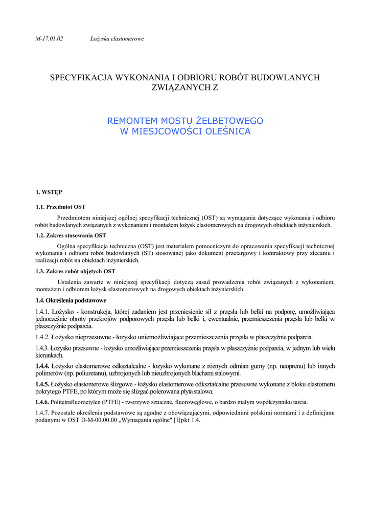 M-17.01.02 Łożyska elastomerowe SPECYFIKACJA WYKONANIA I ODBIORU ROBÓT BUDOWLANYCH ZWIĄZANYCH Z REMONTEM MOSTU ŻELBETOWEGO W MIESJCOWOŚCI OLEŚNICA 1. WSTĘP 1.1. Przedmiot OST Przedmiotem niniejszej ogólnej specyfikacji technicznej (OST) są wymagania dotyczące wykonania i odbioru robót budowlanych związanych z wykonaniem i montażem łożysk elastomerowych na drogowych obiektach inżynierskich. 1.2. Zakres stosowania OST Ogólna specyfikacja techniczna (OST) jest materiałem pomocniczym do opracowania specyfikacji technicznej wykonania i odbioru robót budowlanych (ST) stosowanej jako dokument przetargowy i kontraktowy przy zlecaniu i realizacji robót na obiektach inżynierskich. 1.3. Zakres robót objętych OST Ustalenia zawarte w niniejszej specyfikacji dotyczą zasad prowadzenia robót związanych z wykonaniem, montażem i odbiorem łożysk elastomerowych na drogowych obiektach inżynierskich. 1.4. Określenia podstawowe 1.4.1. Łożysko - konstrukcja, której zadaniem jest przeniesienie sił z przęsła lub belki na podporę, umożliwiająca jednocześnie obroty przekrojów podporowych przęsła lub belki i, ewentualnie, przemieszczenia przęsła lub belki w płaszczyźnie podparcia. 1.4.2. Łożysko nieprzesuwne - łożysko uniemożliwiające przemieszczenia przęsła w płaszczyźnie podparcia. 1.4.3. Łożysko przesuwne - łożysko umożliwiające przemieszczenia przęsła w płaszczyźnie podparcia, w jednym lub wielu kierunkach. 1.4.4. Łożysko elastomerowe odkształcalne - łożysko wykonane z różnych odmian gumy (np. neoprenu) lub innych polimerów (np. poliuretanu), uzbrojonych lub nieuzbrojonych blachami stalowymi. 1.4.5. Łożysko elastomerowe ślizgowe - łożysko elastomerowe odkształcalne przesuwne wykonane z bloku elastomeru pokrytego PTFE, po którym może się ślizgać polerowana płyta stalowa. 1.4.6. Politetrafluoroetylen (PTFE) - tworzywo sztuczne, fluorowęglowe, o bardzo małym współczynniku tarcia. 1.4.7. Pozostałe określenia podstawowe są zgodne z obowiązującymi, odpowiednimi polskimi normami i z definicjami podanymi w OST D-M-00.00.00 „Wymagania ogólne" [l]pkt 1.4. Łożvska elastomerowe M-17.01.02 1.5. Ogólne wymagania dotyczące robót Ogólne wymagania dotyczące robót podano w OST D-M-00.00.00 „Wymagania ogólne" [1], pkt 1.5. 2. MATERIAŁY 2.1. Ogólne wymagania dotyczące materiałów Ogólne wymagania dotyczące materiałów, ich pozyskiwania i składowania, podano w OST D-M-00.00.00 „Wymagania ogólne" [1] pkt 2. 2.2. Materiały do wykonania robót 2.2.1. Zgodność materiałów z dokumentacją projektową Materiały do wykonania robót powinny być zgodne z ustaleniami dokumentacji projektowej lub ST. Dla wszystkich zastosowanych materiałów Wykonawca przedstawi Polską Normę lub aktualną aprobatę techniczną wydaną przez IBDiM. Wykonawca dostarczy Inżynierowi zaświadczenia producenta, potwierdzające spełnienie przez zastosowane łożyska wymaganych właściwości oraz trwałości, a także wyniki przeprowadzonych badań. Jeżeli ST i dokumentacja projektowa nie podają inaczej, można stosować łożyska spełniające wymagania podane poniżej. 2.2.2. Materiały do wykonania łożysk 2.2.2. l. Blachy stalowe zbrojenia łożysk elastomerowych Blachy wewnętrzne zbrojenia powinny być wykonane ze stali podwyższonej wytrzymałości lub równoważnej, której wydłużenie as >18%. Blachy zewnętrzne zbrojenia mogą być wykonane ze stali zwykłej jakości, której wydłużenie a5 >18%. Stal powinna spełniać wymagania Polskiej Normy lub aprobaty technicznej. Minimalna grubość blach wewnętrznych zbrojenia powinna wynosić 2 mm. Blachy wewnętrzne powinny być pozbawione ostrych krawędzi. Należy stosować tylko takie metody wycinania blach, które nie dają skaz, zadziorów i szorstkich krawędzi. Jeżeli warstwy wewnętrzne elastomeru mają grubość < 8 mm to minimalna grubość blach zewnętrznych powinna wynosić 15 mm, a w przypadku warstw grubszych 20 mm. 2.2.2.2. Elastomer Elastomer stosowany do wyrobu łożysk powinien być wyprodukowany z kauczuku naturalnego, chloroprenowego ewentualnie z poliuretanu. Zawartość kauczuku naturalnego lub chloroprenowego w mieszance powinna wynosić co najmniej: 60% w łożyskach, których G=0,7 MPa, 55% w łożyskach, których G=0,9 MPa, 50% w łożyskach, których G=l,15 MPa, gdzie G - moduł odkształcenia postaciowego. M-17.01.02 Łożyska elastomerowe Elastomery na bazie kauczuku powinny mieć twardość od 50°Sh A do 70° Sh A, na bazie poliuretanów twardość od 60° Sh A do 80° Sh A. Twardość powinna być określona wg metody Shore'a A zgodnie z PN-80/C04238 [12]. Zaleca się stosować do łożysk elastomer o twardości (60±5)°Sh A, zapewniający moduł odkształcenia postaciowego G=(0,9 ± 0,15) MPa. Do produkcji łożysk nie można stosować żadnych odpadów gumowych lub gumy z odzysku. Elastomer powinien charakteryzować się dobrą odpornością na działanie zmiennych warunków atmosferycznych, ozonu, promieniowania ultrafioletowego, olejów, smaru, benzyny, soli oraz ekstremalnych temperatur, w których eksploatowane jest łożysko (od -35° C do +50°C). Parametry fizyczno-mechaniczne elastomeru o twardości 60° Sh A powinny spełniać wymagania podane w tablicy l. Tablica l. Właściwości fizyczno-mechaniczne elastomeru o twardości 60° Sh A Lp. Cecha Według normy 1 Moduł odkształcenia postaciowego Wytrzymałość na rozciąganie: próbki formowane - próbki wycinane Wydłużenie przy zerwaniu: próbki formowane - próbki wycinane Odkształcenie trwałe po 24 h w temp. 70°C PN-93/C-04210[2] 2 3 4 5 Wytrzymałość na rozdzieranie 6 Odporność na starzenie: maksymalna zmiana wartości pierwotnej : - twardość wytrzymałość na rozciąganie wydłużenie przy zerwaniu 7 PN-93/C-04205 [3] PN-80/C-04246 [4], PN-54/C-04253 [5] PN-80/C-04290 [6] PN-86/C-04254 [7] JedKauczuk Poliuretan nostka 0,9±0,15 MPa 1,2+0,15 MPa - >20 % >425 >375 >3