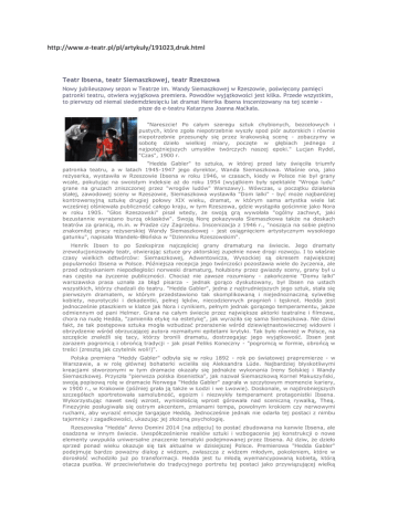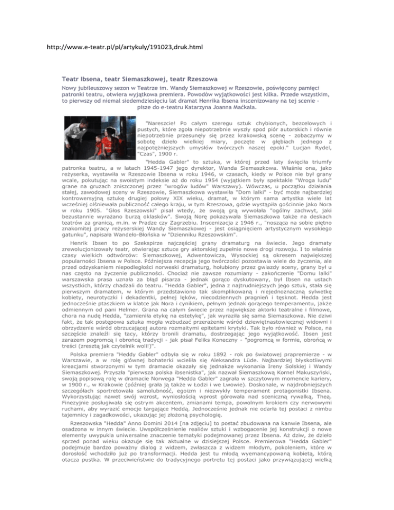 http://www.e-teatr.pl/pl/artykuly/191023,druk.html Teatr Ibsena, teatr Siemaszkowej, teatr Rzeszowa Nowy jubileuszowy sezon w Teatrze im. Wandy Siemaszkowej w Rzeszowie, poświęcony pamięci patronki teatru, otwiera wyjątkowa premiera. Powodów wyjątkowości jest kilka. Przede wszystkim, to pierwszy od niemal siedemdziesięciu lat dramat Henrika Ibsena inscenizowany na tej scenie pisze do e-teatru Katarzyna Joanna Maćkała. "Nareszcie! Po całym szeregu sztuk chybionych, bezcelowych i pustych, które zgoła niepotrzebnie wyszły spod piór autorskich i równie niepotrzebnie przesunęły się przez krakowską scenę - zobaczymy w sobotę dzieło wielkiej miary, poczęte w głębiach jednego z najpotężniejszych umysłów twórczych naszej epoki." Lucjan Rydel, "Czas", 1900 r. "Hedda Gabler" to sztuka, w której przed laty święciła triumfy patronka teatru, a w latach 1945-1947 jego dyrektor, Wanda Siemaszkowa. Właśnie ona, jako reżyserka, wystawiła w Rzeszowie Ibsena w roku 1946, w czasach, kiedy w Polsce nie był grany wcale, pokutując na swoistym indeksie aż do roku 1954 (wyjątkiem były spektakle "Wroga ludu" grane na gruzach zniszczonej przez "wrogów ludów" Warszawy). Wówczas, u początku działania stałej, zawodowej sceny w Rzeszowie, Siemaszkowa wystawiła "Dom lalki" - być może najbardziej kontrowersyjną sztukę drugiej połowy XIX wieku, dramat, w którym sama artystka wiele lat wcześniej olśniewała publiczność całego kraju, w tym Rzeszowa, gdzie wystąpiła gościnnie jako Nora w roku 1905. "Głos Rzeszowski" pisał wtedy, że swoją grą wywołała "ogólny zachwyt, jaki bezustannie wyrażano burzą oklasków". Swoją Norę pokazywała Siemaszkowa także na deskach teatrów za granicą, m.in. w Pradze czy Zagrzebiu. Inscenizacja z 1946 r., "nosząca na sobie piętno znakomitej pracy reżyserskiej Wandy Siemaszkowej - jest osiągnięciem artystycznym wysokiego gatunku", napisała Wandeło-Błońska w "Dzienniku Rzeszowskim". Henrik Ibsen to po Szekspirze najczęściej grany dramaturg na świecie. Jego dramaty zrewolucjonizowały teatr, otwierając sztuce gry aktorskiej zupełnie nowe drogi rozwoju. I to właśnie czasy wielkich odtwórców: Siemaszkowej, Adwentowicza, Wysockiej są okresem największej popularności Ibsena w Polsce. Późniejsza recepcja jego twórczości pozostawia wiele do życzenia, ale przed odzyskaniem niepodległości norweski dramaturg, hołubiony przez gwiazdy sceny, grany był u nas często na życzenie publiczności. Chociaż nie zawsze rozumiany - zakończenie "Domu lalki" warszawska prasa uznała za błąd pisarza - jednak gorąco dyskutowany, był Ibsen na ustach wszystkich, którzy chadzali do teatru. "Hedda Gabler", jedna z najtrudniejszych jego sztuk, stała się pierwszym dramatem, w którym przedstawiono tak skomplikowaną i niejednoznaczną sylwetkę kobiety, neurotyczki i dekadentki, pełnej lęków, niecodziennych pragnień i tęsknot. Hedda jest jednocześnie ptaszkiem w klatce jak Nora i cynikiem, pełnym jednak gorącego temperamentu, jakże odmiennym od pani Helmer. Grana na całym świecie przez największe aktorki teatralne i filmowe, chora na nudę Hedda, "zamieniła etykę na estetykę", jak wyraziła się sama Siemaszkowa. Nie dziwi fakt, że tak postępowa sztuka mogła wzbudzać przerażenie wśród dziewiętnastowiecznej widowni i obrzydzenie wśród obrzucającej autora rozmaitymi epitetami krytyki. Tak było również w Polsce, na szczęście znaleźli się tacy, którzy bronili dramatu, dostrzegając jego wyjątkowość. Ibsen jest zarazem pogromcą i obrońcą tradycji - jak pisał Feliks Koneczny - "pogromcą w formie, obrońcą w treści (zresztą jak czytelnik woli!)". Polska premiera "Heddy Gabler" odbyła się w roku 1892 - rok po światowej prapremierze - w Warszawie, a w rolę głównej bohaterki wcieliła się Aleksandra Lüde. Najbardziej błyskotliwymi kreacjami stworzonymi w tym dramacie okazały się jednakże wykonania Ireny Solskiej i Wandy Siemaszkowej. Przyszła "pierwsza polska ibsenistka", jak nazwał Siemaszkową Kornel Makuszyński, swoją popisową rolę w dramacie Norwega "Hedda Gabler" zagrała w szczytowym momencie kariery, w 1900 r., w Krakowie (później grała ją także w Łodzi i we Lwowie). Doskonale, w najdrobniejszych szczegółach sportretowała samolubność, egoizm i niezwykły temperament protagonistki Ibsena. Wykorzystując nawet swój wzrost, wyniosłością wprost górowała nad sceniczną rywalką, Theą. Finezyjnie posługiwała się ostrym akcentem, zmianami tempa, powolnym krokiem czy nerwowymi ruchami, aby wyrazić emocje targające Heddą. Jednocześnie jednak nie odarła tej postaci z nimbu tajemnicy i zagadkowości, ukazując jej złożoną psychologię. Rzeszowska "Hedda" Anno Domini 2014 [na zdjęciu] to postać zbudowana na kanwie Ibsena, ale osadzona w innym świecie. Uwspółcześnienie realiów sztuki i wzbogacenie jej konstrukcji o nowe elementy uwypukla uniwersalne znaczenie tematyki podejmowanej przez Ibsena. Aż dziw, że dzieło sprzed ponad wieku okazuje się tak aktualne w dzisiejszej Polsce. Premierowa "Hedda Gabler" podejmuje bardzo poważny dialog z widzem, zwłaszcza z widzem młodym, pokoleniem, które w dorosłość wchodziło już po transformacji. Hedda jest tu młodą wyemancypowaną kobietą, którą otacza pustka. W przeciwieństwie do tradycyjnego portretu tej postaci jako przywiązującej wielką wagę do kwestii materialnych i zewnętrznych, mamy tu do czynienia z wręcz abnegatką. Już sama scenografia jest pozbawiona wszelkiej ornamentyki: białe, czyste ściany, kafelki, lustra, meble owinięte folią wskazują raczej na fobie niż pragnienie otaczania się pięknymi, drogimi przedmiotami. Sama Hedda występuje przez sporą część sztuki w negliżu albo "stroju niedbałym". To raczej Tesman dba o stosowny wygląd, a jego żona jakby dusi się w kostiumie małżonki i mieszkanki pięknego nowoczesnego apartamentu w zrewita