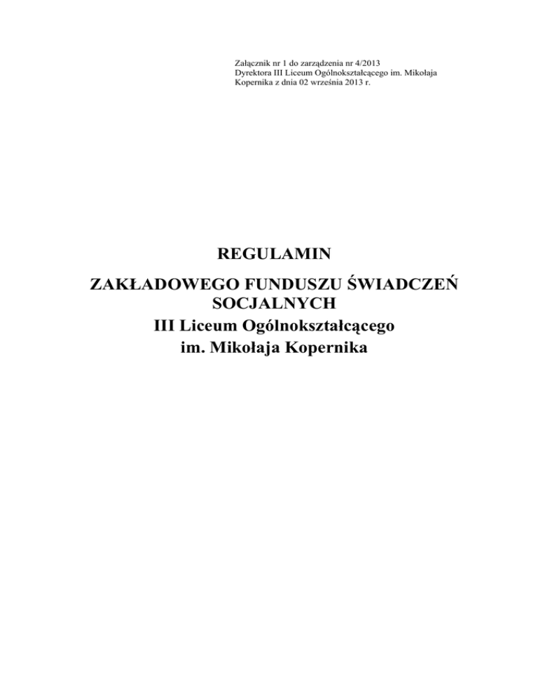 Załącznik nr 1 do zarządzenia nr 4/2013 Dyrektora III Liceum Ogólnokształcącego im. Mikołaja Kopernika z dnia 02 września 2013 r. REGULAMIN ZAKŁADOWEGO FUNDUSZU ŚWIADCZEŃ SOCJALNYCH III Liceum Ogólnokształcącego im. Mikołaja Kopernika Podstawy prawne Regulamin Zakładowego Funduszu Świadczeń Socjalnych, zwany dalej regulaminem opracowany został na podstawie: 1. Ustawy z 4 marca 1994 r. o zakładowym funduszu świadczeń socjalnych (Dz.U. Nr 43, poz. 163 z późn.zm.), 2. Ustawy z 23 maja 1991 r. o związkach zawodowych (j.t. Dz. U z 2001 r. Nr 79, poz. 854 z późn. zm), 3. Ustawy z 26 stycznia 1982 r. – Karta nauczyciela (j.t. Dz. U. z 2006 r. Nr 97, poz.674 z późn.zm.), 4. Ustawy z dnia 26 czerwca 1974r. – Kodeks Pracy (j.t. Dz.U. z 1998 r. Nr 21 poz.94 z późn.zm.), 5. Ustawa z 19 grudnia 2008 r. o emeryturach pomostowych (Dz.U. z 2008 r. Nr 237, poz. 1656) 6. Rozporządzenie Ministra Pracy i Polityki Społecznej z 9 marca 2009 r. w sprawie sposobu ustalania przeciętnej liczby zatrudnionych w celu naliczania odpisu na zakładowy fundusz świadczeń socjalnych (Dz.U. Nr 43, poz. 349 z poźn.zm.) 2 Postanowienia ogólne §1 1. Regulamin określa zasady przyznawania środków z Zakładowego Funduszu Świadczeń Socjalnych zwanego dalej Funduszem, na poszczególne cele, rodzaje i formy działalności socjalnej oraz zasady i warunki korzystania z usług i świadczeń finansowych z Funduszu. 2. Podstawę podziału Funduszu na poszczególne cele i rodzaje działalności socjalnej stanowi roczny plan finansowy, a podstawę i zasady gospodarowania środkami Funduszu stanowią poniższe postanowienia i pozostałe załączniki, będące częścią składową regulaminu zakładowego funduszu świadczeń socjalnych. 3. Dyrektor Szkoły w uzgodnieniu ze związkami zawodowymi opracowuje w I kwartale roku plan finansowy Funduszu. 4. Środki Funduszu nie mogą być wykorzystane na inne niż zawarte w regulaminie cele, a zobowiązania Funduszu nie mogą przekraczać zgromadzonych na rachunku bankowym środków. 5. Środki Funduszu nie wykorzystane w danym roku kalendarzowym przechodzą na rok następny. Tworzenie funduszu §2 1. Fundusz dla pracowników administracji i obsługi tworzy się z corocznego odpisu podstawowego, naliczonego w stosunku do przeciętnej liczby zatrudnionych (art.5 ust.1 ustawy o ZFŚS). Podstawą do wyliczenia kwoty odpisu jest przeciętne wynagrodzenie miesięczne w gospodarce narodowej w roku poprzednim lub w drugim półroczu roku poprzedniego, jeżeli przeciętne wynagrodzenie z tego okresu stanowiło kwotę wyższą. 2. Dla nauczycieli dokonuje się corocznie odpisu na Fundusz w wysokości ustalanej, jako iloczyn planowanej, przeciętnej w danym roku kalendarzowym, liczby nauczycieli zatrudnionych w pełnym i niepełnym wymiarze zajęć (po przeliczeniu na 3 pełny wymiar zajęć) skorygowanej w końcu roku do faktycznej przeciętnej liczby zatrudnionych nauczycieli (po przeliczeniu na pełny wymiar zajęć) i 110 % kwoty bazowej, o której mowa w art. 30 ust. 3, obowiązującej w dniu 1 stycznia danego roku (art.53 ustawy KN). 3. Dla nauczycieli będących emerytami, rencistami lub nauczycielami pobierającymi nauczycielskie świadczenie kompensacyjne dokonuje się odpisu na zakładowy fundusz świadczeń socjalnych w wysokości 5 % pobieranych przez nich emerytur, rent oraz nauczycielskich świadczeń kompensacyjnych. (art.53 ust.2 ustawy KN) 4. Dla nauczycieli będących emerytami i rencistami dokonuje się odpisu na Fundusz w wysokości zgodnej z art. 53 ust. 2 Karty Nauczyciela. W celu ustalenia wysokości odpisu corocznie podają oni wysokość brutto swoich emerytur i rent. 5. Dla pozostałych pracowników, emerytów i rencistów, odpis na Fundusz może zostać zwiększony o 6,25 % przeciętnego wynagrodzenia miesięcznego w gospodarce narodowej w roku poprzednim lub w II półroczu roku poprzedniego, jeżeli przeciętne wynagrodzenie z tego okresu stanowiło kwotę wyższą na każdego emeryta i rencistę uprawnionego do tej opieki. 6. 5. Środki Funduszu mogą być zwiększone o: • wpływy z opłat osób i instytucji korzystających z działalności socjalnej, • darowizny i zapisy osób fizycznych i prawnych, • inne środki określone w odrębnych przepisach. • wpływy z oprocentowania pożyczek udzielanych na cele mieszkaniowe. • odsetki od środków Funduszu zgromadzonych na rachunku bankowym. Równowartość dokonywanych odpisów przekazywana jest na rachunek bankowy Funduszu w terminie do 30 września danego roku, z tym, że w terminie do 31 maja przekazywana jest kwota stanowiąca 75% równowartości odpisów. Przeznaczenie funduszu §3 Środki Funduszu przeznacza się w szczególności na: 1. Wypłatę świadczenia urlopowego dla pracowników pedagogicznych. 4 2. Dofinansowanie wypoczynku pracowników uprawnionych do urlopu wypoczynkowego. 3. Dofinansowanie zorganizowanego wypoczynku dzieci (obozy, kolonie) osób uprawnionych do korzystania z Funduszu za okazaniem faktury, dowodu wpłaty (raz w roku). 4. Pomoc rzeczową (świadczenie rzeczowe) lub finansową dla osób w trudnej sytuacji życiowej, materialnej. 5. Zapomogi finansowe dla osób dotkniętych: - wypadkiem losowym (np. pożar mieszkania, kradzież dobytku), wg. potrzeb, - długotrwałą chorobą, (raz w roku), na podstawie zaświadczenia. 6. Działalność kulturalno – oświatową zorganizowaną w postaci imprez kulturalnych i oświatowych oraz dofinansowania do zakupu biletów na te imprezy. 7. Działalność turystyczno, sportowo – rekreacyjną organizowaną w postaci różnych ogólnodostępnych form rekreacji - dofinansowanie do wycieczek, biletów wstępu (według potrzeb i posiadanych środków). 8. Imprezy choinkowe dla dzieci do ukończenia 14 lat połączone z zakupem paczek okolicznościowych (raz w roku). 9. Pożyczki zwrotne na cele mieszkaniowe. Zasady i warunki przyznawania świadczeń socjalnych §4 1. Przyznanie świadczeń oraz wysokości do