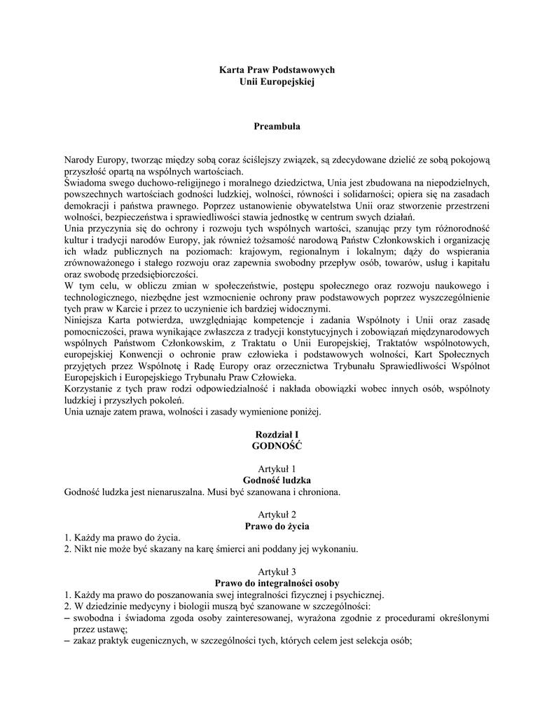 Karta Praw Podstawowych Unii Europejskiej Preambuła Narody Europy, tworząc między sobą coraz ściślejszy związek, są zdecydowane dzielić ze sobą pokojową przyszłość opartą na wspólnych wartościach. Świadoma swego duchowo-religijnego i moralnego dziedzictwa, Unia jest zbudowana na niepodzielnych, powszechnych wartościach godności ludzkiej, wolności, równości i solidarności; opiera się na zasadach demokracji i państwa prawnego. Poprzez ustanowienie obywatelstwa Unii oraz stworzenie przestrzeni wolności, bezpieczeństwa i sprawiedliwości stawia jednostkę w centrum swych działań. Unia przyczynia się do ochrony i rozwoju tych wspólnych wartości, szanując przy tym różnorodność kultur i tradycji narodów Europy, jak również tożsamość narodową Państw Członkowskich i organizację ich władz publicznych na poziomach: krajowym, regionalnym i lokalnym; dąży do wspierania zrównoważonego i stałego rozwoju oraz zapewnia swobodny przepływ osób, towarów, usług i kapitału oraz swobodę przedsiębiorczości. W tym celu, w obliczu zmian w społeczeństwie, postępu społecznego oraz rozwoju naukowego i technologicznego, niezbędne jest wzmocnienie ochrony praw podstawowych poprzez wyszczególnienie tych praw w Karcie i przez to uczynienie ich bardziej widocznymi. Niniejsza Karta potwierdza, uwzględniając kompetencje i zadania Wspólnoty i Unii oraz zasadę pomocniczości, prawa wynikające zwłaszcza z tradycji konstytucyjnych i zobowiązań międzynarodowych wspólnych Państwom Członkowskim, z Traktatu o Unii Europejskiej, Traktatów wspólnotowych, europejskiej Konwencji o ochronie praw człowieka i podstawowych wolności, Kart Społecznych przyjętych przez Wspólnotę i Radę Europy oraz orzecznictwa Trybunału Sprawiedliwości Wspólnot Europejskich i Europejskiego Trybunału Praw Człowieka. Korzystanie z tych praw rodzi odpowiedzialność i nakłada obowiązki wobec innych osób, wspólnoty ludzkiej i przyszłych pokoleń. Unia uznaje zatem prawa, wolności i zasady wymienione poniżej. Rozdział I GODNOŚĆ Artykuł 1 Godność ludzka Godność ludzka jest nienaruszalna. Musi być szanowana i chroniona. Artykuł 2 Prawo do życia 1. Każdy ma prawo do życia. 2. Nikt nie może być skazany na karę śmierci ani poddany jej wykonaniu. Artykuł 3 Prawo do integralności osoby 1. Każdy ma prawo do poszanowania swej integralności fizycznej i psychicznej. 2. W dziedzinie medycyny i biologii muszą być szanowane w szczególności: – swobodna i świadoma zgoda osoby zainteresowanej, wyrażona zgodnie z procedurami określonymi przez ustawę; – zakaz praktyk eugenicznych, w szczególności tych, których celem jest selekcja osób; – zakaz wykorzystywania ciała ludzkiego i jego poszczególnych części jako źródła zysku; – zakaz reprodukcyjnego klonowania istot ludzkich. Artykuł 4 Zakaz tortur i nieludzkiego lub poniżającego traktowania albo karania Nikt nie może być poddany torturom ani nieludzkiemu lub poniżającemu traktowaniu albo karaniu. Artykuł 5 Zakaz niewolnictwa i pracy przymusowej 1. Nikt nie może być trzymany w niewoli lub w poddaństwie. 2. Nikt nie może być zmuszony do świadczenia pracy przymusowej lub obowiązkowej. 3. Handel ludźmi jest zakazany. Rozdział II WOLNOŚCI Artykuł 6 Prawo do wolności i bezpieczeństwa Każdy ma prawo do wolności i bezpieczeństwa osobistego. Artykuł 7 Poszanowanie życia prywatnego i rodzinnego Każdy ma prawo do poszanowania swego życia prywatnego i rodzinnego, domu i komunikowania się. Artykuł 8 Ochrona danych osobowych 1. Każdy ma prawo do ochrony danych osobowych, które go dotyczą. 2. Dane te muszą być przetwarzane rzetelnie w określonych celach i za zgodą osoby zainteresowanej lub na innej uzasadnionej podstawie przewidzianej ustawą. Każdy ma prawo dostępu do zebranych danych, które go dotyczą i prawo do spowodowania ich sprostowania. 3. Przestrzeganie tych zasad podlega kontroli niezależnego organu. Artykuł 9 Prawo do zawarcia małżeństwa i prawo do założenia rodziny Prawo do zawarcia małżeństwa i prawo do założenia rodziny są gwarantowane zgodnie z ustawami krajowymi regulującymi korzystanie z tych praw. Artykuł 10 Wolność myśli, sumienia i religii 1. Każdy ma prawo do wolności myśli, sumienia i religii. Prawo to obejmuje wolność zmiany religii lub światopoglądu oraz wolność uzewnętrzniania, indywidualnie lub wspólnie z innymi, publicznie lub prywatnie, swej religii lub światopoglądu poprzez uprawianie kultu, nauczanie, praktykowanie i uczestniczenie w obrzędach. 2. Uznaje się prawo do odmowy służby wojskowej ze względów sumienia, zgodnie z ustawami krajowymi regulującymi korzystanie z tego prawa. Artykuł 11 Wolność wypowiedzi i informacji 1. Każdy ma prawo do wolności wypowiedzi. Prawo to obejmuje wolność posiadania poglądów oraz otrzymywania i przekazywania informacji i idei bez ingerencji władz publicznych i bez względu na granice państwowe. 2. Szanuje się wolność i pluralizm mediów. Artykuł 12 Wolność gromadzenia się i stowarzyszania się 1. Każdy ma prawo do swobodnego, pokojowego gromadzenia się i swobodnego stowarzyszania się na wszystkich poziomach, zwłaszcza w sprawach politycznych, związkowych i obywatelskich, z którego wynika prawo każdego do tworzenia związków zawodowych i przystępowania do nich dla obrony swoich interesów. 2. Partie polityczne na poziomie Unii przyczyniają się do wyrażania woli politycznej jej obywateli. Artykuł 13 Wolność sztuk i nauk Sztuki i badania naukowe są wolne od ograniczeń. Wolność akademicka jest szanowana. Artykuł 14 Prawo do nauki 1. Każdy ma prawo do nauki i dostępu do kształcenia zawodowego i ustawicznego. 2. Prawo to obejmuje możliwość korzystania z bezpłatnej nauki obowiązkowej. 3. Wolność tworzenia, z właściwym poszanowaniem zasad demokratycznych, instytucji oświatowych i prawo rodziców do zapewnienia wychowania 