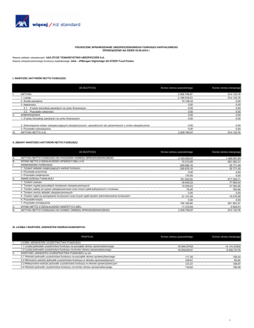 PÓŁROCZNE SPRAWOZDANIE UBEZPIECZENIOWEGO FUNDUSZU KAPITAŁOWEGO SPORZĄDZONE NA DZIEŃ 30.06.2016 r. Nazwa zakładu ubezpieczeń: AXA ŻYCIE TOWARZYSTWO UBEZPIECZEŃ S.A. Nazwa ubezpieczeniowego funduszu kapitałowego: AXA - JPMorgan Highbridge US STEEP Fund Polska I. WARTOŚĆ AKTYWÓW NETTO FUNDUSZU (W ZŁOTYCH) I. Koniec okresu poprzedniego Koniec okresu bieżącego AKTYWA 2 208 746,87 914 130,78 1. Lokaty 2. Środki pieniężne 3. Należności 2 198 618,53 10 128,34 0,00 914 130,78 0,00 0,00 0,00 0,00 0,00 0,00 0,00 0,00 0,00 0,00 0,00 0,00 2 208 746,87 0,00 0,00 914 130,78 Koniec okresu poprzedniego Koniec okresu bieżącego 2 123 520,57 74 013,66 255 849,18 1 499 557,60 -581 583,31 35 771,40 255 679,18 0,00 170,00 181 835,52 35 630,22 15 839,02 35 771,40 0,00 0,00 617 354,71 77 662,04 27 092,86 79,28 0,00 765,86 0,00 21 121,94 0,00 10 270,58 0,00 109 165,06 11 212,64 501 563,37 -3 843,51 2 208 746,87 914 130,78 Koniec okresu poprzedniego Koniec okresu bieżącego 18 094,07435 18 939,69191 14 141,43342 8 426,72176 117,36 106,04 109,91 121,07 116,62 89,26 109,97 108,48 3.1. Z tytułu transakcji zawartych na rynku finansowym 3.2. Pozostałe należności II. III. ZOBOWIĄZANIA 1. Z tytułu transakcji zawartych na rynku finansowym 2. Zobowiązania wobec ubezpieczających,ubezpieczonych, uposażonych lub uprawnionych z umów ubezpieczenia 3. Pozostałe zobowiązania AKTYWA NETTO (I-II) II. ZMIANY WARTOŚCI AKTYWÓW NETTO FUNDUSZU (W ZŁOTYCH) A. AKTYWA NETTO FUNDUSZU NA POCZĄTEK OKRESU SPRAWOZDAWCZEGO B. I. WYNIK NETTO Z DZIAŁALNOŚCI OPERACYJNEJ (I-II) ZWIĘKSZENIA FUNDUSZU 1. Tytułem składek zwiększających wartość funduszu 2. Pozostałe przychody 3. Pozostałe zwiększenia ZMNIEJSZENIA FUNDUSZU II. 1. Tytułem wykupu 2. Tytułem wypłat pozostałych świadczeń ubezpieczeniowych 3. Tytułem opłaty za ryzyko ubezpieczeniowe oraz innych opłat potrącanych z funduszu 4. Tytułem zwrotu składek ubezpieczeniowych 5. Tytułem opłat za zarządzanie funduszem oraz innych opłat tytułem administrowania funduszem 6. Pozostałe koszty 7. Pozostałe zmniejszenia C. WYNIK NETTO Z DZIAŁALNOŚCI INWESTYCYJNEJ D. AKTYWA NETTO FUNDUSZU NA KONIEC OKRESU SPRAWOZDAWCZEGO III. LICZBA I WARTOŚĆ JEDNOSTEK ROZRACHUNKOWYCH POZYCJA 1. LICZBA JEDNOSTEK UCZESTNICTWA FUNDUSZU 1.1 Liczba jednostek uczestnictwa funduszu na początek okresu sprawozdawczego 1.2 Liczba jednostek uczestnictwa funduszu na koniec okresu sprawozdawczego 2. WARTOŚĆ JEDNOSTKI UCZESTNICTWA FUNDUSZU (w zł): 2.1 Wartość jednostki uczestnictwa funduszu na początek okresu sprawozdawczego 2.2 Minimalna wartość jednostki uczestnictwa funduszu w okresie sprawozdawczym 2.3 Maksymalna wartość jednostki uczestnictwa funduszu w okresie sprawozdawczym 2.4 Wartość jednostki uczestnictwa funduszu na koniec okresu sprawozdawczego 1 IV. ZESTAWIENIE AKTYWÓW NETTO FUNDUSZU LOKATY I. LOKATY (SUMA 1-12) 1. Papiery wartościowe emitowane, poręczone lub gwarantowane przez Skarb Państwa lub organizacje międzynarodowe, których członkiem jest Rzeczpospolita Polska 2. Obligacje emitowane lub poręczone przez jednostki samorządu terytorialnego lub związki jednostek samorządu terytorialnego 3. Inne dłużne papiery wartościowe o stałej stopie dochodu 4. Akcje 5. Udziały 6. Jednostki uczestnictwa i certyfikaty inwestycyjne w funduszach inwestycyjnych 7. Instrumenty pochodne 8. Inne papiery wartościowe o zmiennej kwocie dochodu 9. Pożyczki 10. Nieruchomości 11. Depozyty bankowe 12. Pozostałe lokaty II. III. IV. V. ŚRODKI PIENIĘŻNE NALEŻNOŚCI ZOBOWIĄZANIA AKTYWA NETTO ( W TYM ) 1. Krajowe 2. Zagraniczne - kraje UE 3. Zagraniczne - kraje poza UE Wartość bilansowa (w zł) Udział w aktywach netto funduszu (w %) 914 130,78 100,00% 0,00 0,00% 0,00 0,00% 0,00 0,00 0,00 0,00% 0,00% 0,00% 914 130,78 0,00 0,00 100,00% 0,00% 0,00% 0,00 0,00 0,00 0,00 0,00% 0,00% 0,00% 0,00% 0,00 0,00 0,00 914 130,78 914 130,78 0,00 0,00% 0,00% 0,00% 100,00% 100,00% 0,00% 0,00 0,00% Warszawa, 9 sierpnia 2016 2