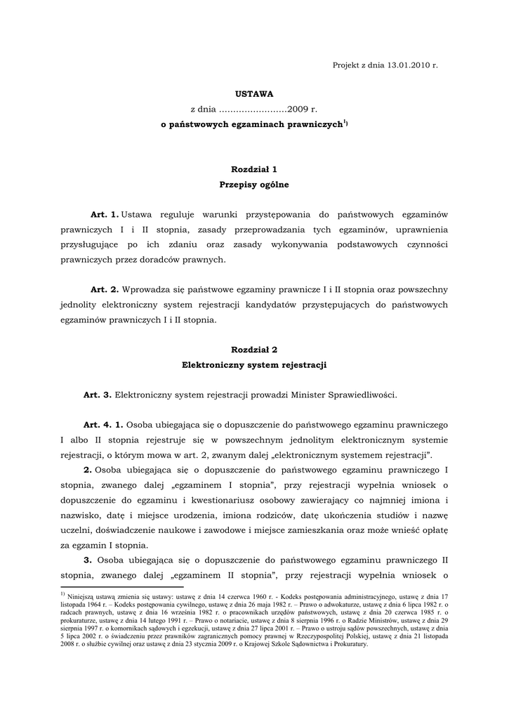 Projekt z dnia 13.01.2010 r. USTAWA z dnia ……………………2009 r. o państwowych egzaminach prawniczych1) Rozdział 1 Przepisy ogólne Art. 1. Ustawa reguluje warunki przystępowania do państwowych egzaminów prawniczych I i II stopnia, zasady przeprowadzania tych egzaminów, uprawnienia przysługujące po ich zdaniu oraz zasady wykonywania podstawowych czynności prawniczych przez doradców prawnych. Art. 2. Wprowadza się państwowe egzaminy prawnicze I i II stopnia oraz powszechny jednolity elektroniczny system rejestracji kandydatów przystępujących do państwowych egzaminów prawniczych I i II stopnia. Rozdział 2 Elektroniczny system rejestracji Art. 3. Elektroniczny system rejestracji prowadzi Minister Sprawiedliwości. Art. 4. 1. Osoba ubiegająca się o dopuszczenie do państwowego egzaminu prawniczego I albo II stopnia rejestruje się w powszechnym jednolitym elektronicznym systemie rejestracji, o którym mowa w art. 2, zwanym dalej „elektronicznym systemem rejestracji”. 2. Osoba ubiegająca się o dopuszczenie do państwowego egzaminu prawniczego I stopnia, zwanego dalej „egzaminem I stopnia”, przy rejestracji wypełnia wniosek o dopuszczenie do egzaminu i kwestionariusz osobowy zawierający co najmniej imiona i nazwisko, datę i miejsce urodzenia, imiona rodziców, datę ukończenia studiów i nazwę uczelni, doświadczenie naukowe i zawodowe i miejsce zamieszkania oraz moŜe wnieść opłatę za egzamin I stopnia. 3. Osoba ubiegająca się o dopuszczenie do państwowego egzaminu prawniczego II stopnia, zwanego dalej „egzaminem II stopnia”, przy rejestracji wypełnia wniosek o 1) Niniejszą ustawą zmienia się ustawy: ustawę z dnia 14 czerwca 1960 r. - Kodeks postępowania administracyjnego, ustawę z dnia 17 listopada 1964 r. – Kodeks postępowania cywilnego, ustawę z dnia 26 maja 1982 r. – Prawo o adwokaturze, ustawę z dnia 6 lipca 1982 r. o radcach prawnych, ustawę z dnia 16 września 1982 r. o pracownikach urzędów państwowych, ustawę z dnia 20 czerwca 1985 r. o prokuraturze, ustawę z dnia 14 lutego 1991 r. – Prawo o notariacie, ustawę z dnia 8 sierpnia 1996 r. o Radzie Ministrów, ustawę z dnia 29 sierpnia 1997 r. o komornikach sądowych i egzekucji, ustawę z dnia 27 lipca 2001 r. – Prawo o ustroju sądów powszechnych, ustawę z dnia 5 lipca 2002 r. o świadczeniu przez prawników zagranicznych pomocy prawnej w Rzeczypospolitej Polskiej, ustawę z dnia 21 listopada 2008 r. o słuŜbie cywilnej oraz ustawę z dnia 23 stycznia 2009 r. o Krajowej Szkole Sądownictwa i Prokuratury. dopuszczenie do egzaminu w zakresie pełnym lub profilowanym i kwestionariusz osobowy zawierający co najmniej imiona i nazwisko, datę i miejsce urodzenia, imiona rodziców, datę ukończenia studiów i nazwę uczelni, doświadczenie naukowe i zawodowe i miejsce zamieszkania oraz moŜe wnieść opłatę za egzamin II stopnia. Art. 5. 1. Osoba, która zdała egzamin I stopnia, deklaruje wybór aplikacji. KaŜdy moŜe dokonać wyboru trzech miejsc odbywania aplikacji – bez względu na jej rodzaj - z jednoczesnym wskazaniem kolejności preferowanych miejsc odbywania aplikacji. 2. Deklarację wyboru aplikacji składa się w elektronicznym systemie rejestracji, w terminie wyznaczonym przez Ministra Sprawiedliwości w Biuletynie Informacji Publicznej, o którym mowa w ustawie z dnia 6 września 2001 r. o dostępie do informacji publicznej (Dz. U. Nr 112, poz. 1198, z późn. zm.2)), zwanym dalej „Biuletynem Informacji Publicznej”. 3. Niezwłocznie po zakończeniu składania deklaracji wyboru aplikacji Minister Sprawiedliwości ogłasza w Biuletynie Informacji Publicznej listę osób wstępnie zakwalifikowanych na poszczególne aplikacje oraz informację o wolnych miejscach na aplikacje w poszczególnych izbach adwokackich, okręgowych izbach radców prawnych i izbach notarialnych. O umieszczeniu na liście decyduje liczba punktów uzyskanych z egzaminu I stopnia i liczba miejsc na aplikacje w poszczególnych izbach adwokackich, okręgowych izbach radców prawnych i izbach notarialnych. 4. W terminie 5 dni od dnia ogłoszenia listy osób wstępnie zakwalifikowanych na poszczególne aplikacje, osoby, które nie zostały zakwalifikowane na tej liście, mogą ponownie złoŜyć deklarację wyboru aplikacji z uwzględnieniem wolnych miejsc na aplikacje w poszczególnych izbach adwokackich, okręgowych izbach radców prawnych i izbach notarialnych. Bieg tego terminu rozpoczyna się w dniu następującym po dniu ogłoszenia listy osób wstępnie zakwalifikowanych na poszczególne aplikacje. 5. Przy ponownym składaniu deklaracji wyboru aplikacji wskazuje się jeden rodzaj aplikacji z określeniem miejsca jej odbywania. O kolejności wpisów na listę osób wstępnie zakwalifikowanych na aplikacje w poszczególnych izbach adwokackich, okręgowych izbach radców prawnych i izbach notarialnych decyduje termin złoŜenia deklaracji wyboru aplikacji w elektronicznym systemie rejestracji. 6. JeŜeli w trakcie ponownego składania deklaracji wyboru aplikacji w elektronicznym systemie rejestracji pojawi się informacja, Ŝe na wskazany rodzaj aplikacji brak jest wolnych miejsc, wskazuje się kolejny rodzaj aplikacji ze wskazaniem miejsca jej odbywania. Proces ten moŜna wielokrotnie powtarzać w terminie, o którym mowa w ust. 4, aŜ do uzyskania w elektronicznym systemie informacji potwierdzenia wstępnego zakwalifikowania na wskazany rodzaj aplikacji. 2) Zmiany wymienionej ustawy zostały ogłoszone w Dz. U. z 2002 r. Nr 153, poz. 1271, z 2004 r. Nr 240, poz. 2407 oraz z 2005 r. Nr 64, poz. 565 i Nr 132, poz. 1110. 7. Niezwłocznie po upływie terminu, o którym mowa w ust. 4, Minister Sprawiedliwości ogłasza w Biuletynie Informacji Publicznej ostateczną listę osób wstępnie zakwalifikowanych na poszczególne aplikacje. 8. Ogłoszenia, o których mowa w ust. 3 i 7, zawierają imiona i nazwiska osób zakwalifikowanych na aplikacje w poszczególnych izbach adwok