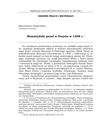 PRZEGLĄD NAUK HISTORYCZNYCH 2014, R. XIII, NR 2 DROBNE PRACE I MATERIAŁY MAŁGORZATA DĄBROWSKA UNIWERSYTET ŁÓDZKI Bizantyński poseł w Paryżu w 1408 r. 1 Do znudzenia powtarzana sentencja, że „książki mają swoje losy” znajduje doskonale odbicie w historii manuskryptu ofiarowanego przez cesarza Manuela II Paleologa opactwu Saint Denis za pośrednictwem Manuela Chrysolorasa w 1408 r. Informację tę cesarski poseł zapisał na karcie księgi zawierającej pisma św. Dionizego. Lepszego prezentu nie mógł przywieźć! Mnisi z Saint Denis utożsamiali św. Dionizego Areopagitę, legendarnego biskupa Aten i towarzysza misji św. Pawła, z pierwszym biskupem Paryża Dionizym, który oddał życie za wiarę w III w., za panowania cesarza Decjusza. Wersję tę upowszechnił w początkach IX w. mnich Hilduin, opat Saint Denis i kapelan Ludwika Pobożnego, tłumacz pism Dionizego Areopagity i promotor jego kultu nad Sekwaną2. Cenny manuskrypt przywieziony przez Chrysolorasa eksponowany jest w Muzeum w Luwrze3. Jego okazała oprawa z kości sło Wydział Filozoficzno-Historyczny, Instytut Historii, Katedra Historii Średniowiecznej. 1 Historię tego poselstwa przedstawiłam 22 X 2014 r. w Zakładzie Studiów Średniowiecznych Instytutu Historii PAN, na seminarium prof. dr hab. Haliny Manikowskiej. Wszystkim uczestnikom dyskusji jestem wdzięczna za cenne pytania i komentarze. 2 T. S t ę p i e ń, Przedmowa do: Pseudo-Dionizy Areopagita. Pisma teologiczne. Hierarchia niebiańska, Imiona boskie, Teologia mistyczna, listy, przeł. z greckiego M. Dzielska, t. I, Kraków 1997, s. 10–11. Dotychczasową atrybucję zakwestionowali jako pierwsi: Laurencjusz Valla i Erazm z Rotterdamu. Współcześni badacze są zdania, że teksty przypisywane Dionizemu powstały na przełomie V i VI w. Odtąd ich autor nazywany jest Pseudo-Dionizym Areopagitą. Ibidem, s. 14. Dziękuję Księdzu Profesorowi Tomaszowi Stępniowi za ważną w tej mierze konsultację. 3 Paris, Musee de Louvre, MS Ivoire A 53 275. 120 MAŁGORZATA DĄBROWSKA niowej przyciąga wzrok, ale dopiero otwarcie księgi pozwala na odkrycie zabytku malarskiego bezcennej wartości. Chodzi o miniaturę przedstawiającą rodzinę cesarską. To tak, jakby przesłać książkę z familijną fotografią. Miniatura ukazuje cesarza Manuela II Paleologa, jego żonę Helenę Dragasz oraz trzech synów: przyszłego Jana VIII, stojącego po prawej stronie ojca, oraz Teodora i Andronika, stojących z lewej strony. Nie ma wśród nich kolejnego potomka, Konstanyna, późniejszego Konstanyna XI, urodzonego w roku 1405, co oznacza, że wysmakowany prezent dyplomatyczny powstał przed tą datą4. Jaką rolę miał odegrać w misji kierowanej wyraźnie do Paryża? Manuel II Paleolog objął władzę w 1392 r. jako 40-letni sukcesor swego ojca, Jana V Paleologa5. Cesarstwo Bizantyńskie liczyło się wówczas raczej z nazwy niż z racji stanu posiadania. Po opanowaniu półwyspu Galipoli w 1356 r., Turcy Osmańscy zagospodarowali znaczną część Tracji, a w 1365 r. zdobyli Adrianopol, który jako Edirne obrali na nową stolicę, usuwając w cień Brusę. Tym samym ich władza znalazła się niejako „za plecami” Konstantynopola, co zapowiadało konfrontację, na którą słabe militarnie cesarstwo nie mogło sobie pozwolić. W 1369 r. Jan V desperacko ruszył do Rzymu z prośbą o wstawiennictwo papiestwa w uzyskaniu pomocy Zachodu. Przed obliczem Urbana V złożył katolickie wyznanie wiary, ale nie ryzykował unii kościelnej, na którą liczył papież. Rezultatem tego połowicznego porozumienia była nadzieja na pomoc najbliższego sąsiada, czyli Węgier. Ludwik Wielki, a jeszcze bardziej jego matka, Elżbieta Łokietkówna, nie zamierzali angażować się w bizantyński problem, mając na względzie sytuację w Polsce, która miała zdecydowanie więcej wspólnego z węgierską racją stanu. Nie uzyskawszy pomocy Zachodu przeciwko Turkom Osmańskim, Bi4 Księgę miałam okazję obejrzeć w Paryżu w 1998 r. dzięki profesorowi Gilbertowi Dagron, którego rekomendacja sprawiła, że pan Jannic Durand, konserwator sztuki średniowiecznej i bizantyńskiej w Luwrze, otworzył dla mnie gablotę z manuskryptem, a następnie pozwolił otworzyć księgę i przyjrzeć się miniaturze. Takie niezwykłe doświadczenie było możliwe tylko w dniu zamkniętym dla zwiedzających. We wdzięcznej pamięci przechowuję uprzejmość obydwu uczonych oraz pani Doroty Giovannoni uczestniczącej w tym spotkaniu z niezwykłym zabytkiem sztuki bizantyńskiej. 5 Niezastąpioną monografią Manuela II Paleologa pozostaje praca J. B a r k e r a, Manuel II Palaeologus 1391–1425. A Study in Late Byzantine Statesmanship 1391–1425, New Brunswick, New Jersey 1969. Praca J. Barkera jest podstawą tego wykładu, toteż nie odnoszę się do niej w każdym szczególe mych wywodów. Bizantyński poseł w Paryżu w 1408 r. 121 zancjum podporządkowało się im w 1372/1373 r.6 Konsekwencją tego kroku było płacenie haraczu sułtanowi, rezydującemu już nie w Brusie, a w Adrianopolu, oraz uczestniczenie w organizowanych przezeń wyprawach wojskowych, co w praktyce oznaczało ekspedycje bratobójcze, jak wyprawa przeciw bizantyńskiej Filadelfii w Azji Mniejszej, w której musiał brać udział Manuel Paleolog. Nadzieje na zrzucenie tej zależności malały wraz ze zwycięstwami Osmanów nad Serbami w 1389 r. czy pokonaniem Bułgarii w 1393 r. Rok później sułtan Bajazet zarządził blokadę Konstantynopola, od której nie uwolniła bizantyńskiej stolicy wyprawa Zygmunta Luksemburskiego, pokonana przez Turków pod Nikopolis w 1396 r. W obliczu zbliżającego się upadku państwa, Manuel II Paleolog zdecydował się wyruszyć na Zachód, szukając pomocy przede wszystkim w Paryżu, dokąd przybył w 1400 r. Kierunek tego politycznego zabiegu tylko pozornie wydaje się egzotyczny. W bitwie pod Nikopolis wzięły udział oddziały francuskie pod wodzą Jana z Nevers, stryjeczn