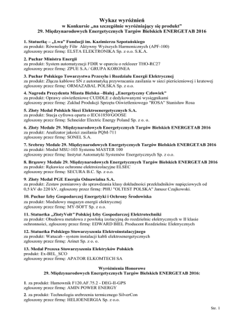Wykaz wyróżnień w Konkursie „na szczególnie wyróżniający się produkt” 29. Międzynarodowych Energetycznych Targów Bielskich ENERGETAB 2016 1. Statuetkę – „Lwa” Fundacji im. Kazimierza Szpotańskiego za produkt: Równoległy Filtr Aktywny Wyższych Harmonicznych (APF-100) zgłoszony przez firmę: ELSTA ELEKTRONIKA Sp. z o.o. S.K.A. 2. Puchar Ministra Energii za produkt: System automatyzacji FDIR w oparciu o reklozer THO-RC27 zgłoszony przez firmę: ZPUE S.A./ GRUPA KORONEA 3. Puchar Polskiego Towarzystwa Przesyłu i Rozdziału Energii Elektrycznej za produkt: Złącza kablowe SN z automatyką przywracania zasilania w sieci pierścieniowej i kratowej zgłoszony przez firmę: ORMAZABAL POLSKA Sp. z o.o. 4. Nagroda Prezydenta Miasta Bielska –Białej „Energetyczny Człowiek” za produkt: Oprawy oświetleniowe CUDDLE z dedykowanymi wysięgnikami zgłoszony przez firmę: Zakład Produkcji Sprzętu Oświetleniowego "ROSA" Stanisław Rosa 5. Złoty Medal Polskich Sieci Elektroenergetycznych S.A. za produkt: Stacja cyfrowa oparta o IEC61850/GOOSE zgłoszony przez firmę: Schneider Electric Energy Poland Sp. z o. o. 6. Złoty Medale 29. Międzynarodowych Energetycznych Targów Bielskich ENERGETAB 2016 za produkt: Analizator jakości zasilania PQM-711 zgłoszony przez firmę: SONEL S.A. 7. Srebrny Medale 29. Międzynarodowych Energetycznych Targów Bielskich ENERGETAB 2016 za produkt: Moduł MSU-103 Systemu MASTER 100 zgłoszony przez firmę: Instytut Automatyki Systemów Energetycznych Sp. z o.o. 8. Brązowy Medale 29. Międzynarodowych Energetycznych Targów Bielskich ENERGETAB 2016 za produkt: Rękawice ochronne elektroizolacyjne ELSEC zgłoszony przez firmę: SECURA B.C. Sp. z o.o. 9. Złoty Medal PGE Energia Odnawialna S.A. za produkt: Zestaw pomiarowy do sprawdzania klasy dokładności przekładników napięciowych od 0,5 kV do 220 kV, zgłoszony przez firmę: PHU "OLTEST POLSKA" Janusz Czajkowski. 10. Puchar Izby Gospodarczej Energetyki i Ochrony Środowiska za produkt: Modułowy magazyn energii elektrycznej zgłoszony przez firmę: MY-SOFT Sp. z o.o. 11. Statuetka „ZłotyVolt” Polskiej Izby Gospodarczej Elektrotechniki za produkt: Obudowa metalowa z powłoką izolacyjną do rozdzielnic elektrycznych w II klasie ochronności, zgłoszony przez firmę: EDWARD BIEL Producent Rozdzielnic Elektrycznych 12. Statuetka Polskiego Stowarzyszenia Elektroinstalacyjnego za produkt: Watucab - system instalacji kabli elektroenergetycznych zgłoszony przez firmę: Arinet Sp. z o. o. 13. Medal Prezesa Stowarzyszenia Elektryków Polskich produkt: Ex-BEL_SCO zgłoszony przez firmę: APATOR ELKOMTECH SA Wyróżnienia Honorowe 29. Międzynarodowych Energetycznych Targów Bielskich ENERGETAB 2016: 1. za produkt: Hamownik F120.AF.75.2 - DEG-II-GPS zgłoszony przez firmę: AMIN POWER ENERGY 2. za produkt: Technologia srebrzenia termicznego SilverCon zgłoszony przez firmę: HELIOENERGIA Sp. z o.o. Str. 1 3. za produkt: Typoszereg produktów LED dla hal produkcyjno-magazynowych zgłoszony przez firmę: LED COMPANY s.c. 4. za produkt: HSC 85-36KV - zestaw do przecinania kabli pod napięciem zgłoszony przez firmę: Zakład Aparatury Elektrycznej ERGOM Sp. z o.o. 5. za produkt: Zimno kurczliwy osprzęt kablowy na napięcia do 145 kV: głowice kompozytowe serii TS 145-II oraz mufy kablowe serii SS/SC 145-II zgłoszony przez firmę: 3M POLAND Sp. z o.o. 6. za produkt: Zestaw narzędzi elektro-hydraulicznych „Next Generation" zgłoszony przez firmę: KLAUKE POLSKA Sp. z o.o. 7. za produkt: Zestaw: stanowisko do obróbki szyn prądowych SH 300 z agregatem hydraulicznym AH 100 zgłoszony przez firmę: Zakłady Metalowe ERKO R.Pętlak spółka jawna Bracia Pętlak Puchar redakcji miesięcznika Energetyka za najciekawszą prezentację targową stoiska dla firmy: JEAN MUELLER POLSKA Sp. z o.o. Str. 2