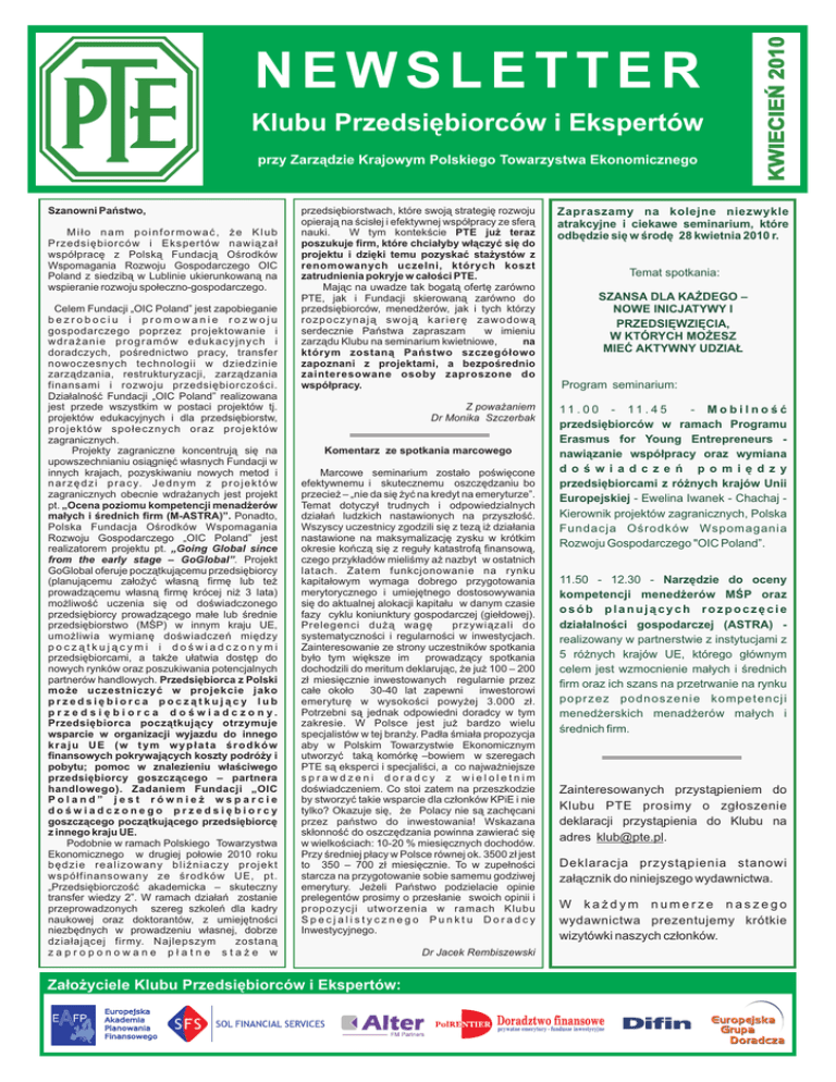 Klubu Przedsiêbiorców i Ekspertów przy Zarz¹dzie Krajowym Polskiego Towarzystwa Ekonomicznego Szanowni Pañstwo, Mi³o nam poinformowaæ, ¿e Klub Przedsiêbiorców i Ekspertów nawi¹za³ wspó³pracê z Polsk¹ Fundacj¹ Oœrodków Wspomagania Rozwoju Gospodarczego OIC Poland z siedzib¹ w Lublinie ukierunkowan¹ na wspieranie rozwoju spo³eczno-gospodarczego. Celem Fundacji „OIC Poland” jest zapobieganie bezrobociu i promowanie rozwoju gospodarczego poprzez projektowanie i wdra¿anie programów edukacyjnych i doradczych, poœrednictwo pracy, transfer nowoczesnych technologii w dziedzinie zarz¹dzania, restrukturyzacji, zarz¹dzania finansami i rozwoju przedsiêbiorczoœci. Dzia³alnoœæ Fundacji „OIC Poland” realizowana jest przede wszystkim w postaci projektów tj. projektów edukacyjnych i dla przedsiêbiorstw, projektów spo³ecznych oraz projektów zagranicznych. Projekty zagraniczne koncentruj¹ siê na upowszechnianiu osi¹gniêæ w³asnych Fundacji w innych krajach, pozyskiwaniu nowych metod i n a r z ê d z i p r a c y. J e d n y m z p r o j e k t ó w zagranicznych obecnie wdra¿anych jest projekt pt. „Ocena poziomu kompetencji menad¿erów ma³ych i œrednich firm (M-ASTRA)”. Ponadto, Polska Fundacja Oœrodków Wspomagania Rozwoju Gospodarczego „OIC Poland” jest realizatorem projektu pt. „Going Global since from the early stage – GoGlobal”. Projekt GoGlobal oferuje pocz¹tkuj¹cemu przedsiêbiorcy (planuj¹cemu za³o¿yæ w³asn¹ firmê lub te¿ prowadz¹cemu w³asn¹ firmê krócej ni¿ 3 lata) mo¿liwoœæ uczenia siê od doœwiadczonego przedsiêbiorcy prowadz¹cego ma³e lub œrednie przedsiêbiorstwo (MŒP) w innym kraju UE, umo¿liwia wymianê doœwiadczeñ miêdzy pocz¹tkuj¹cymi i doœwiadczonymi przedsiêbiorcami, a tak¿e u³atwia dostêp do nowych rynków oraz poszukiwania potencjalnych partnerów handlowych. Przedsiêbiorca z Polski mo¿e uczestniczyæ w projekcie jako przedsiêbiorca pocz¹tkuj¹cy lub p r z e d s i ê b i o r c a d o œ w i a d c z o n y. Przedsiêbiorca pocz¹tkuj¹cy otrzymuje wsparcie w organizacji wyjazdu do innego kraju UE (w tym wyp³ata œrodków finansowych pokrywaj¹cych koszty podró¿y i pobytu; pomoc w znalezieniu w³aœciwego przedsiêbiorcy goszcz¹cego – partnera handlowego). Zadaniem Fundacji „OIC Poland” jest równie¿ wsparcie doœwiadczonego przedsiêbiorcy goszcz¹cego pocz¹tkuj¹cego przedsiêbiorcê z innego kraju UE. Podobnie w ramach Polskiego Towarzystwa Ekonomicznego w drugiej po³owie 2010 roku bêdzie realizowany bliŸniaczy projekt wspó³finansowany ze œrodków UE, pt. „Przedsiêbiorczoœæ akademicka – skuteczny transfer wiedzy 2”. W ramach dzia³añ zostanie przeprowadzonych szereg szkoleñ dla kadry naukowej oraz doktorantów, z umiejêtnoœci niezbêdnych w prowadzeniu w³asnej, dobrze dzia³aj¹cej firmy. Najlepszym zostan¹ zaproponowane p³atne sta¿e w KWIECIEÑ 2010 NEWSLETTER przedsiêbiorstwach, które swoj¹ strategiê rozwoju opieraj¹ na œcis³ej i efektywnej wspó³pracy ze sfer¹ nauki. W tym kontekœcie PTE ju¿ teraz poszukuje firm, które chcia³yby w³¹czyæ siê do projektu i dziêki temu pozyskaæ sta¿ystów z renomowanych uczelni, których koszt zatrudnienia pokryje w ca³oœci PTE. Maj¹c na uwadze tak bogat¹ ofertê zarówno PTE, jak i Fundacji skierowan¹ zarówno do przedsiêbiorców, mened¿erów, jak i tych którzy rozpoczynaj¹ swoj¹ karierê zawodow¹ serdecznie Pañstwa zapraszam w imieniu zarz¹du Klubu na seminarium kwietniowe, na którym zostan¹ Pañstwo szczegó³owo zapoznani z projektami, a bezpoœrednio zainteresowane osoby zaproszone do wspó³pracy. Zapraszamy na kolejne niezwykle atrakcyjne i ciekawe seminarium, które odbêdzie siê w œrodê 28 kwietnia 2010 r. Z powa¿aniem Dr Monika Szczerbak 11 . 0 0 - 11 . 4 5 - Mobilnoœæ przedsiêbiorców w ramach Programu Erasmus for Young Entrepreneurs nawi¹zanie wspó³pracy oraz wymiana d o œ w i a d c z e ñ p o m i ê d z y przedsiêbiorcami z ró¿nych krajów Unii Europejskiej - Ewelina Iwanek - Chachaj Kierownik projektów zagranicznych, Polska Fundacja Oœrodków Wspomagania Rozwoju Gospodarczego "OIC Poland”. Komentarz ze spotkania marcowego Marcowe seminarium zosta³o poœwiêcone efektywnemu i skutecznemu oszczêdzaniu bo przecie¿ – „nie da siê ¿yæ na kredyt na emeryturze”. Temat dotyczy³ trudnych i odpowiedzialnych dzia³añ ludzkich nastawionych na przysz³oœæ. Wszyscy uczestnicy zgodzili siê z tez¹ i¿ dzia³ania nastawione na maksymalizacjê zysku w krótkim okresie koñcz¹ siê z regu³y katastrof¹ finansow¹, czego przyk³adów mieliœmy a¿ nazbyt w ostatnich latach. Zatem funkcjonowanie na rynku kapita³owym wymaga dobrego przygotowania merytorycznego i umiejêtnego dostosowywania siê do aktualnej alokacji kapita³u w danym czasie fazy cyklu koniunktury gospodarczej (gie³dowej). Prelegenci du¿¹ wagê przywi¹zali do systematycznoœci i regularnoœci w inwestycjach. Zainteresowanie ze strony uczestników spotkania by³o tym wiêksze im prowadz¹cy spotkania dochodzili do meritum deklaruj¹c, ¿e ju¿ 100 – 200 z³ miesiêcznie inwestowanych regularnie przez ca³e oko³o 30-40 lat zapewni inwestorowi emeryturê w wysokoœci powy¿ej 3.000 z³. Potrzebni s¹ jednak odpowiedni doradcy w tym zakresie. W Polsce jest ju¿ bardzo wielu specjalistów w tej bran¿y. Pad³a œmia³a propozycja aby w Polskim Towarzystwie Ekonomicznym utworzyæ tak¹ komórkê –bowiem w szeregach PTE s¹ eksperci i specjaliœci, a co najwa¿niejsze sprawdzeni doradcy z wieloletnim doœwiadczeniem. Co stoi zatem na przeszkodzie by stworzyæ takie wsparcie dla cz³onków KPiE i nie tylko? Okazuje siê, ¿e Polacy nie s¹ zachêcani przez pañstwo do inwestowania! Wskazana sk³onnoœæ do oszczêdzania powinna zawieraæ siê w wielkoœciach: 10-20 % miesiêcznych dochodów. Przy œredniej p³acy w Polsce równej ok. 3500 z³ jest to 350 – 700 z³ miesiêcznie. To w