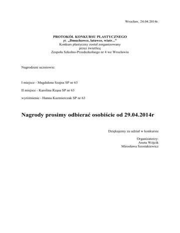 Wrocław, 24.04.2014r. PROTOKÓŁ KONKURSU PLASTYCZNEGO pt. „Dmuchawce, latawce, wiatr...” Konkurs plastyczny został zorganizowany przez świetlicę Zespołu Szkolno-Przedszkolnego nr 4 we Wrocławiu Nagrodzeni uczniowie: I miejsce - Magdalena Szajna SP nr 63 II miejsce - Karolina Rząsa SP nr 63 wyróżnienie - Hanna Kazmierczak SP nr 63 Nagrody prosimy odbierać osobiście od 29.04.2014r Dziękujemy za udział w konkursie Organizatorzy: Aneta Wójcik Mirosława Szostakiewicz