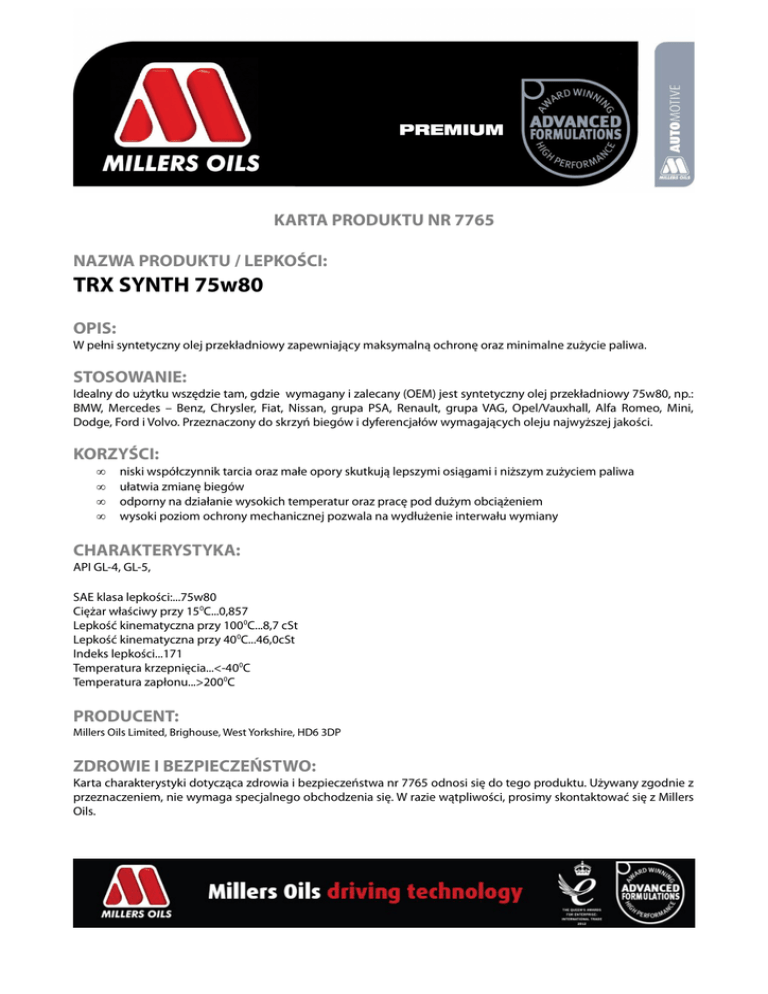 KARTA PRODUKTU NR 7765 NAZWA PRODUKTU / LEPKOŚCI: TRX SYNTH 75w80 OPIS: W pełni syntetyczny olej przekładniowy zapewniający maksymalną ochronę oraz minimalne zużycie paliwa. STOSOWANIE: Idealny do użytku wszędzie tam, gdzie wymagany i zalecany (OEM) jest syntetyczny olej przekładniowy 75w80, np.: BMW, Mercedes – Benz, Chrysler, Fiat, Nissan, grupa PSA, Renault, grupa VAG, Opel/Vauxhall, Alfa Romeo, Mini, Dodge, Ford i Volvo. Przeznaczony do skrzyń biegów i dyferencjałów wymagających oleju najwyższej jakości. KORZYŚCI: • • • • niski współczynnik tarcia oraz małe opory skutkują lepszymi osiągami i niższym zużyciem paliwa ułatwia zmianę biegów odporny na działanie wysokich temperatur oraz pracę pod dużym obciążeniem wysoki poziom ochrony mechanicznej pozwala na wydłużenie interwału wymiany CHARAKTERYSTYKA: API GL-4, GL-5, SAE klasa lepkości:...75w80 Ciężar właściwy przy 150C...0,857 Lepkość kinematyczna przy 1000C...8,7 cSt Lepkość kinematyczna przy 400C...46,0cSt Indeks lepkości...171 Temperatura krzepnięcia...<-400C Temperatura zapłonu...>2000C PRODUCENT: Millers Oils Limited, Brighouse, West Yorkshire, HD6 3DP ZDROWIE I BEZPIECZEŃSTWO: Karta charakterystyki dotycząca zdrowia i bezpieczeństwa nr 7765 odnosi się do tego produktu. Używany zgodnie z przeznaczeniem, nie wymaga specjalnego obchodzenia się. W razie wątpliwości, prosimy skontaktować się z Millers Oils.