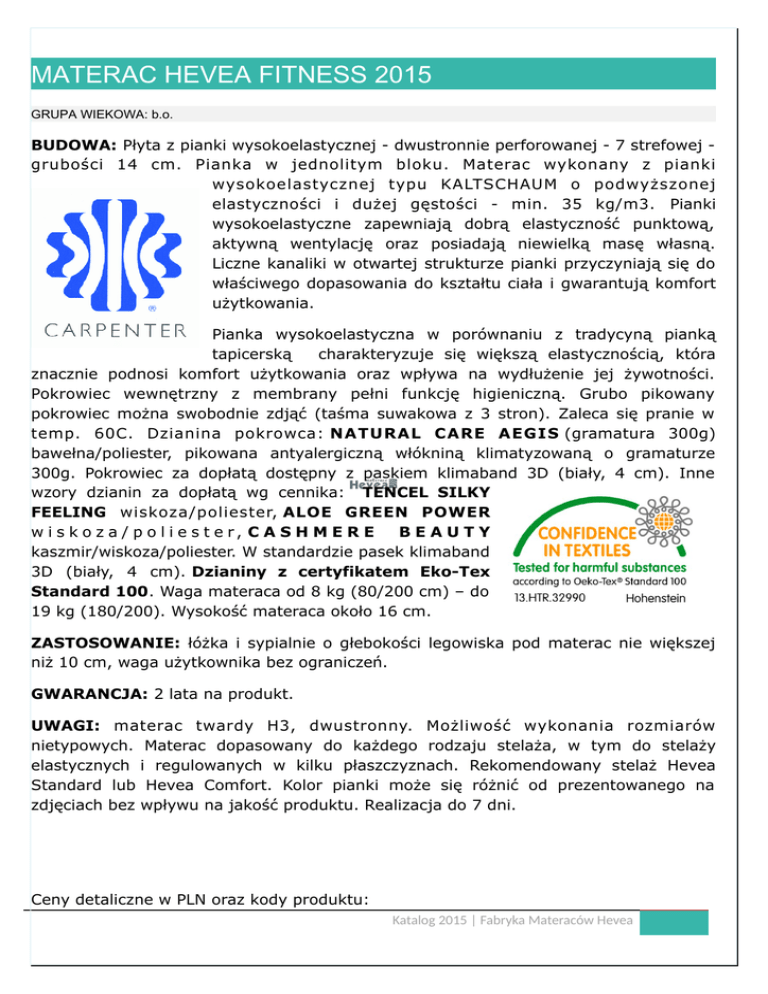 MATERAC HEVEA FITNESS 2015 GRUPA WIEKOWA: b.o. BUDOWA: Płyta z pianki wysokoelastycznej - dwustronnie perforowanej - 7 strefowej grubości 14 cm. Pianka w jednolitym bloku. Materac wykonany z pianki wysokoelastycznej typu KALTSCHAUM o podwyższonej elastyczności i dużej gęstości - min. 35 kg/m3. Pianki wysokoelastyczne zapewniają dobrą elastyczność punktową, aktywną wentylację oraz posiadają niewielką masę własną. Liczne kanaliki w otwartej strukturze pianki przyczyniają się do właściwego dopasowania do kształtu ciała i gwarantują komfort użytkowania. Pianka wysokoelastyczna w porównaniu z tradycyną pianką tapicerską charakteryzuje się większą elastycznością, która znacznie podnosi komfort użytkowania oraz wpływa na wydłużenie jej żywotności. Pokrowiec wewnętrzny z membrany pełni funkcję higieniczną. Grubo pikowany pokrowiec można swobodnie zdjąć (taśma suwakowa z 3 stron). Zaleca się pranie w temp. 60C. Dzianina pokrowca: NATURAL CARE AEGIS (gramatura 300g) bawełna/poliester, pikowana antyalergiczną włókniną klimatyzowaną o gramaturze 300g. Pokrowiec za dopłatą dostępny z paskiem klimaband 3D (biały, 4 cm). Inne wzory dzianin za dopłatą wg cennika: TENCEL SILKY FEELING wiskoza/poliester, ALOE GREEN POWER w i s k o z a / p o l i e s t e r, C A S H M E R E BEAUTY kaszmir/wiskoza/poliester. W standardzie pasek klimaband 3D (biały, 4 cm). Dzianiny z certyfikatem Eko-Tex Standard 100. Waga materaca od 8 kg (80/200 cm) – do 19 kg (180/200). Wysokość materaca około 16 cm. ZASTOSOWANIE: łóżka i sypialnie o głebokości legowiska pod materac nie większej niż 10 cm, waga użytkownika bez ograniczeń. GWARANCJA: 2 lata na produkt. UWAGI: materac twardy H3, dwustronny. Możliwość wykonania rozmiarów nietypowych. Materac dopasowany do każdego rodzaju stelaża, w tym do stelaży elastycznych i regulowanych w kilku płaszczyznach. Rekomendowany stelaż Hevea Standard lub Hevea Comfort. Kolor pianki może się różnić od prezentowanego na zdjęciach bez wpływu na jakość produktu. Realizacja do 7 dni. Ceny detaliczne w PLN oraz kody produktu: Katalog 2015 | Fabryka Materaców Hevea POKROWIEC AEGIS NATURAL CARE* 864 MATERAC WYSOKOELASTYCZNY FITNESS 80/200 590160210208 MATERAC WYSOKOELASTYCZNY FITNESS 90/200 590160210157 910 MATERAC WYSOKOELASTYCZNY FITNESS 120/200 590160210209 1223 MATERAC WYSOKOELASTYCZNY FITNESS 140/200 590160210158 1223 MATERAC WYSOKOELASTYCZNY FITNESS 160/200 590160210159 1377 MATERAC WYSOKOELASTYCZNY FITNESS 180/200 590160210160 1469 POKROWCE TENCEL SILKY FEELING, ALEO GREEN POWER, CASHMERE BEAUTY MATERAC WYSOKOELASTYCZNY FITNESS 80/200 590160210208 SF/AG/CB 929 MATERAC WYSOKOELASTYCZNY FITNESS 90/200 590160210157 SF/AG/CB 975 MATERAC WYSOKOELASTYCZNY FITNESS 120/200 590160210209 SF/AG/CB 1313 MATERAC WYSOKOELASTYCZNY FITNESS 140/200 590160210158 SF/AG/CB 1313 MATERAC WYSOKOELASTYCZNY FITNESS 160/200 590160210159 SF/AG/CB 1467 MATERAC WYSOKOELASTYCZNY FITNESS 180/200 590160210160 SF/AG/CB 1559 *pokrowiec bez paska klimaband 3D Katalog 2015 | Fabryka Materaców Hevea Katalog 2015 | Fabryka Materaców Hevea
