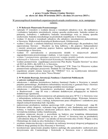 Sprawozdanie z pracy Urzędu Miasta i Gminy Siewierz za okres od dnia 30 kwietnia 2015 r. do dnia 24 czerwca 2015 r. W poszczególnych komórkach organizacyjnych urzędu zrealizowano m.in. następujące zadania: • • • • • • • • • • • • • • • 1. W Referacie Planowania Przestrzennego: wpłynęło 15 wniosków o wydanie decyzji o warunkach zabudowy m.in. dla nadbudowy i rozbudowy budynków mieszkalnych, zmiany sposobu użytkowania budynku stolarni na piekarnię, rozbudowy i nadbudowy budynku mieszkalnego wraz ze zmianą sposobu użytkowania budynku mieszkalnego na przedszkole niepubliczne w Siewierzu, wydano 12 decyzji o warunkach zabudowy dla zabudowy mieszkaniowej jednorodzinnej w Siewierzu, Wojkowicach Kościelnych Brudzowicach, Żelisławicach, wydano 2 decyzje o ustaleniu lokalizacji inwestycji celu publicznego: dla przebudowy linii napowietrznej Siewierz – Myszków na linię kablową i dla poprawy funkcjonalności i estetyki przestrzeni publicznej poprzez budowę ogólnodostępnego parkingu przy ul. Czarnieckiego w Siewierzu, wydano 53 zaświadczenia o przeznaczeniu działek w miejscowych planach zagospodarowania przestrzennego i studium, w tym wypisy i wyrysy, wydano 3 postanowienia opiniujące pozytywnie wstępne projekty podziału nieruchomości położonych w Tuliszowie, Wojkowicach Kościelnych i Brudzowicach, wydano postanowienie uzgadniające pozytywnie Plan Ruchu "Kopalni Siewierz" na okres od 2015 do 2020 r. dla GZD S.A. w Siewierzu, dla Odkrywkowego Zakładu Górniczego "Szeligowiec" P.W. Trans Lis Wieszowa wydano postanowienie opiniujące pozytywnie Dodatek Nr 2 do Planu Ruchu, uzgodniono projekt zmiany koncesji dla "TRIBAG" S.A. na wydobywanie dolomitów dewońskich i triasowych ze złoża "Nowa Wioska". 2. W Wydziale Rozwoju, Inwestycji, Funduszy i Zamówień Publicznych: w zakresie realizacji inwestycji: zakończono i odebrano bezusterkowo budowę iluminacji Zamku w Siewierzu w ramach projektu partnerskiego „Rozbudowa infrastruktury turystycznej w gminach Psary i Siewierz celem stworzenia wspólnego markowego produktu turystycznego”, zakończono i odebrano bezusterkowo przebudowę stadionu sportowego KS „Niwy” w Brudzowicach – etap III wraz z robotami dodatkowymi polegającymi na budowie dodatkowego ogrodzenia, nadzorowano budowę pełnowymiarowej sali gimnastycznej przy SP Nr 2 w Siewierzu wraz z infrastrukturą techniczną oraz budową boiska wielofunkcyjnego. Wykonano betonowe ściany fundamentowe wraz z izolacją, kontynuowano prace zbrojeniowe i szalunkowe przy słupach nośnych konstrukcji hali i łącznika, nadzorowano przebudowę stadionu sportowego LKS „Ostoja” w Żelisławicach - etap III. Kończono roboty drogowe, wykonano krąg ogniskowy oraz fundamenty pod zadaszenie trybuny, w budynku zaplecza zakończono pokrycie dachu z blachodachówki, wykonano wewnętrzną instalację wodną i kanalizacyjną, uzyskano ostateczne decyzje o pozwoleniu na budowę oraz kompletną dokumentację projektową dla kanalizacji sanitarnej na tzw. „Piwoni” w Siewierzu oraz na przebudowę i odwodnienie dróg na „Piwoni” i na odcinku od skrzyżowania ulicy Żwirki i Wigury z ulicą Oleśnickiego do ronda na ulicy Kieleckiej w Siewierzu, uzyskano ostateczną decyzję o zezwoleniu na realizację inwestycji drogowej polegającej na budowie drogi gminnej na ulicy Rzecznej w Siewierzu, koordynowano opracowanie projektu budowy parkingu dla samochodów osobowych przy skrzyżowaniu ulic Czarnieckiego i Kościuszki w Siewierzu wraz z odwodnieniem, • • • • • • • • • • • • • • • • chodnikiem, wjazdami, oświetleniem i zagospodarowaniem zieleni, koordynowano opracowanie projektu przebudowy budynku mieszkalnego przy ul. Górnej w Siewierzu z przeznaczeniem na mieszkania socjalno-komunalne. Zatwierdzono ostateczną koncepcję przebudowy budynku, koordynowano opracowanie projektu dla budynku wielofunkcyjnego w Siewierzu składającego się z części mieszkalnej oraz z remizy OSP wraz z niezbędnym zagospodarowaniem terenu przyległego oraz dla drogi dojazdowej do budynku, koordynowano opracowanie projektu ścieżki pieszo-rowerowej i budowy kładki nad rzeką Przemszą pomiędzy Kuźnicą Warężyńską a Wojkowicami Kościelnymi wraz z projektem wodociągu, kanału technologicznego i oświetlenia ścieżki. Otrzymano projekty wykonawcze do uzgodnienia, koordynowano opracowanie projektu remontu budynku Urzędu Miasta i Gminy, koordynowano realizację umowy na opracowanie projektu budynku dworca autobusowego w Siewierzu wraz z niezbędnymi przyłączami, parkingami, stanowiskami przystankowymi oraz zagospodarowaniem terenu, przygotowano i rozesłano zapytanie ofertowe na dostawę i montaż piłkochwytów dla boisk wielofunkcyjnych w Kuźnicy Warężyńskiej, Dziewkach i Brudzowicach, przygotowano i rozesłano zapytanie ofertowe na wykonanie bieżącej konserwacji elewacji zewnętrznej oraz pokrycia dachowego budynku Zintegrowanego Posterunku Służb Ratowniczych w Siewierzu, w związku z odkryciem pozostałości architektury obronnej tj. baszty narożnej podczas pełnienia nadzoru archeologicznego nad budową iluminacji Zamku, zlecono przeprowadzenie badań archeologicznych w części południowo-zachodniej oraz w części południowo-wschodniej tarasu artyleryjskiego na Zamku, dokonano odbioru usunięcia usterek ujawnionych w trakcie przeglądu wiosennego drogi – ul.Widokowej w Tuliszowie, uczestniczono w kontroli prowadzonej przez RZGW w Gliwicach dotyczącej utrzymania wylotu do rzeki Przemszy na podstawie pozwolenia wodnoprawnego, w związku z działaniem oczyszczalni ścieków w Siewierzu, rozstrzygnięto zapytanie ofertowe na opracowanie aktualizacji audytu energetycznego Miejsko-Gminnego Centrum Kultury, Sportu i Turystyki w Siewierzu. Dokument opracuje konsorcjum firm: Pracownia audytorska Sp. z o.o. i Pracownia audytorska inż. Jacek Stępień z Ostrowca Świętokrzyskiego. W zakresie zamówień publicz