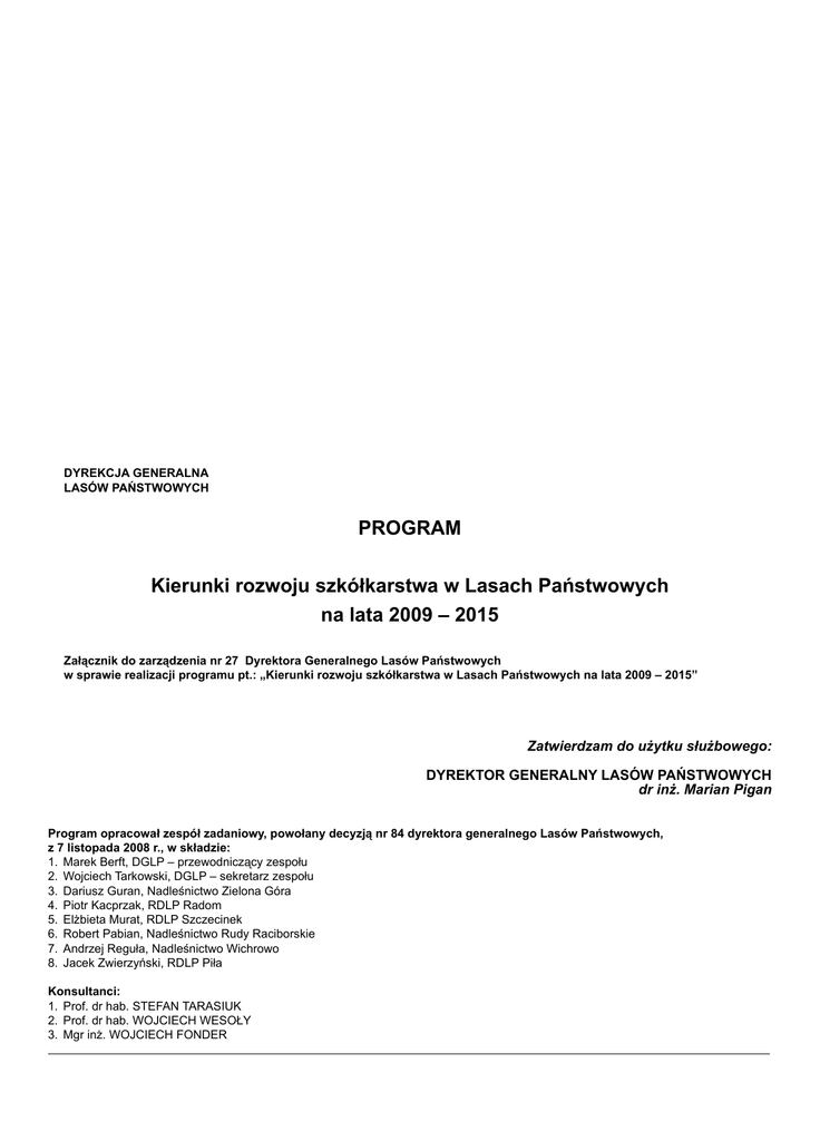 DYREKCJA GENERALNA LASÓW PAŃSTWOWYCH PROGRAM Kierunki rozwoju szkółkarstwa w Lasach Państwowych na lata 2009 – 2015 Załącznik do zarządzenia nr 27 Dyrektora Generalnego Lasów Państwowych w sprawie realizacji programu pt.: „Kierunki rozwoju szkółkarstwa w Lasach Państwowych na lata 2009 – 2015” Zatwierdzam do użytku służbowego: DYREKTOR GENERALNY LASÓW PAŃSTWOWYCH dr inż. Marian Pigan Program opracował zespół zadaniowy, powołany decyzją nr 84 dyrektora generalnego Lasów Państwowych, z 7 listopada 2008 r., w składzie: 1. Marek Berft, DGLP – przewodniczący zespołu 2. Wojciech Tarkowski, DGLP – sekretarz zespołu 3. Dariusz Guran, Nadleśnictwo Zielona Góra 4. Piotr Kacprzak, RDLP Radom 5. Elżbieta Murat, RDLP Szczecinek 6. Robert Pabian, Nadleśnictwo Rudy Raciborskie 7. Andrzej Reguła, Nadleśnictwo Wichrowo 8. Jacek Zwierzyński, RDLP Piła Konsultanci: 1. Prof. dr hab. STEFAN TARASIUK 2. Prof. dr hab. WOJCIECH WESOŁY 3. Mgr inż. WOJCIECH FONDER SPIS TREŚCI I. Wprowadzenie II. Syntetyczna analiza aktualnego stanu szkółkarstwa w Lasach Państwowych III. Status szkółek IV. Organizacja produkcji szkółkarskiej V. Tendencje hodowli lasu VI. Ogólne zasady planowania i działalności szkółkarskiej VII. Wymagania i warunki realizacji szkółkarstwa specjalistycznego VIII. Wymagania i warunki realizacji szkółkarstwa polowego IX. Kierunki rozwoju technicznego i technologicznego szkółkarstwa leśnego X. Pozyskiwanie zewnętrznej pomocy finansowej XI. System doskonalenia kwalifikacji XII. Badania naukowe: kierunki i cele badawcze XIII. Szkółki leśne w programie edukacji leśnej społeczeństwa XIV. Dochody z działalności w szkółkarstwie i nasiennictwie WYKAZ TABEL I RYCIN: 1. Analiza wykorzystania posiadanego potencjału szkółek leśnych wg regionalnych dyrekcji Lasów Państwowych 2006–2007 2. Analiza kosztów produkcji szkółkarskiej roku 2008 wg danych wniosku HODOWLA LASU (hurtownia danych) 3. Udział ugorów w powierzchni produkcyjnej szkółek w roku 2007 i 2008 4. Porównanie intensywności produkcji szkółkarskiej w technologii kontenerowej i tradycyjnej 5. Porównanie kosztu jednostkowego dojrzałych sadzonek świerkowych wyhodowanych: w systemie kontenerowym w szkółce Nadleśnictwa Jabłonna oraz w systemie polowym w szkółce Nadleśnictwa Bardo Śląskie 6. Porównanie jednostkowych kosztów produkcji dojrzałych sadzonek modrzewia, dębu i buka w systemie polowym i kontenerowym uzyskanych w roku 2008 w wybranych szkółkach LP 7. Rozmiar produkcji materiału sadzeniowego i wielkość powierzchni produkcyjnej szkółek w PGL LP w latach 1955–2007 – kierunki zmian 8. Potencjał powierzchniowy szkółek w stosunku do rozmiaru zadań hodowli lasu w okresie 2006–2008, kierunki i tempo zmian PROGRAM I KIERUNKI ROZWOJU SZKÓŁKARSTWA W LASACH PAŃSTWOWYCH NA LATA 2009–2015 I. WPROWADZENIE Artykuł 13 ustawy o lasach nakłada na właścicieli obowiązek trwałego utrzymywania lasów i zapewniania ciągłości ich użytkowania, w tym ponownego wprowadzania roślinności leśnej (upraw leśnych). Ten fundamentalny cel gospodarki leśnej realizowany jest poprzez działania hodowlane, które zgodnie z § 2 Zasad Hodowli Lasu powinny respektować warunki i procesy naturalne. Ograniczone, z różnych przyczyn, możliwości naturalnego odnawiania lasu spowodowały, że ukształtowany w polskim leśnictwie model zagospodarowania opiera się na stosowaniu w dużym rozmiarze rębni zupełnych i złożonych, odnawianych sztucznie – ponad 90% powierzchni. W przypadku zalesień i odnowień sztucznych, sadzonkami wyhodowanymi w szkółkach leśnych, niezbędne jest przestrzeganie zasad regionalizacji przyrodniczoleśnej, regionalizacji nasiennej oraz wykorzystywanie naturalnego potencjału siedlisk leśnych. Funkcjonujący w Lasach Państwowych model szkółkarstwa leśnego gwarantuje respektowanie wymienionych zasad i głównie z tego powodu utrzymywanie szkółkarstwa w strukturach organizacyjnych Lasów Państwowych należy uznać za działanie racjonalne. Zręby obecnego modelu organizacyjnego szkółkarstwa Lasów Państwowych tworzone były w drugiej dekadzie lat siedemdziesiątych dwudziestego wieku, na podstawie stosowanych wówczas technologii, z uwzględnieniem funkcjonującego w tamtym czasie rynku pracy oraz rozmiaru zadań hodowlanych, realizowanych przez jednostki Lasów Państwowych i inne podmioty spoza LP (prywatni właściciele lasów, lasy komunalne, itp.). Zdecydowanie dominującą technologią była produkcja sadzonek z odkrytym systemem korzeniowym, w tradycyjnych szkółkach polowych, z zastosowaniem płodozmianu. Dla przeważającej większości gatunków w technologii tej produkuje się wielolatki, w tym sadzonki szkółkowane. Jako minimum obowiązywała zasada samowystarczalności nadleśnictw w zakresie produkcji materiału sadzeniowego, niezbędnego do pokrycia własnych potrzeb hodowlanych. W praktyce oznaczało to, że w każdym nadleśnictwie była jedna szkółka gospodarcza o powierzchni około trzech, czterech hektarów, a także mniejsze szkółki, najczęściej bez niezbędnej infrastruktury, rozrzucone na terenie obrębów i leśnictw. Dalszym etapem rozwojowym było podjęcie hodowli sadzonek z odkrytym systemem korzeniowym w inspektach i korytach na różnego rodzaju podłożach i substratach. Kolejnym krokiem w rozwoju technologicznym było zastosowanie osłon ze szkła lub folii, początkowo prymitywnych, wraz z upływem czasu doskonalonych technicznie. Aktualny wysoki poziom w zakresie budowy i wyposażenia tuneli foliowych stworzył warunki dla hodowli sadzonek w warunkach kontrolowanych. Najnowszym osiągnięciem techniczno-technologicznym w szkółkarstwie jest kontenerowa produkcja sadzonek z zakrytym systemem korzeniowym, w warunkach kontrolowanych, która stwarza możliwość produkcji sadzonek w dużej liczbie. Odpowiednie oprzyrządowanie techniczne metod kontenerowych daje m