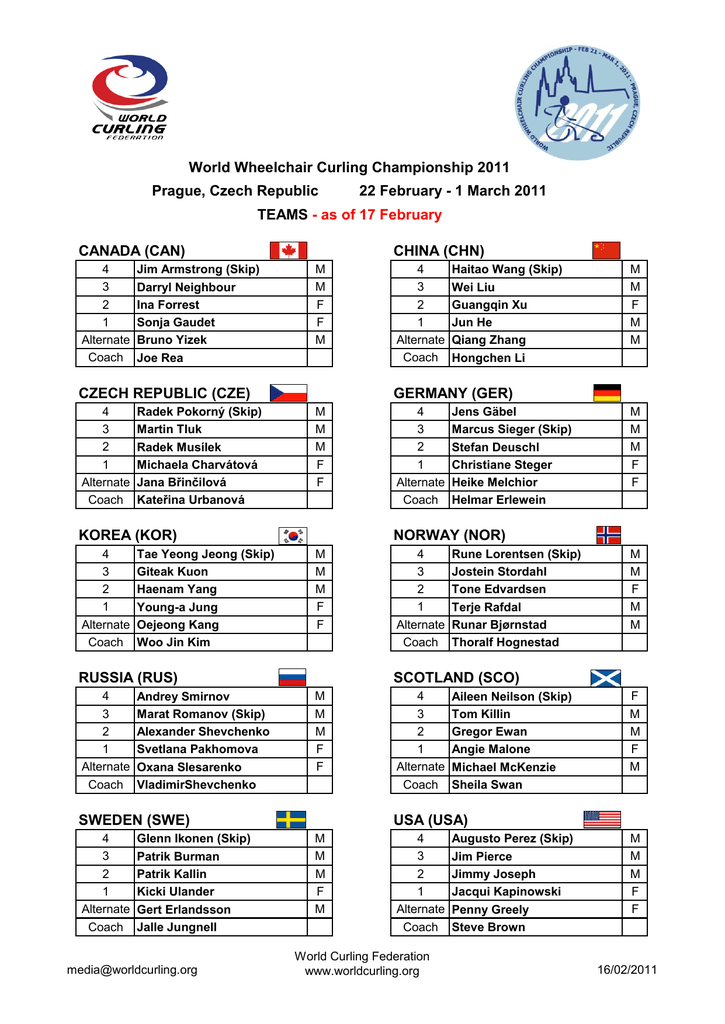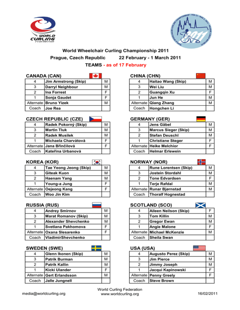 World Wheelchair Curling Championship 2011 Prague, Czech Republic 22 February - 1 March 2011 TEAMS - as of 17 February CANADA (CAN) 4 3 2 1 Alternate Coach Jim Armstrong (Skip) Darryl Neighbour Ina Forrest Sonja Gaudet Bruno Yizek Joe Rea CHINA (CHN) M M F F M CZECH REPUBLIC (CZE) 4 3 2 1 Alternate Coach Radek Pokorný (Skip) Martin Tluk Radek Musílek Michaela Charvátová Jana Břinčilová Kateřina Urbanová Tae Yeong Jeong (Skip) Giteak Kuon Haenam Yang Young-a Jung Oejeong Kang Woo Jin Kim M M M F F Andrey Smirnov Marat Romanov (Skip) Alexander Shevchenko Svetlana Pakhomova Oxana Slesarenko VladimirShevchenko Glenn Ikonen (Skip) Patrik Burman Patrik Kallin Kicki Ulander Gert Erlandsson Jalle Jungnell [email protected] 4 3 2 1 Alternate Coach Jens Gäbel Marcus Sieger (Skip) Stefan Deuschl Christiane Steger Heike Melchior Helmar Erlewein M M M F F 4 3 2 1 Alternate Coach Rune Lorentsen (Skip) Jostein Stordahl Tone Edvardsen Terje Rafdal Runar Bjørnstad Thoralf Hognestad M M F M M SCOTLAND (SCO) M M M F F SWEDEN (SWE) 4 3 2 1 Alternate Coach M M F M M NORWAY (NOR) M M M F F RUSSIA (RUS) 4 3 2 1 Alternate Coach Haitao Wang (Skip) Wei Liu Guangqin Xu Jun He Qiang Zhang Hongchen Li GERMANY (GER) KOREA (KOR) 4 3 2 1 Alternate Coach 4 3 2 1 Alternate Coach 4 3 2 1 Alternate Coach Aileen Neilson (Skip) Tom Killin Gregor Ewan Angie Malone Michael McKenzie Sheila Swan F M M F M USA (USA) M M M F M 4 3 2 1 Alternate Coach World Curling Federation www.worldcurling.org Augusto Perez (Skip) Jim Pierce Jimmy Joseph Jacqui Kapinowski Penny Greely Steve Brown M M M F F 16/02/2011