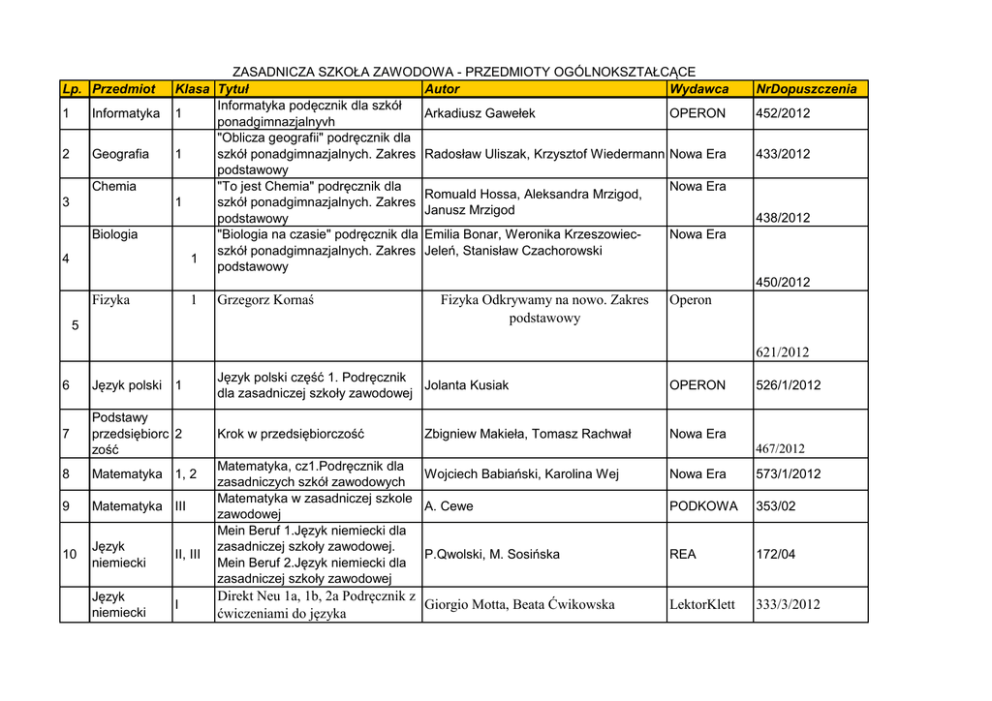 Lp. Przedmiot 1 Informatyka 2 Geografia Chemia 3 Biologia 4 ZASADNICZA SZKOŁA ZAWODOWA - PRZEDMIOTY OGÓLNOKSZTAŁCĄCE Klasa Tytuł Autor Wydawca Informatyka podęcznik dla szkół 1 Arkadiusz Gawełek OPERON ponadgimnazjalnyvh "Oblicza geografii" podręcznik dla 1 szkół ponadgimnazjalnych. Zakres Radosław Uliszak, Krzysztof Wiedermann Nowa Era podstawowy "To jest Chemia" podręcznik dla Nowa Era Romuald Hossa, Aleksandra Mrzigod, 1 szkół ponadgimnazjalnych. Zakres Janusz Mrzigod podstawowy "Biologia na czasie" podręcznik dla Emilia Bonar, Weronika KrzeszowiecNowa Era szkół ponadgimnazjalnych. Zakres Jeleń, Stanisław Czachorowski 1 podstawowy NrDopuszczenia 452/2012 433/2012 438/2012 450/2012 Fizyka 1 Grzegorz Kornaś 5 Fizyka Odkrywamy na nowo. Zakres podstawowy Operon 621/2012 6 Język polski 7 Podstawy przedsiębiorc 2 zość 1 8 Matematyka 1, 2 9 Matematyka III 10 Język niemiecki II, III Język niemiecki I Język polski część 1. Podręcznik Jolanta Kusiak dla zasadniczej szkoły zawodowej OPERON Krok w przedsiębiorczość Nowa Era Zbigniew Makieła, Tomasz Rachwał 526/1/2012 467/2012 Matematyka, cz1.Podręcznik dla Wojciech Babiański, Karolina Wej zasadniczych szkół zawodowych Matematyka w zasadniczej szkole A. Cewe zawodowej Mein Beruf 1.Język niemiecki dla zasadniczej szkoły zawodowej. P.Qwolski, M. Sosińska Mein Beruf 2.Język niemiecki dla zasadniczej szkoły zawodowej Direkt Neu 1a, 1b, 2a Podręcznik z Giorgio Motta, Beata Ćwikowska ćwiczeniami do języka Nowa Era 573/1/2012 PODKOWA 353/02 REA 172/04 LektorKlett 333/3/2012 11 12 13 14 15 Edukacja dla bezpieczeńst 2 wa Religia Religia język angielski język angielski 1 2 Edukacja dla bezpieczeństwa.Podręcznik dla zasadniczej szkoły zawodowej M. Goniewicz, A. Nowak, Z. Smutek Swiadczę o Jezusie w Kościele Swiadczę o Jezusie w świecie Ks. Robert Strus, ks. Wiesław Galant Ks. Robert Strus, ks. Wiesław Galant OPERON 256/03 1 New Horizons 1 297/1/2010 2i3 New Horizons 2 297/2/2010
