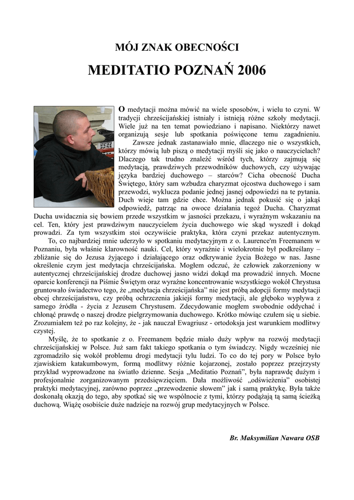MÓJ ZNAK OBECNOŚCI MEDITATIO POZNAŃ 2006 O medytacji można mówić na wiele sposobów, i wielu to czyni. W tradycji chrześcijańskiej istniały i istnieją różne szkoły medytacji. Wiele już na ten temat powiedziano i napisano. Niektórzy nawet organizują sesje lub spotkania poświęcone temu zagadnieniu. Zawsze jednak zastanawiało mnie, dlaczego nie o wszystkich, którzy mówią lub piszą o medytacji myśli się jako o nauczycielach? Dlaczego tak trudno znaleźć wśród tych, którzy zajmują się medytacją, prawdziwych przewodników duchowych, czy używając języka bardziej duchowego – starców? Cicha obecność Ducha Świętego, który sam wzbudza charyzmat ojcostwa duchowego i sam przewodzi, wyklucza podanie jednej jasnej odpowiedzi na te pytania. Duch wieje tam gdzie chce. Można jednak pokusić się o jakąś odpowiedź, patrząc na owoce działania tegoż Ducha. Charyzmat Ducha uwidacznia się bowiem przede wszystkim w jasności przekazu, i wyraźnym wskazaniu na cel. Ten, który jest prawdziwym nauczycielem życia duchowego wie skąd wyszedł i dokąd prowadzi. Za tym wszystkim stoi oczywiście praktyka, która czyni przekaz autentycznym. To, co najbardziej mnie uderzyło w spotkaniu medytacyjnym z o. Laurence'm Freemanem w Poznaniu, była właśnie klarowność nauki. Cel, który wyraźnie i wielokrotnie był podkreślany – zbliżanie się do Jezusa żyjącego i działającego oraz odkrywanie życia Bożego w nas. Jasne określenie czym jest medytacja chrześcijańska. Mogłem odczuć, że człowiek zakorzeniony w autentycznej chrześcijańskiej drodze duchowej jasno widzi dokąd ma prowadzić innych. Mocne oparcie konferencji na Piśmie Świętym oraz wyraźne koncentrowanie wszystkiego wokół Chrystusa gruntowało świadectwo tego, że „medytacja chrześcijańska” nie jest próbą adopcji formy medytacji obcej chrześcijaństwu, czy próbą ochrzczenia jakiejś formy medytacji, ale głęboko wypływa z samego źródła - życia z Jezusem Chrystusem. Zdecydowanie mogłem swobodnie oddychać i chłonąć prawdę o naszej drodze pielgrzymowania duchowego. Krótko mówiąc czułem się u siebie. Zrozumiałem też po raz kolejny, że - jak nauczał Ewagriusz - ortodoksja jest warunkiem modlitwy czystej. Myślę, że to spotkanie z o. Freemanem będzie miało duży wpływ na rozwój medytacji chrześcijańskiej w Polsce. Już sam fakt takiego spotkania o tym świadczy. Nigdy wcześniej nie zgromadziło się wokół problemu drogi medytacji tylu ludzi. To co do tej pory w Polsce było zjawiskiem katakumbowym, formą modlitwy różnie kojarzonej, zostało poprzez przejrzysty przykład wyprowadzone na światło dzienne. Sesja „Meditatio Poznań”, była naprawdę dużym i profesjonalnie zorganizowanym przedsięwzięciem. Dała możliwość „odświeżenia” osobistej praktyki medytacyjnej, zarówno poprzez „przewodzenie słowem” jak i samą praktykę. Była także doskonałą okazją do tego, aby spotkać się we wspólnocie z tymi, którzy podążają tą samą ścieżką duchową. Wiążę osobiście duże nadzieje na rozwój grup medytacyjnych w Polsce. Br. Maksymilian Nawara OSB Świadectwa: Br. Wojtek OCD: Bardzo się cieszę, że mogłem uczestniczyć w sympozjum na temat medytacji chrześcijańskiej prowadzonym przez o. L. Freemana. Dla mnie był to apostolat modlitwy i przybliżanie kontemplacyjnego wymiaru chrześcijaństwa w naprawdę dobrym i pełnym pokoju stylu; przesłanie docierające do tych, którzy cenią rzeczy proste (nie znaczy łatwe) i ukryte, wewnętrzne. Praktyka kierowania uwagi na Boga przy pomocy wybranego słowa doskonale nadaje się do “zastosowania” w codzienności i pomoże wypełnić Chrystusowe wezwanie do modlitwy nieustannej, modlitwy serca. Tomasz Szymański, Warszawa: „Niech będzie błogosławiony Bóg i Ojciec Pana naszego Jezusa Chrystusa; On napełnił nas wszelkim błogosławieństwem duchowym na wyżynach niebieskich – w Chrystusie.” (Ef 1, 3) Meditatio 2006 z udziałem o. Freemana utwierdziło mnie w przekonaniu, że modlitwa kontemplacyjna znajduje się w sercu życia Kościoła. Jest to modlitwa samego Jezusa, którego Duch woła „Abba!” w głębokościach ludzkiego ducha i „przyczynia się za nami w błaganiach, których nie można wyrazić słowami”. Ta modlitwa zanurza nas w miłości, która usuwa lęk, zwycięża świat i wprowadza nas do Królestwa. Oby Ojciec chwały dał nam „światłe oczy serca, byśmy wiedzieli, czym jest nadzieja naszego powołania” dla dzisiejszego świata. Marian Fojcik, Gliwice: Chciałbym tą drogą podziękować za zorganizowanie spotkania w Poznaniu. Był to wspaniały pomysł. Cenię sobie możliwość spotkania z osobami praktykującymi medytację no i oczywiście poznanie o. Freemana. Żadna książka nie zastąpi kontaktu "na żywo".Uważam,że jest potrzebny(raz do roku) taki zjazd ludzi z całej Polski, połączony z konferencjami. Pierwszy raz medytowałem w tak dużej grupie. Jest to inne doświadczenie,niż to co przeżyłem w Lubiniu, ale także potrzebne. Jestem bardzo zadowolony z pobytu w Poznaniu. Dziękuję wszystkim organizatorom. Mam nadzieję na podobne spotkania. Sakura: Jest gdzieś droga, którą pójdę bez wahania i są ścieżki, co prowadzą na bezdroża... A moją drogą jest medytacja. Przyjazd do Poznania był pierwszym krokiem w kierunku tej długiej i wymagającej konsekwencji drogi. Wiem, że po powrocie do domu będę praktykował medytację. Ale to wiedziałem jeszcze przed przyjazdem na Meditatio. Od strony organizacyjnej: (+) plusy • program nienapięty – spokojnie prowadzony • dobra organizacja • super ciastka • dobre tłumaczenie Chętnie widziałbym więcej medytacji – siedzenia, np. 2x30 min. w jednym pakiecie. Od strony treści: • • • • dużo praktycznych wskazówek, jak medytować dużo cennych interpretacji fragmentów Pisma świętego otwartość i prostota języka o. Laurence’a serdeczno