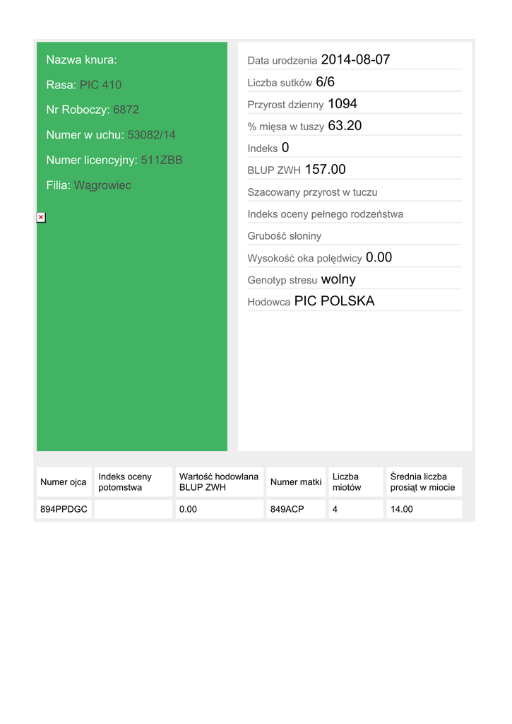 2014-08-07 Nazwa knura: Data urodzenia Rasa: PIC 410 Liczba sutków Nr Roboczy: 6872 Przyrost dzienny 1094 % mięsa w tuszy 63.20 Numer w uchu: 53082/14 Numer licencyjny: 511ZBB Filia: Wągrowiec Indeks 6/6 0 BLUP ZWH 157.00 Szacowany przyrost w tuczu Indeks oceny pełnego rodzeństwa Grubość słoniny Wysokość oka polędwicy Genotyp stresu Hodowca Numer ojca 894PPDGC Indeks oceny potomstwa 0.00 wolny PIC POLSKA Wartość hodowlana BLUP ZWH Numer matki Liczba miotów Średnia liczba prosiąt w miocie 0.00 849ACP 4 14.00