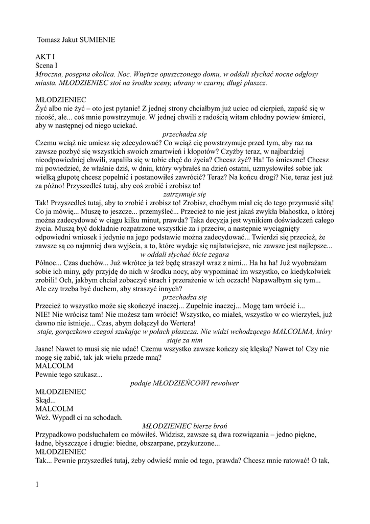 Tomasz Jakut SUMIENIE AKT I Scena I Mroczna, posępna okolica. Noc. Wnętrze opuszczonego domu, w oddali słychać nocne odgłosy miasta. MŁODZIENIEC stoi na środku sceny, ubrany w czarny, długi płaszcz. MŁODZIENIEC Żyć albo nie żyć – oto jest pytanie! Z jednej strony chciałbym już uciec od cierpień, zapaść się w nicość, ale... coś mnie powstrzymuje. W jednej chwili z radością witam chłodny powiew śmierci, aby w następnej od niego uciekać. przechadza się Czemu wciąż nie umiesz się zdecydować? Co wciąż cię powstrzymuje przed tym, aby raz na zawsze pozbyć się wszystkich swoich zmartwień i kłopotów? Czyżby teraz, w najbardziej nieodpowiedniej chwili, zapaliła się w tobie chęć do życia? Chcesz żyć? Ha! To śmieszne! Chcesz mi powiedzieć, że właśnie dziś, w dniu, który wybrałeś na dzień ostatni, uzmysłowiłeś sobie jak wielką głupotę chcesz popełnić i postanowiłeś zawrócić? Teraz? Na końcu drogi? Nie, teraz jest już za późno! Przyszedłeś tutaj, aby coś zrobić i zrobisz to! zatrzymuje się Tak! Przyszedłeś tutaj, aby to zrobić i zrobisz to! Zrobisz, choćbym miał cię do tego przymusić siłą! Co ja mówię... Muszę to jeszcze... przemyśleć... Przecież to nie jest jakaś zwykła błahostka, o której można zadecydować w ciągu kilku minut, prawda? Taka decyzja jest wynikiem doświadczeń całego życia. Muszą być dokładnie rozpatrzone wszystkie za i przeciw, a następnie wyciągnięty odpowiedni wniosek i jedynie na jego podstawie można zadecydować... Twierdzi się przecież, że zawsze są co najmniej dwa wyjścia, a to, które wydaje się najłatwiejsze, nie zawsze jest najlepsze... w oddali słychać bicie zegara Północ... Czas duchów... Już wkrótce ja też będę straszył wraz z nimi... Ha ha ha! Już wyobrażam sobie ich miny, gdy przyjdę do nich w środku nocy, aby wypominać im wszystko, co kiedykolwiek zrobili! Och, jakbym chciał zobaczyć strach i przerażenie w ich oczach! Napawałbym się tym... Ale czy trzeba być duchem, aby straszyć innych? przechadza się Przecież to wszystko może się skończyć inaczej... Zupełnie inaczej... Mogę tam wrócić i... NIE! Nie wrócisz tam! Nie możesz tam wrócić! Wszystko, co miałeś, wszystko w co wierzyłeś, już dawno nie istnieje... Czas, abym dołączył do Wertera! staje, gorączkowo czegoś szukając w połach płaszcza. Nie widzi wchodzącego MALCOLMA, który staje za nim Jasne! Nawet to musi się nie udać! Czemu wszystko zawsze kończy się klęską? Nawet to! Czy nie mogę się zabić, tak jak wielu przede mną? MALCOLM Pewnie tego szukasz... podaje MŁODZIEŃCOWI rewolwer MŁODZIENIEC Skąd... MALCOLM Weź. Wypadł ci na schodach. MŁODZIENIEC bierze broń Przypadkowo podsłuchałem co mówiłeś. Widzisz, zawsze są dwa rozwiązania – jedno piękne, ładne, błyszczące i drugie: biedne, obszarpane, przykurzone... MŁODZIENIEC Tak... Pewnie przyszedłeś tutaj, żeby odwieść mnie od tego, prawda? Chcesz mnie ratować! O tak, 1 nagle znalazł się człowiek, który chce mnie uratować! No, śmiało! Przekonaj mnie... MALCOLM Och, nie... Nie jestem tutaj, aby cię od czegokolwiek odwodzić. Decyzja należy tylko i wyłącznie do ciebie. MŁODZIENIEC przykłada rewolwer do skroni Dobrze, bo ja już zadecydowałem... MALCOLM Chciałbym natomiast dowiedzieć się co skłoniło cię do tego... MŁODZIENIEC Bywaj zdrów! naciska spust, iglica trzaska sucho Co jest? MALCOLM Pewnie się zaciął. Może jednak opowiesz mi czemu w ogóle chcesz to zrobić? MŁODZIENIEC Po co? Posłuchasz, uśmiechniesz się i pogłaszczesz mnie po głowie? Albo walniesz kazanie? Nie, ja już postanowiłem... MALCOLM I nie chcę zmienić twojego postanowienia. Widzisz, ja nie osądzam ludzkich czynów. Ja po prostu zawsze chcę wiedzieć: czemu? Interesują mnie motywy pchające ludzi do zrobienia tego, co robią. MŁODZIENIEC Nie chcesz mnie przekonywać? MALCOLM Nie. Przekonywanie ludzi do postąpienia wbrew ich własnym odczuciom jeszcze nigdy nie poskutkowało i raczej nie poskutkuje. Jeśli chcesz się zabić, zrobisz to – nie będę ci przeszkadzał. Chcę jedynie wiedzieć czemu. MŁODZIENIEC Dziwny z ciebie człowiek... MALCOLM Dziwny? Nie, ja po prostu chcę wszystko wiedzieć! I żeby osiągnąć ten cel, muszę poznać twoją historię. MŁODZIENIEC Dlaczego miałbym ci ją zdradzić? Widzę cię pierwszy raz w życiu, nie znam cię, nic o tobie nie wiem... MALCOLM I właśnie dlatego możesz mi powiedzieć wszystko, co tylko uwiera twą duszę. Możesz powierzyć mi wszystkie swoje sekrety i tajemnice, nie bojąc się, że komukolwiek je wyjawię. Możesz mieć równocześnie pewność, że nigdy więcej się nie spotkamy. MŁODZIENIEC To śmieszne! Obcemu człowiekowi mam powierzyć wszystkie swoje sekrety? MALCOLM Jeśli nie mogłeś powierzyć ich najbliższym, to komu je powierzysz? MŁODZIENIEC Komu... Ha! Właśnie: komu? Nie mam przecież nikogo... Ale czy będziesz słuchał? MALCOLM W słuchaniu jestem najlepszy. MŁODZIENIEC podchodzi do okna Chcesz poznać moją historię, tak? W takim razie słuchaj! 2 SCENA II Pokój jadalny wielkiej willi. Przyjęcie, pełno gości. Suto zastawione stoły, wszędzie LOKAJE usługujący GOŚCIOM. Gwar. MALCOLM i MŁODZIENIEC przechadzają się po sali, niewidziani przez nikogo, podobni duchom. Podchodzą do HRABIEGO i HRABINY. HRABIA Lord Sylvandell jak zawsze nie zawiódł. Każde z jego przyjęć jest niezwykle huczne i pełne wdzięku. HRABINA O tak! Na niego zawsze można liczyć. Jeśli trzeba zorganizować uroczystość, to zawsze myślę o nim. HRABIA Niesamowite jak ten człowiek ma wysublimowany gust. Nie mogę doczekać się programu artystycznego... MALCOLM i MŁODZIENIEC oddalają się od nich MŁODZIENIEC Oto i mój dom rodzinny – wielka i wspaniała willa od wieków należąca do rodu Sylvandellów. MALCOLM Miałeś zaiste królewskie życie... MŁODZIENIEC Królewskie? Sądzi