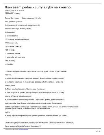Ikan asam pedas - curry z ryby na kwasno Dodano: 2000-01-01 00:00:00 Język: Polski Odwiedzono: 1314 razy. Porcja dla 4 osob. Czas przygotow. 50 min. 500 g filetow rybnych, 8-12 suszonych czerwonych papryczek chilli, kawalek swiezego imbiru (5 mm), 6-8 szalotek, 3 zabki czosnku, 1/2 lyzeczki pasty krewetkowej, 1/2 lyzeczki soli, 1/2 lyzeczki kurkumy, 125 ml oleju, 1 czerwona cebula, 4 lyzki soku cytrynowego, 185 ml wody, sol, cukier. 1. Suszone papryczki zalac ciepla woda i moczyc przez 15 min. Wyjac i usunac nasiona. 2. Imbir i czosnek obrac. Papryczki, szalotki, imbir i czosnek drobno pokroic, a nastepnie przelozyc do mozdzierza. Dodac paste krewetkowa i utrzec na gladka mase. 3. Filety oplukac i osuszyc. Natrzec sola i kurkuma. 4. Olej rozgrzac w garnku, smazyc filety na zloty kolor przez 2 min. z kazdej strony. Wyjac na talerz i odstawic. 5. Cebule obrac i pokroic na plasterki. Olej wylac z garnka, pozostawiajac na dnie niewielka ilosc. Dodac cebule i usmazyc na zloty kolor. Dodac paste, dobrze wymieszac, zmniejszyc ogien i smazyc przez 2-3 min. Dodac sok cytrynowy oraz wode i gotowac przez minute. Nastepnie dodac sol oraz odrobine cukru. 6. Filety z powrotem przelozyc do garnka i gotowac, az beda miekkie (ok.15min). Źródło: Encyklopedia sztuki kulinarnej, tom 17 "Kuchnie Dalekiego Wschodu", strona 34. From: [email protected] (Radku's De Apaczu's) Wirtualna Kuchni@ Polska - http://kuchnia.now.pl przepis nr 5777, plik wygenerowano 2017.03.08 02:41 1z2 Wirtualna Kuchni@ Polska - http://kuchnia.now.pl przepis nr 5777, plik wygenerowano 2017.03.08 02:41 2z2