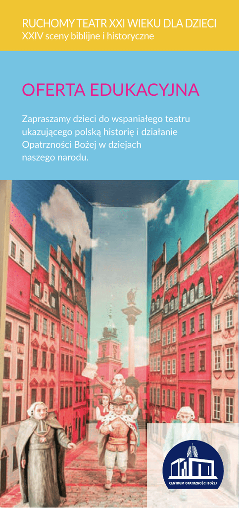 RUCHOMy TEATR XXI WIEKU DLA DZIECI XXIV sceny biblijne i historyczne OfERTA EDUKACyJnA Zapraszamy dzieci do wspaniałego teatru ukazującego polską historię i działanie Opatrzności Bożej w dziejach naszego narodu. EDUKACJA Ruchomy Teatr XXI wieku dla dzieci to wspaniała lekcja historii, religii i sztuki w jednym. Atrakcyjna oprawa teatralna wprowadza dzieci w fascynujący świat historii, dostarczając im niezapomnianych przeżyć oraz potężnej dawki wiedzy. To spektakularne połączenie tradycji i nowoczesności ukazuje, w jaki sposób nad Polską czuwała Opatrzność Boża. Forma teatru dostosowana jest do młodego wieku odbiorcy. Figurki teatralne zachwycają precyzją wykonania. Obrotowe sceny, poruszające się lalki, scenografia, gra świateł, muzyka oraz ciekawie opowiadana przez narratora historia wprowadzają w tematykę działania Bożej Opatrzności na tle dziejów Polski tak, że trudno się od niej oderwać zarówno dziecku, jak i osobie dorosłej. Po obejrzeniu spektaklu na widzów czeka niespodzianka! Przez moment poczują się jak aktorzy i staną na deskach teatru. Ruchomy Teatr XXI wieku dla dzieci na 45 minut przenosi widza w czasy od stworzenia świata do odzyskania przez Polskę niepodległości. InnOWACJA Ruchomy Teatr XXI wieku to interaktywne narzędzie edukacyjne przygotowane z myślą o dzieciach w wieku od 4 do 12 lat. Historia Polski w perspektywie działania Opatrzności Bożej jest przedstawiona: • • • • w 3 aktach, w 24 kolorowych scenach teatralnych, od stworzenia świata aż po czasy współczesne, za pomocą 200 precyzyjnie wyrzeźbionych lalek, dzięki doskonale przygotowanej i przedstawionej narracji. JAK I KIEDy? Spektakle: codziennie w godz. od 10:00 do 17:00 Liczba osób w grupie powinna mieć minimum 10 osób, a maksymalnie 25 osób. Ceny biletów wstępu do Teatru XXI wieku dla dzieci: ulgowy dla dziecka – 2 zł normalny dla osoby dorosłej – 4 zł rodzinny – 10 zł grupowy (grupa do 25 os.) – 50 zł Czas spektaklu: 45 min Ceny biletów łączonych (zwiedzanie Teatru i Panteonu Wielkich Polaków): ulgowy dla dziecka – 5 zł normalny dla osoby dorosłej – 7 zł rodzinny – 14 zł grupowy (grupa do 25 os.) – 80 zł Czas zwiedzania: 75 min Bilety do nabycia w Punkcie Informacyjnym Centrum Opatrzności Bożej Dla grup zorganizowanych z dziećmi niepełnosprawnymi bądź wychowującymi się w domach dziecka lub innych placówkach opiekuńczych – wstęp jest bezpłatny. Zgłoszenia grup przyjmujemy pod adresem: [email protected] lub telefonicznie: 22 201 97 12 www.dladzieci.centrumopatrznosci.pl MECENAS STRATEGICZNY Ruchomego Teatru XXI wieku TWÓRCY Twórcy projektu: Centrum Opatrzności Bożej Generalny wykonawca: SOS MUSIC spółka jawna Koncepcja artystyczna, scenariusz: Zbigniew Lisowski, Wojciech Zaguła Reżyseria: Zbigniew Lisowski Scenografia, projekty lalek: Mikołaj Malesza Automatyka scen i lalek: ABM Space Education sp. z o.o. Narracja: Zbigniew Lisowski oraz Malina Prześluga Muzyka: Grzegorz Urban Projekt powstał w konsultacji: Ks. Janusz Stańczuk, Muzeum Jana Pawła II i Prymasa Wyszyńskiego, Wydział Duszpasterstwa Ogólnego Archidiecezji Warszawskiej LOKALIZACJA Ruchomy Teatr XXI wieku dla dzieci znajduje się w otoczeniu Panteonu Wielkich Polaków w Świątyni Opatrzności Bożej. Panteon stanowi miejsce pochówku osób wybitnych, których świadectwo życia wpisuje się głęboko w historię naszego kraju. W Panteonie znajdują się również relikwie świętych i błogosławionych: św. Jana Pawła II, św. Andrzeja Boboli, bł. Jerzego Popiełuszki oraz bł. Edmunda Bojanowskiego. Zwiedzaniu Panteonu towarzyszy opowieść o historii budowy Świątyni Opatrzności Bożej. Jak dojechać? ul. Ks. Prymasa Augusta Hlonda 1 02-972 Warszawa Wilanów Dojazd: A Aleja Nie i łośc g podle zak Hlo a nd Kli A sa ma ka ows Wil an mc ta Ks M ry .P kie ms zoli ero J leje Centrum M Puławska ka ows załk s Mar Wilanowska iak Czern ego ski bie So ja Ale ej olit osp zyp c e Rz us ug owska Ale ja i ws Po a k ńs a icz tn ier W a Autobus linii 217 z Metra Wilanowska, przystanek: Świątynia Opatrzności Bożej; Autobus linii 522 z Metra Centrum, przystanek: Świątynia Opatrzności Bożej. Lokalizacja i otoczenie Centrum Opatrzności Bożej umożliwia zorganizowanie całodniowej wycieczki klasowej. W okolicy znajdują się: Pałac i ogród w Wilanowie, wa ółko Ogród Botaniczny ycz Prz w Powsinie.