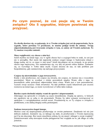 www.tworzenierelacji.pl https://web.facebook.com/tworzenierelacji/ Po czym poznać, że coś psuje się w Twoim związku? Oto 5 sygnałów, którym powinnaś się przyjrzeć. Za chwilę dowiesz się, co pokazuje, że w Twoim związku jest coś do poprawienia. Są to sygnały, które powinny Ci przekazać, że musisz podjąć kroki do zmiany. Twoją odpowiedzialnością jest tworzenie związku w tym, co zależy od Twoich zachowań. To Ty możesz wszystko zmienić. Masz wątpliwości, czy chcesz z nim być. Jeżeli myślisz na temat tego, czy w ogóle chcesz być u czyjegoś boku to znak, że coś jest nie w porządku. Być może tak naprawdę szukasz czegoś innego w budowaniu relacji z drugą osobą, niż to, co masz w niej teraz? Jeżeli decydujesz się na związek, to po prostu chcesz tego mężczyzny. Nie zastanawiasz się, czy aby na pewno robisz dobrze. Zastanów się, co wywołuje w Tobie takie myśli. Często dociera do nas, że taki problem jest bezpodstawny, gdy zastanowimy się nad jego przyczynami. Czujesz się nieswobodnie w jego towarzystwie. Kiedy z nim przebywasz, nie czujesz się otwarta, nie czujesz, że możesz mu o wszystkim powiedzieć. Może to wynikać z różnic powstałych między Wami, albo z tego, że przestaliście sobie poświęcać odpowiednio dużo czasu. Warto jest o tym porozmawiać, wyrazić swoje uczucia i brak otwartości. Na taki problem często lekarstwem jest szczera rozmowa na temat tego, co może wywoływać u Ciebie takie reakcje. Bardzo często dochodzi między wami do sporów i nieporozumień. Zdarzające się sprzeczki w związku są często nieuniknione. Znajdą się sprawy, w których nie zgodzicie się ze sobą w stu procentach. Ważne, by takie sytuacje rozwiązywać ze spokojem i z uwzględnieniem swoich uczuć. Przedstawiaj to, co Ty czujesz w związku z problemem, a nie atakuj drugiej osoby pretensjami. Szukasz towarzystwa kogoś innego. Możesz czuć się nieprzyjemnie przebywając ze swoim partnerem. Znudzenie też nie jest dobrym znakiem. Zastanów się, co takiego się stało, że przebywanie z Twoim mężczyzną już Cię nie ekscytuje. Być może straciliście ochotę, by się starać i ubiegać o swoje względy? Zainteresowanie sobą nawzajem trzeba pielęgnować bez względu na to, jak długo ze sobą jesteście. Patrycja Misiewicz Wszelkie prawa zastrzeżone Copyright © www.tworzenierelacji.pl https://web.facebook.com/tworzenierelacji/ Chcesz zmieniać drugą osobę. Coś zaczęło Ci przeszkadzać. Nawet drobnostki wprawiają Cię w zdenerwowanie i tworzysz z nich problemy. Warto zadać sobie pytanie, czy Twoje reakcje mają sensowne podstawy, które rzeczywiście są uciążliwe. Przyjrzyj się swojemu partnerowi pod kątem tego, co ma w sobie wspaniałego. Co sprawiło, że go pokochałaś? Jakie ma w sobie cechy, które uwielbiasz? Takie odpowiednie pytania mogą rzucić całkowicie inne światło na to, co tak naprawdę do niego czujesz. Oczywiście w każdej z tych spraw, powinnaś popatrzeć najpierw na siebie, czy to Ty nie wywołałaś niektórych stanów, a druga osoba nie jest tak naprawdę niczemu winna. Związek musimy pielęgnować, rozmawiać o swoich obawach i obserwacjach z partnerem. Odpowiednio szczerą rozmową można sobie wszystko wyjaśnić, by móc dążyć do pracowania nad polepszeniem jakości Waszej relacji. Patrycja Misiewicz Wszelkie prawa zastrzeżone Copyright ©