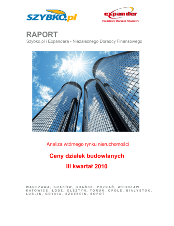RAPORT Szybko.pl i Expandera - Niezależnego Doradcy Finansowego Analiza wtórnego rynku nieruchomości Ceny działek budowlanych III kwartał 2010 WAR S Z AWA, K R AK Ó W, G D AŃ S K , P O Z N AŃ , W R O C Ł AW, K AT O W I C E , Ł Ó D Ź , O L S Z T Y N , T O R U Ń , O P O L E , B I A Ł Y S T O K , LUBLIN, GDYNIA, SZCZECIN, SOPOT 11kkkk2 W SKRÓCIE: Różnice pomiędzy najwyższym poziomem cen działek budowlanych, który w analizach www.szybko.pl przypada na I kwartał 2008 roku, a cenami najniższymi z IV kwartału 2009 wynoszą odpowiednio: -22,8% w Warszawie, -16,9% w Krakowie, -11,8% we Wrocławiu,12,8% w Gdańsku i -11,4% w Poznaniu Od początku 2010 roku zauważalny jest powolny wzrost poziomu średnich cen działek w największych miastach. Wzrost cen średnich to między innymi efekt zmiany struktury cenowej oferowanych działek. W Warszawie i Krakowie minimalna cena jest o 20 złotych wyższa na każdym metrze kwadratowym w porównaniu z I kwartałem 2010, w Gdańsku o 12 złotych, we Wrocławiu o 14 zł. W Warszawie nadal najłatwiej jest znaleźć działkę w przedziale cenowym od 500 do 750 złotych za metr, stanowią one niemal 35% oferty. W Krakowie i Wrocławiu najwięcej ofert mieści się w przedziale od 300 do 500 złotych za metr kwadratowy ;a w Gdańsku i Poznaniu od 200 do 300 złotych. 11kkkk3 DZIAŁKI BUDOWLANE Warszawa, Wrocław, Kraków, Poznań, Gdańsk Na skutek kryzysu na rynku nieruchomości ceny działek budowlanych zaczęły się obniżać z pewnym opóźnieniem w stosunku do cen mieszkań. Pierwsze zauważalne spadki miały miejsce w I kwartale 2009 roku. Różnice pomiędzy najwyższym poziomem cen, który w analizach danych z www.szybko.pl przypada na I kwartał 2008 roku a cenami najniższymi z IV kwartału 2009 wynoszą odpowiednio: -22,8% w Warszawie, -16,9% w Krakowie, -11,8% we Wrocławiu,-12,8% w Gdańsku i -11,4% w Poznaniu. Od początku 2010 roku zauważalny jest powolny wzrost poziomu średnich cen działek w największych miastach. W porównaniu z I kwartałem 2010 roku średnie ceny działek budowlanych wzrosły w znacznie większym stopniu niż ceny mieszkań czy domów. Najmniejsza zmiana miała miejsce w Poznaniu +5,1% w ciągu 6 miesięcy. W Warszawie procentowa zmiana wynosi 7,5%, ale przekłada się to na 60 złotych podwyżki na każdym metrze. Podobnie jest we Wrocławiu, Gdańsku czy Krakowie, gdzie w przeliczeniu na procenty wzrosty wynoszą od 15% do 20%, a kwotowo są to różnice rzędu50-60 złotych . Wzrost cen średnich to między innymi efekt zmiany struktury cenowej oferowanych działek. Z rynku zniknęły najtańsze działki, w domyśle – zostały sprzedane. W Warszawie i Krakowie minimalna cena jest o 20 złotych wyższa na każdym metrze kwadratowym w porównaniu z I kwartałem 2010, w Gdańsku o 12, we Wrocławiu o 14. Wzrost cen średnich jest efektem ożywienia na rynku budowlanym i nieruchomości. Wczesna wiosna (marzec) i jesień (wrzesień, październik) są okresami, kiedy najwięcej działek jest wystawianych do sprzedaży ale również zainteresowanie ze strony kupujących jest największe. Możemy mieć więc również do czynienia z okresowym wzrostem cen. Najatrakcyjniejsze cenowo oferty znalazły nabywców, a właściciele ziemi słysząc o poprawie koniunktury i licząc na wzrost popytu nie są już skłoni wystawiać ofert za ceny z jesieni zeszłego roku. Zmiany średnich cen ofertowych działek budowlanych o pow. do 5000 m2 WARSZAWA KRAKÓW WROCŁAW GDAŃSK POZNAŃ III KWARTAŁ 2009 od 70 do 3150 830 od 40 do 1540 340 od 45 do 1380 280 od 40 do 1240 280 od 60 d0 1330 400 IV KWARTAŁ 2009 od 60 do 3100 795 od 47 do 1580 320 od 40 do 1370 270 od 50 do 1300 300 od 70 do 1370 380 I KWARTAŁ 2010 od 60 do 3150 800 od 40 do 1600 330 od 43 do 1200 300 od 48 do 900 300 od 90 do 1200 390 II KWARTAŁ 2010 od 76 do 3500 855 od 45 do 1400 375 od 45 do 1100 320 od 57 do 1000 320 od 80 do 1250 400 III KWARTAŁ 2010 od 80 do 3500 860 od 60 do 1490 380 od 57 do 1400 360 od 60 do 1490 350 od 90 do 1400 410 Źródło: Raport Szybko.pl i Expandera STRUKTURA CENOWA OFERTY DZIAŁEK BUDOWLANYCH W Warszawie nadal najłatwiej jest znaleźć działkę w przedziale cenowym od 500do 750 złotych za metr, stanowią one niemal 35% oferty. Zdecydowanie zmniejszyła się natomiast dostępność działek poniżej 500 złotych za metr. W I kwartale było to ponad 25% wszystkich ofert, obecnie około 12%. Więcej jest natomiast działek w cenie od 1000 do 1500 złotych i powyżej 2000 złotych za metr. Udział takich ofert zwiększył się odpowiednio o 9.5 punktu procentowego i 7,7 p.p. 11kkkk4 W Krakowie struktura cenowa ofert uległa jeszcze większym zmianom. Na początku 2010 roku aż 65,4% oferowanych na sprzedaż działek budowlanych kosztowała mniej niż 300 złotych za metr kwadratowy. Obecnie udział ten skurczył się do 25,8%, a najłatwiej jest znaleźć ofertę w przedziale od 300 do 500 złotych za metr kwadratowy. We Wrocławiu, gdzie średnia cena wynosi 360 złotych za metr kwadratowy, aktualnie 31,2% ofert mieści się w przedziale od 300 do 500 złotych i stanowi największy udział w całości oferty. W I kwartale udział tego rzędu dotyczył ofert w przedziale pomiędzy 100 a 200 złotych za metr. O 7,5 punktu procentowego zwiększyła się liczebność grupy działek najdroższych, w cenie powyżej 1000 złotych za metr kwadratowy. W Gdańsku działek w cenie do 150 złotych jest niemal trzy razy mniej niż na początku roku, a niemal 50% całości podaży stanowią działki w cenie od 200 do 300 złotych za metr. W Poznaniu sytuacja jest najbardziej stabilna, ceny średnie utrzymują się na poziomie rzędu 400 złotych za metr już od dwóch lat, więc również struktura cenowa podaży pozostaje niezmieniona. Struktura cenowa oferty działek budowlanych w III kwartale 2010 do 250 250-500 500-750 750-1000 1000-1500 1500-2000 pow. 2000 0,9% 11,2% 34,9% 21,2% 16,7% 5,8% 10,3% do 100 100-200 200-300 300-