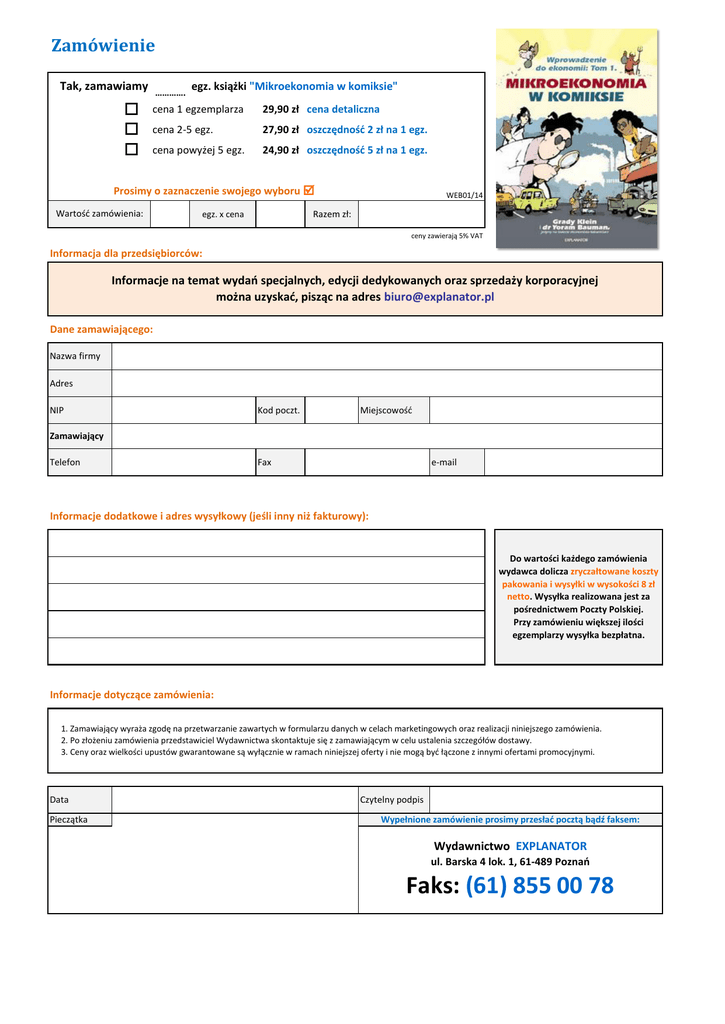 Zamówienie Tak, zamawiamy o o o …………. egz. książki "Mikroekonomia w komiksie" cena 1 egzemplarza 29,90 zł cena detaliczna cena 2-5 egz. 27,90 zł oszczędność 2 zł na 1 egz. cena powyżej 5 egz. 24,90 zł oszczędność 5 zł na 1 egz. Prosimy o zaznaczenie swojego wyboru Wartość zamówienia: WEB01/14 Razem zł: egz. x cena ceny zawierają 5% VAT Informacja dla przedsiębiorców: Informacje na temat wydań specjalnych, edycji dedykowanych oraz sprzedaży korporacyjnej można uzyskać, pisząc na adres [email protected] Dane zamawiającego: Nazwa firmy Adres NIP Kod poczt. Miejscowość Zamawiający Telefon Fax e-mail Informacje dodatkowe i adres wysyłkowy (jeśli inny niż fakturowy): Do wartości każdego zamówienia wydawca dolicza zryczałtowane koszty pakowania i wysyłki w wysokości 8 zł netto. Wysyłka realizowana jest za pośrednictwem Poczty Polskiej. Przy zamówieniu większej ilości egzemplarzy wysyłka bezpłatna. Informacje dotyczące zamówienia: 1. Zamawiający wyraża zgodę na przetwarzanie zawartych w formularzu danych w celach marketingowych oraz realizacji niniejszego zamówienia. 2. Po złożeniu zamówienia przedstawiciel Wydawnictwa skontaktuje się z zamawiającym w celu ustalenia szczegółów dostawy. 3. Ceny oraz wielkości upustów gwarantowane są wyłącznie w ramach niniejszej oferty i nie mogą być łączone z innymi ofertami promocyjnymi. Data Pieczątka Czytelny podpis Wypełnione zamówienie prosimy przesłać pocztą bądź faksem: Wydawnictwo EXPLANATOR ul. Barska 4 lok. 1, 61-489 Poznań Faks: (61) 855 00 78
