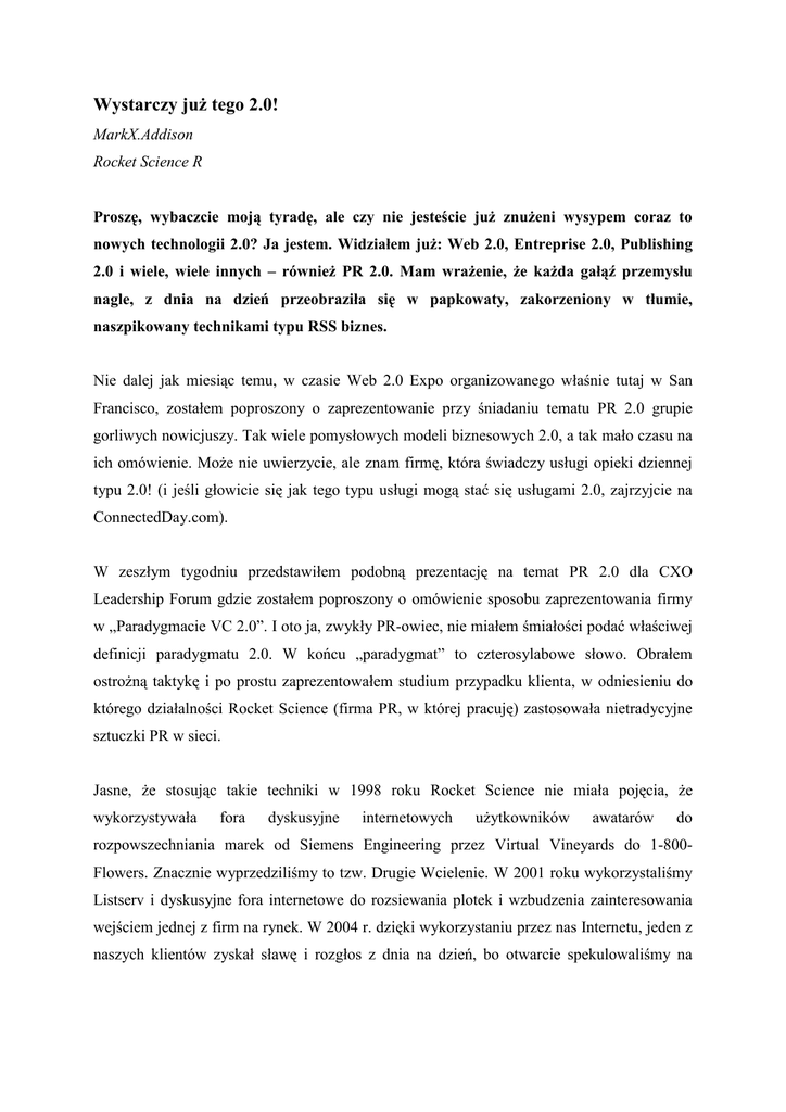 Wystarczy juŜ tego 2.0! MarkX.Addison Rocket Science R Proszę, wybaczcie moją tyradę, ale czy nie jesteście juŜ znuŜeni wysypem coraz to nowych technologii 2.0? Ja jestem. Widziałem juŜ: Web 2.0, Entreprise 2.0, Publishing 2.0 i wiele, wiele innych – równieŜ PR 2.0. Mam wraŜenie, Ŝe kaŜda gałąź przemysłu nagle, z dnia na dzień przeobraziła się w papkowaty, zakorzeniony w tłumie, naszpikowany technikami typu RSS biznes. Nie dalej jak miesiąc temu, w czasie Web 2.0 Expo organizowanego właśnie tutaj w San Francisco, zostałem poproszony o zaprezentowanie przy śniadaniu tematu PR 2.0 grupie gorliwych nowicjuszy. Tak wiele pomysłowych modeli biznesowych 2.0, a tak mało czasu na ich omówienie. MoŜe nie uwierzycie, ale znam firmę, która świadczy usługi opieki dziennej typu 2.0! (i jeśli głowicie się jak tego typu usługi mogą stać się usługami 2.0, zajrzyjcie na ConnectedDay.com). W zeszłym tygodniu przedstawiłem podobną prezentację na temat PR 2.0 dla CXO Leadership Forum gdzie zostałem poproszony o omówienie sposobu zaprezentowania firmy w „Paradygmacie VC 2.0”. I oto ja, zwykły PR-owiec, nie miałem śmiałości podać właściwej definicji paradygmatu 2.0. W końcu „paradygmat” to czterosylabowe słowo. Obrałem ostroŜną taktykę i po prostu zaprezentowałem studium przypadku klienta, w odniesieniu do którego działalności Rocket Science (firma PR, w której pracuję) zastosowała nietradycyjne sztuczki PR w sieci. Jasne, Ŝe stosując takie techniki w 1998 roku Rocket Science nie miała pojęcia, Ŝe wykorzystywała fora dyskusyjne internetowych uŜytkowników awatarów do rozpowszechniania marek od Siemens Engineering przez Virtual Vineyards do 1-800Flowers. Znacznie wyprzedziliśmy to tzw. Drugie Wcielenie. W 2001 roku wykorzystaliśmy Listserv i dyskusyjne fora internetowe do rozsiewania plotek i wzbudzenia zainteresowania wejściem jednej z firm na rynek. W 2004 r. dzięki wykorzystaniu przez nas Internetu, jeden z naszych klientów zyskał sławę i rozgłos z dnia na dzień, bo otwarcie spekulowaliśmy na temat motywów jednego z przejęć firmy Oracle. Kto wtedy miał świadomość, Ŝe angaŜowaliśmy się w „media społeczne” i „PR 2.0”? Po prostu wykonywaliśmy swoją pracę. Ale muszę przyznać, Ŝe na początku byłem oczarowany fenomenem 2.0. My, ludzie ze świata PR-u i mediów nauczyliśmy się ignorować wypuszczane na rynek produkty X.5 i marne wirusowe mutacje, ale Web 2.0 nie wyglądało na nic więcej niŜ „drugie wcielenie” Internetu. Prawdziwe uaktualnienie produktów typu dot-zero. W związku z tym, chcąc na moich półboskich przyjaciołach robić wraŜenie osoby bardzo na czasie i supermodnej, poszedłem za modą na początku zeszłego roku, kiedy to snułem rozwaŜania na temat PR 2.0 na moim blogu, mówiąc jak to PR się zmienia. Nawet nie wyobraŜacie sobie jak wiele osób wysłało mi maile prosząc o kontynuowanie dyskusji. Niektóre tematy po prostu są w stanie szybciej zawładnąć wyobraźnią ludzi niŜ inne. PrzewaŜnie ludzie proponowali swoje własne wersje definicji 2.0, które skwapliwie chłonąłem. W przeszłości studiowałem filozofię, więc jak nikt inny uwielbiam powaŜne dyskusje na temat semantyki. I podąŜając za Sokratesem właściwie nie mam nic przeciwko pozostawianiu definicji otwartymi w oczekiwaniu na Ŝarliwą dyskusję ad infinitum. Ale z praktyki wiem, Ŝe inni ludzie wolą zamknięte dyskusje, więc tym wszystkim, którzy pasują do ostatniej kategorii pozwolę sobie zaproponować definicję fenomenu mediów społecznych 2.0, autorstwa prawdziwego eksperta z firmy Forrester Research - Charlene Li, współautorki ksiąŜki „Groundswell”, która całkiem nieźle oddała sens 2.0 w poniŜszym fragmencie: „... groundswell to społeczny trend w ramach którego ludzie wykorzystują dostępne technologie do uzyskania od siebie nawzajem potrzebnych informacji raczej niŜ od tradycyjnych instytucji takich jak korporacje”. Niezłe. Idąc tym śladem uznanie naleŜy się równieŜ Danowi Gillmorowi, który właściwie złamał szyfr w 2006 roku w swojej ksiąŜce „We the Media: Grassroots Journalism by the People, for the People” (wydana przez przewidujących ludzi z O’Reilly Media, tych samych, którzy zorganizowali wyŜej wspomniane Web 2.0 Expo). Nie przypominam sobie, Ŝeby Dan uŜył opisu 2.0 gdziekolwiek w swoim tekście – jest na to za mądry. Dziś, na swojej osobistej stronie internetowej, dzieli się prowokacyjnym wnioskiem: „Moi czytelnicy wiedzą o wiele więcej niŜ ja”, co tak naprawdę oddaje sens 2.0 bez uŜywanie określenia 2.0. Taki z niego spryciarz. Jak bardzo tęsknię za czasami, kiedy Dan pracował dla gazety San Jose Mercury News. Był jedynym dziennikarzem, który tak naprawdę ekscytował się nowymi technologiami i pisał o ciekawych dopiero rozwijających się firmach. Ale to tylko taka mała dygresja... Wracając do semantyki (i tematu 2.0) zapewniam was, Ŝe poziom dyskusji na temat 2.0 najpierw się pogorszy, Ŝeby potem ulec polepszeniu. A to dlatego, Ŝe podczas gdy my wszyscy marni śmiertelnicy tkwimy po uszy w 2.0, moi wspaniali przyjaciele pracują nad Web 3.0, Pozwólcie, Ŝe wymienię: Tim Berners-Lee - „Semantic Web”, Eric Schmidt – „Google cloud computing”, Jason Calacanis i jego uzdolnione jednostki oraz Nova Spivack: „machine-to-machine capabilities” – to wszystko zaleŜy od tego, kogo pytasz. Więc dość juŜ tych wszystkich 2.0! W kolejnej informacji prasowej, jaką wypuścicie przeanalizujcie jak działa Web 3.0 (lub Web X.0). To dopiero sprawi, Ŝe będzie brzmieli bardzo na czasie. Mark X. Addison jest ekspertem i CEO w firmie Rocket Science PR, oraz załoŜycielem SVASE.org. Jeśli uwaŜacie, Ŝe wasze przemyślenia są [email protected]. Artykuł był publikowany na portalu www.bulldogreporter.com warte uwagi, wyślijcie je na