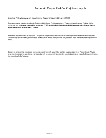 Pomorski Zespół Parków Krajobrazowych Afryka Południowa na spotkaniu Trójmiejskiej Grupy OTOP Zapraszamy na kolejne spotkanie Trójmiejskiej Grupy Ogólnopolskiego Towarzystwa Ochrony Ptaków, które odbędzie się 18 lutego (wtorek) o godzinie 17.00 w siedzibie Rady Osiedla Oliwa przy ulicy Opata Jacka Rybińskiego 10 w Gdańsku - Oliwie. W trakcie spotkania kol. Katarzyna i Krzysztof Stępniewscy ze Stacji Badania Wędrówek Ptaków Uniwersytetu Gdańskiego przedstawią prezentację pod tytułem "Akcja Bałtycka na antypodach, czyli obrączkowanie ptaków w RPA". Będzie to znakomita okazja do poznania egzotycznych gatunków ptaków występujących w Południowej Afryce oraz do dowiedzenia się, które z gniazdujących w naszym kraju ptaków spędzają zimę aż na południowym krańcu kontynentu afrykańskiego. strona 1/1 Powered by TCPDF (www.tcpdf.org)