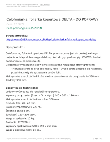 Product data have been exported from - NovumPack Export date: Wed Mar 8 2:41:25 2017 / +0100 GMT Celofoniarka, foliarka kopertowa DELTA - DO POPRAWY Cena: 12.30 Zl Cena promocyjna: 6.15 Zl PLN Strona produktu: http://novum2015.novumpack.pl/sklep/celofoniarka-foliarka-kopertowa-delta/ Opis produktu Celofoniarka, foliarka kopertowa DELTA przeznaczona jest do profesjonalnego owijania w folię celofanową pudełek np. kart do gry, perfum, płyt CD DVD, herbat, bombonierek, papierosów, itp. Urządzenie wyposażone jest w dwie regulowane niezależne strefy grzewcze: - Pierwsza strefa to drut odcinający folię. - Druga strefa znajduje się na panelu przednim, służy do zgrzewania boków folii. Maksymalna szerokość folii którą można zamontować do urządzenia to 380 mm i średnicy 300 mm. Specyfikacja techniczna: Ledowy wyświetlacz do regulacji temperatury. Wymiary urządzenia: [Szer. x Dł. x Wys. ] 440 x 500 x 190 mm. Maksymalna szerokość folii na rolce: 300 mm. Grubość folii: 20 - 40 mic. Zakres temperatury: 0-220 °C. Średnica gilzy: 8 cm. Szybkość: 120~200 szt/h. Waga urządzenia: 10 kg. Zasilanie: 220V/50Hz. Wymiary opakowania: 560 x 590 x 250 mm. Waga z opakowaniem: 14 kg.. [ Export product details as PDF file has been powered by WooCommerce PDF & Print plugin. ] | Page 1/2 | Product data have been exported from - NovumPack Export date: Wed Mar 8 2:41:25 2017 / +0100 GMT Zawartość zestawu: Urządzenie. Dodatkowy drut tnący. 3 Bezpieczniki. Klucz imbusowy 6mm. Klucz płaski 13mm. Podzespoły. Instrukcja obsługi. Gwarancja 12 miesięcy. Certyfikat CE. Specyfikacja - Długość zgrzewu: 300 - Szerokość wykonywanego zgrzewu: 1 mm - Zasilanie: 230V 50Hz - Metoda zgrzewania: stałocieplna - Gwarancja: 12 m-cy [ Export product details as PDF file has been powered by WooCommerce PDF & Print plugin. ] | Page 2/2 |