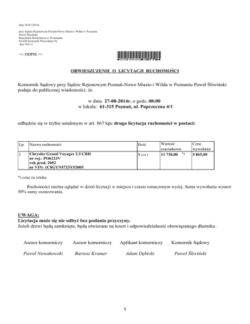 dnia 30-07-2014r. przy Sądzie Rejonowym Poznań-Nowe Miasto i Wilda w Poznaniu Paweł Śliwiński Kancelaria Komornicza w Swarzędzu 62-020 Swarzędz Wrzesińska 9a Km 763/11 *0020000806779* << ODPIS >> OBWIESZCZENIE O LICYTACJI RUCHOMOŚCI Komornik Sądowy przy Sądzie Rejonowym Poznań-Nowe Miasto i Wilda w Poznaniu Paweł Śliwiński podaje do publicznej wiadomości, że w dniu 27-08-2014r. o godz. 08:00 w lokalu: 61-315 Poznań, ul. Poprzeczna 4/1 odbędzie się w trybie ustalonym w art. 867 kpc druga licytacja ruchomości w postaci: Lp. Nazwa ruchomości Ilość 1 Chrysler Grand Voyager 2.5 CRD nr rej.: PO622JV rok prod. 2002 nr VIN: 1C8GYN5723Y52005 1 [szt.] Wartość szacunkowa 11 730,00 *) Cena wywołania 5 865,00 *) cena za sztukę Ruchomości można oglądać w dzień licytacji w miejscu i czasie oznaczonym wyżej. Suma wywołania wynosi 50% sumy oszacowania. UWAGA: Licytacja może się nie odbyć bez podania przyczyny. Jeżeli drzwi będą zamknięte, będą otwierane na koszt i odpowiedzialność obowiązanego dłużnika . Asesor komorniczy Asesor komorniczy Aplikant komorniczy Komornik Sądowy Paweł Nowakowski Bartosz Kramer Adam Dębicki Paweł Śliwiński 1 2