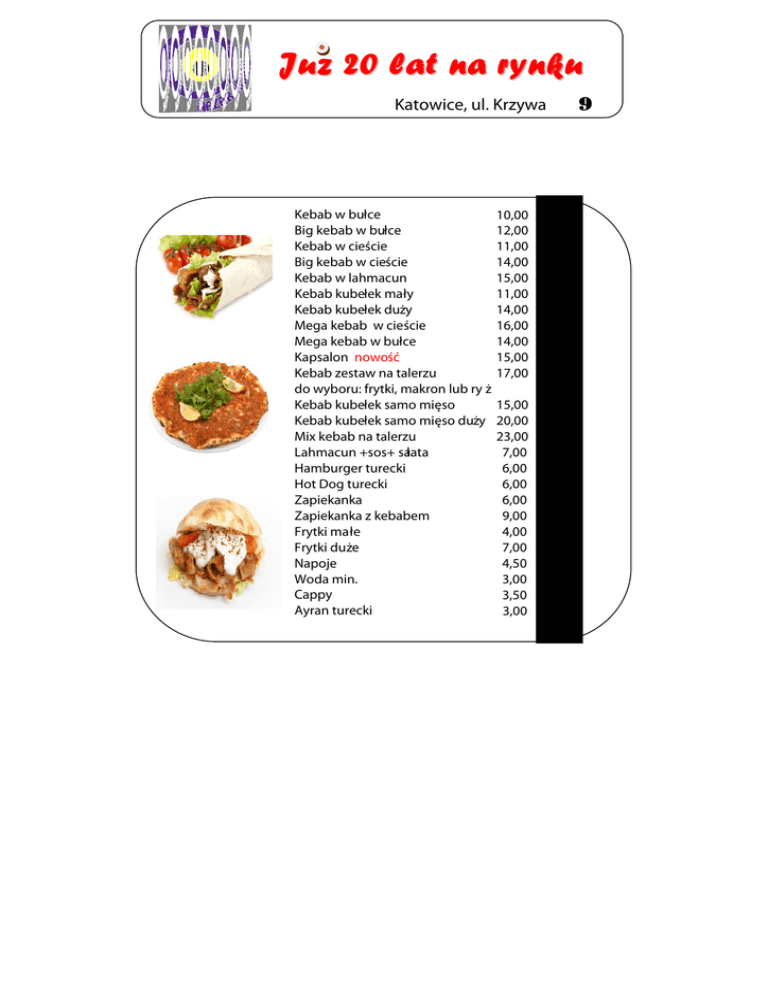 Juz 20 lat na rynku Katowice, ul. Krzywa Kebab w bułce Big kebab w bułce Kebab w cieście Big kebab w cieście Kebab w lahmacun Kebab kubełek mały Kebab kubełek duży Mega kebab w cieście Mega kebab w bułce Kapsalon nowość Kebab zestaw na talerzu do wyboru: frytki, makron lub ry ż Kebab kubełek samo mięso Kebab kubełek samo mięso duży Mix kebab na talerzu Lahmacun +sos+ sałata Hamburger turecki Hot Dog turecki Zapiekanka Zapiekanka z kebabem Frytki małe Frytki duże Napoje Woda min. Cappy Ayran turecki www.nazar-kebab.pl 10,00 12,00 11,00 14,00 15,00 11,00 14,00 16,00 14,00 15,00 17,00 15,00 20,00 23,00 7,00 6,00 6,00 6,00 9,00 4,00 7,00 4,50 3,00 3,50 3,00 9