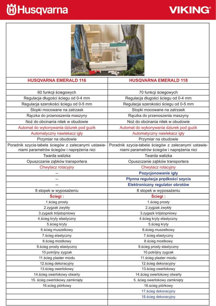 HUSQVARNA EMERALD 116 HUSQVARNA EMERALD 118 60 funkcji ściegowych Regulacja długości ściegu od 0-4 mm Regulacja szerokości ściegu od 0-5 mm Stopki mocowane na zatrzask Rączka do przenoszenia maszyny 70 funkcji ściegowych Regulacja długości ściegu od 0-4 mm Regulacja szerokości ściegu od 0-5 mm Stopki mocowane na zatrzask Rączka do przenoszenia maszyny Noż do obcinania nitek w obudowie Noż do obcinania nitek w obudowie Automat do wykonywania dziurek pod guzik Automat do wykonywania dziurek pod guzik Automatyczny nawlekacz igły Automatyczny nawlekacz igły Przymiar na obudowie Przymiar na obudowie Poradnik szycia-tabela ściegów z zalecanymi ustawie- Poradnik szycia-tabela ściegów z zalecanymi ustawieniami parametrów ściegów i naprężenia nici niami parametrów ściegów i naprężenia nici Twarda walizka Twarda walizka Opuszczanie ząbków transportera Opuszczanie ząbków transportera Chwytacz rotacyjny Chwytacz rotacyjny -Pozycjonowanie igły -Płynna regulacja prędkości szycia -Elektroniczny regulator obrotów 8 stopek w wyposażeniu 8 stopek w wyposażeniu Ściegi : Ściegi : 1.ścieg prosty 1.ścieg prosty 2.zygzak zwykły 2.zygzak zwykły 3.zygazk trójstopniowy 3.zygazk trójstopniowy 4.ścieg kryty elastyczny 4.ścieg kryty elastyczny 5.ścieg kryty 5.ścieg kryty 6.ścieg muszelkowy 6.ścieg muszelkowy 7.ścieg elastyczny 7.ścieg elastyczny 8.ścieg mostkowy 8.ścieg mostkowy 9.ścieg prosty elastyczny 9.ścieg prosty elastyczny 10.potrójny zygzak 10.potrójny zygzak 11.ścieg plaster miodu 11.ścieg plaster miodu 12.ścieg dekoracyjny 12.ścieg dekoracyjny 13.ścieg owerlokowy 13.ścieg owerlokowy 14.ścieg owerlokowy otwarty 14.ścieg owerlokowy otwarty 15. ścieg owerlokowy zamknięty 5. ścieg owerlokowy zamknięty 16.scieg piórkowy 16.scieg piórkowy 17.ścieg dekoracyjny 18.ścieg dekoracyjny