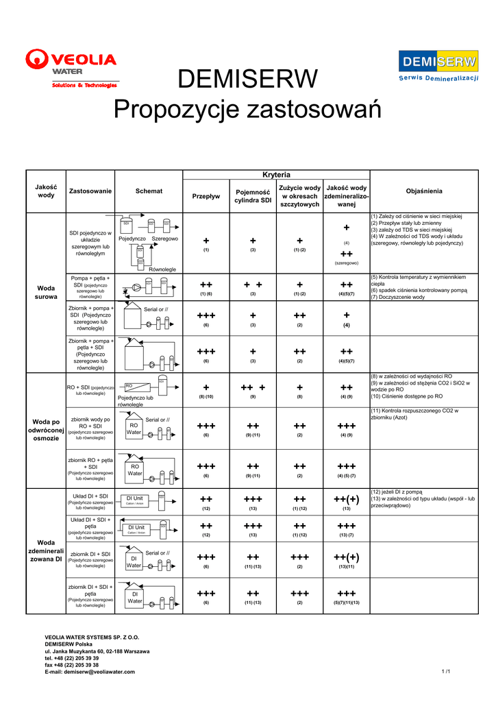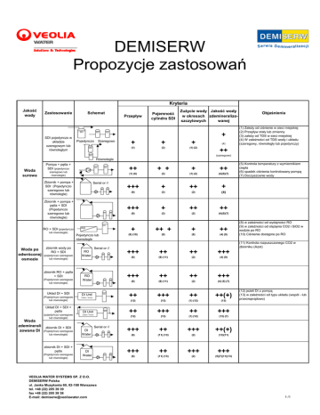 DEMISERW Propozycje zastosowań Kryteria Jakość wody Zastosowanie Schemat SDI SDI pojedynczo w układzie szeregowym lub równoległym Pojemność cylindra SDI ZuŜycie wody Jakość wody w okresach zdemineralizoszczytowych wanej SDI SDI Pojedynczo Przepływ + Szeregowo SDI + + + (1) (3) (1) (2) (4) Objaśnienia (1) ZaleŜy od ciśnienie w sieci miejskiej (2) Przepływ stały lub zmienny (3) zaleŜy od TDS w sieci miejskiej (4) W zaleŜności od TDS wody i układu (szeregowy, równoległy lub pojedynczy) ++ (szeregowo) SDI Równolegle Woda surowa Pompa + pętla + SDI (pojedynczo SDI SDI szeregowo lub równolegle) Zbiornik + pompa + SDI (Pojedynczo szeregowo lub równolegle) Serial or // SDI SD I Zbiornik + pompa + pętla + SDI (Pojedynczo szeregowo lub równolegle) SDI SDI ++ + + + ++ (1) (6) (3) (1) (2) (4)(5)(7) +++ + ++ + (6) (3) (2) (4) +++ + ++ ++ (6) (3) (2) (4)(5)(7) SDI RO + SDI (pojedynczo RO lub równolegle) Pojedynczo lub równolegle Woda po odwróconej osmozie zbiornik wody po RO + SDI (pojedynczo szeregowo lub równolegle) zbiornik RO + pętla + SDI (Pojedynczo szeregowo lub równolegle) Układ DI + SDI (Pojedyńczo szeregowo lub równolegle) Układ DI + SDI + pętla (pojedyńczo szeregowo lub równolegle) Woda zdeminerali zowana DI zbiornik DI + SDI (Pojedyńczo szeregowo lub równolegle) zbiornik DI + SDI + pętla (Pojedynczo szeregowo lub równolegle) SD I RO Water SD I SDI SDI DI Unit SDI Cation / Anion DI Unit SDI Cation / Anion Serial or // DI Water DI Water VEOLIA WATER SYSTEMS SP. Z O.O. DEMISERW Polska ul. Janka Muzykanta 60, 02-188 Warszawa tel. +48 (22) 205 39 39 fax +48 (22) 205 39 38 E-mail: [email protected] SD I SDI ++ + + ++ (9) (8) (4) (9) (8) w zaleŜności od wydajności RO (9) w zaleŜności od stęŜęnia CO2 i SiO2 w wodzie po RO (10) Ciśnienie dostępne po RO (11) Kontrola rozpuszczonego CO2 w zbiorniku (Azot) Serial or // RO Water + (8) (10) (5) Kontrola temperatury z wymiennikiem ciepła (6) spadek ciśnienia kontrolowany pompą (7) Doczyszcenie wody SD I SDI +++ ++ ++ +++ (6) (9) (11) (2) (4) (9) +++ ++ ++ +++ (6) (9) (11) (2) (4) (5) (7) ++ +++ ++ ++(+) (12) (13) (1) (12) (13) ++ +++ ++ +++ (12) (13) (1) (12) (13) (7) +++ ++ +++ ++(+) (6) (11) (13) (2) (13)(11) +++ ++ +++ +++ (6) (11) (13) (2) (5)(7)(11)(13) (12) jeŜeli DI z pompą (13) w zaleŜności od typu układu (współ - lub przeciwprądowo) 1 /1