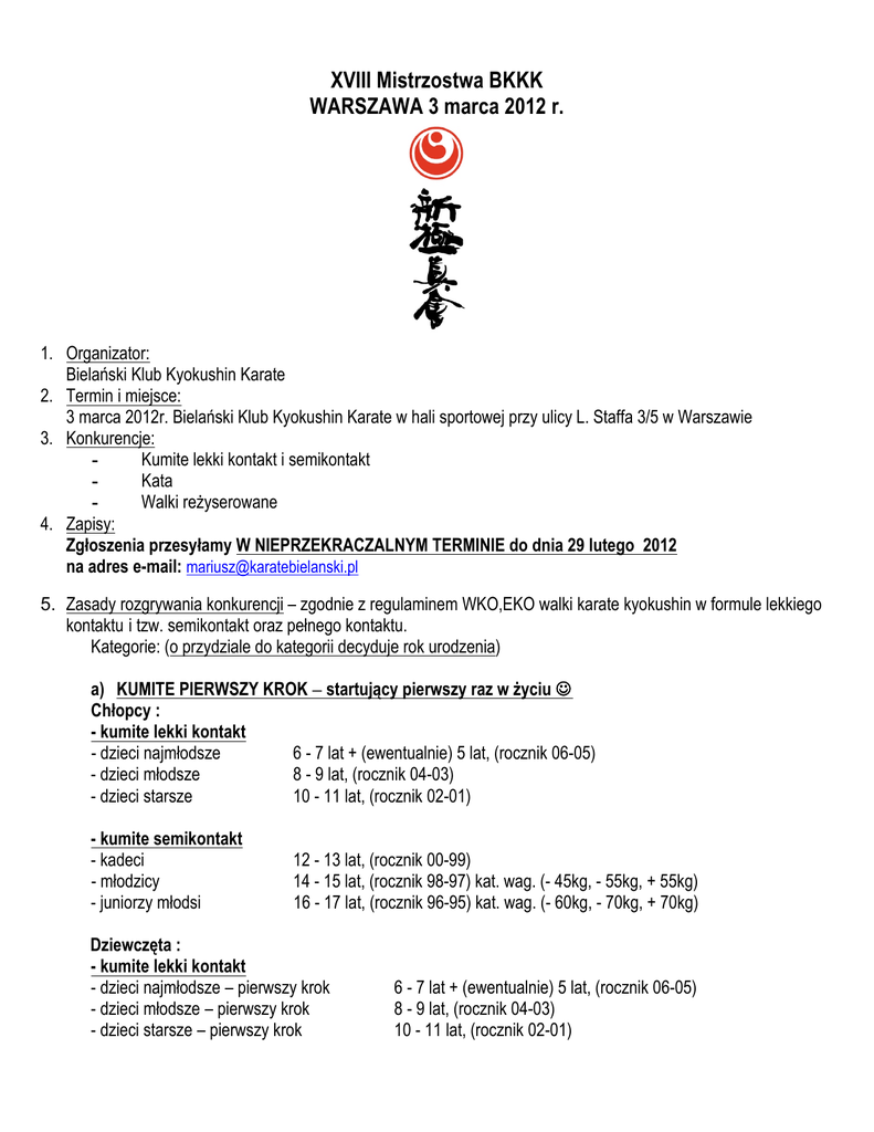 XVIII Mistrzostwa BKKK WARSZAWA 3 marca 2012 r. 1. Organizator: Bielański Klub Kyokushin Karate 2. Termin i miejsce: 3 marca 2012r. Bielański Klub Kyokushin Karate w hali sportowej przy ulicy L. Staffa 3/5 w Warszawie 3. Konkurencje: Kumite lekki kontakt i semikontakt Kata Walki reżyserowane 4. Zapisy: Zgłoszenia przesyłamy W NIEPRZEKRACZALNYM TERMINIE do dnia 29 lutego 2012 na adres e-mail: [email protected] 5. Zasady rozgrywania konkurencji – zgodnie z regulaminem WKO,EKO walki karate kyokushin w formule lekkiego kontaktu i tzw. semikontakt oraz pełnego kontaktu. Kategorie: (o przydziale do kategorii decyduje rok urodzenia) a) KUMITE PIERWSZY KROK – startujący pierwszy raz w życiu J Chłopcy : - kumite lekki kontakt - dzieci najmłodsze 6 - 7 lat + (ewentualnie) 5 lat, (rocznik 06-05) - dzieci młodsze 8 - 9 lat, (rocznik 04-03) - dzieci starsze 10 - 11 lat, (rocznik 02-01) - kumite semikontakt - kadeci - młodzicy - juniorzy młodsi 12 - 13 lat, (rocznik 00-99) 14 - 15 lat, (rocznik 98-97) kat. wag. (- 45kg, - 55kg, + 55kg) 16 - 17 lat, (rocznik 96-95) kat. wag. (- 60kg, - 70kg, + 70kg) Dziewczęta : - kumite lekki kontakt - dzieci najmłodsze – pierwszy krok - dzieci młodsze – pierwszy krok - dzieci starsze – pierwszy krok 6 - 7 lat + (ewentualnie) 5 lat, (rocznik 06-05) 8 - 9 lat, (rocznik 04-03) 10 - 11 lat, (rocznik 02-01) - kumite semikontakt - kadetki – pierwszy krok - młodziczki – pierwszy krok - juniorki młodsze – pierwszy krok 12 - 13 lat, (rocznik 00-99) 14 - 15 lat, (rocznik 98-97) kat. wag. (- 40kg, + 40kg) 16 - 17 lat, (rocznik 96-95) kat. wag. (- 50kg, + 50kg) b) KUMITE Chłopcy : - kumite lekki kontakt - dzieci najmłodsze - dzieci młodsze - dzieci starsze 6 - 7 lat + (ewentualnie) 5 lat, (rocznik 06-05) 8 - 9 lat, (rocznik 04-03) 10 - 11 lat, (rocznik 02-01) - kumite semikontakt - kadeci - młodzicy - juniorzy młodsi 12 - 13 lat, (rocznik 00-99) 14 - 15 lat, (rocznik 98-97) kat. wag. (- 45kg, - 55kg, + 55kg) 16 - 17 lat, (rocznik 96-95) kat. wag. (- 60kg, - 70kg, + 70kg) Dziewczęta : - kumite lekki kontakt - dzieci najmłodsze - dzieci młodsze - dzieci starsze 6 - 7 lat + (ewentualnie) 5 lat, (rocznik 06-05) 8 - 9 lat, (rocznik 04-03) 10 - 11 lat, (rocznik 02-01) - kumite semikontakt - kadetki - młodziczki - juniorki młodsze 12 - 13 lat, (rocznik 00-99) 14 - 15 lat, (rocznik 98-97) kat. wag. (- 40kg, + 40kg) 16 - 17 lat, (rocznik 96-95) kat. wag. (- 50kg, + 50kg) c) KATA Kategorie: (o przydziale do kategorii decyduje rok urodzenia) Dzieci: (chłopcy i dziewczęta) - kata dzieci 6 – 8 lat, (rocznik 06-04) - kata dzieci 9 – 11 lat, (rocznik 03-01) Chłopcy : - kata 12 - 14 lat, - kata 15 - 17 lat, (rocznik 00-98) (rocznik 97-95) Dziewczęta : - kata 12 - 14 lat, - kata 15 - 17 lat, (rocznik 00-98) (rocznik 97-95) Konkurencja kata zostanie rozegrana w trzech turach : I tura kata zadane przez sędziego, II tura kata wybrane wchodzi 8 lub 4 zawodników III tura kata wybrane wchodzi 4 zawodników Wykaz obowiązujących kata : Roczniki / kata 15 - 17 lat (rocznik 97-95) 12 - 14 lat (rocznik 00-98) 6 - 11 lat (rocznik 06-01) I tura PINIAN SONO NI PNIAN SONO SAN PINIAN SONO YON TAIKYOKU SONO SAN SAKUGI SONO NI PINIAN SONO ICHI TAIKYOKU SONO ICHI TAIKYOKU SONO NI II tura PINIAN SONO GO TSUKI NO KATA GEKSAI DAI PINIAN SONO NI KIHON SONO NI SAKUGI SONO SAN TAIKYOKU SONO SAN SAKUGI SONO ICHI III tura SAIHA YANTSU GEKISAI SHO PINIAN SONO SAN PINIAN SONO YON TSUKI NO KATA d) WALKI REŻYSEROWANE Kategorie: - dziewczęta i chłopcy 10-11 lat (rocznik 02-01) - dziewczęta i chłopcy 12-14 lat (rocznik 00-98) - dziewczęta i chłopcy 15-17 lat (rocznik 97-95) Czas trwania walki do 1,5 min. Walka odbywa się z podkładem muzycznym lub bez. Ocena podobnie jak w kata. Walki rozegrane w dwóch turach: I tura eliminacyjna i II tura finałowa (4 pary). W przypadku remisu rozegrana będzie dogrywka i ponowna punktacja par, które remisowały. W sytuacji gdy ilość zgłoszonych par nie przekroczy liczby 8 wówczas odbędzie się tylko jedna runda, a wszystkie walki odbędą się w jednej kategorii. 6. W mistrzostwach mogą wziąć udział zawodnicy z klubów warszawskich posiadający: białe czyste karategi ochraniacze goleń-stopa oraz suspensorium legitymację szkolną aktualne badania lekarskie !!!!!!!! 7. W przypadku niedostatecznej ilości zawodników w poszczególnych kategoriach mogą one zostać połączone. 8.30 - 9.00 9.00 9.10 13.30 Weryfikacja zgłoszonych zawodników Oficjalne otwarcie zawodów Rozpoczęcie rywalizacji w kategoriach Przewidywane zakończenie Mistrzostw BKKK Program szczegółowy zostanie podany po zamknięciu list startowych – tj. po 29 lutego 2012r. Zarząd BKKK gratuluje udziału w Mistrzostwach i życzy wszystkim startującym sukcesów sportowych ! .......................................................... imię i nazwisko rodzica (opiekuna) ................................. data OŚWIADCZENIE Wyrażam zgodę na udział dziecka ( imię i nazwisko oraz data urodzenia ) ...................................................................................................................... w XVIII Mistrzostwach BKKK w Karate Kyokushin w dniu 3.03.2012 r. w konkurencji kumite semikontakt (roczniki 2000 – 1995) lub lightkontakt (roczniki 2001-‐2006) ........................................................... podpis czytelny rodzica (opiekuna) Uwaga! Oświadczenie wypełnia rodzic lub prawny opiekun dziecka w całości własnoręcznie. .......................................................... ................................. imię i nazwisko rodzica (opiekuna) data OŚWIADCZENIE Wyrażam zgodę na udział dziecka ( imię i nazwisko oraz data urodzenia ) ...................................................................................................................... w XVIII Mistrzostwach BKKK w Karate Kyokushin w dniu 3.03.2012 r. w konkurencji kumite semikontakt (roczniki 2000 – 1995) lub lightkontakt (roczniki 2001-