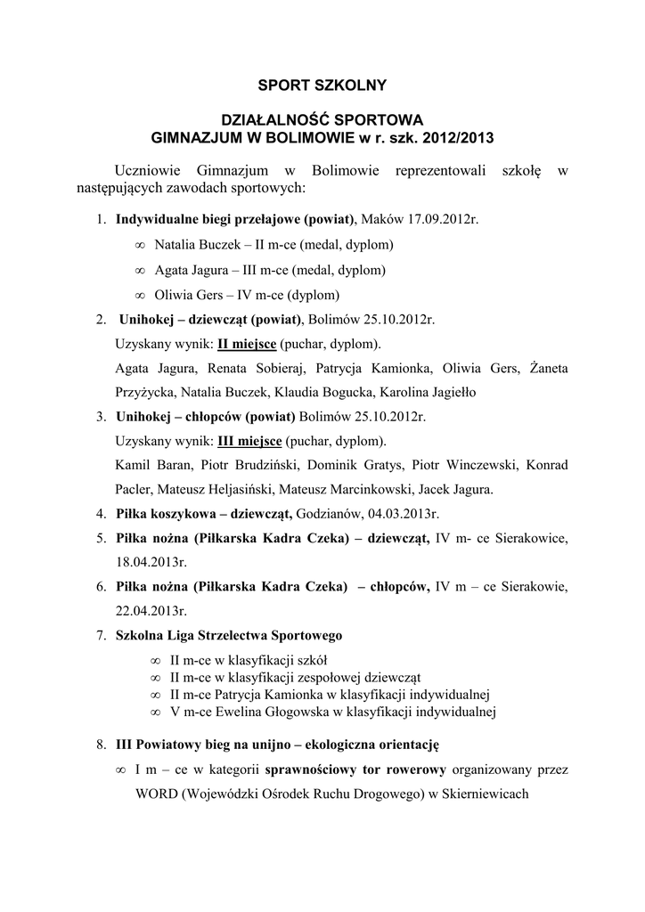 SPORT SZKOLNY DZIAŁALNOŚĆ SPORTOWA GIMNAZJUM W BOLIMOWIE w r. szk. 2012/2013 Uczniowie Gimnazjum w Bolimowie następujących zawodach sportowych: reprezentowali szkołę w 1. Indywidualne biegi przełajowe (powiat), Maków 17.09.2012r. • Natalia Buczek – II m-ce (medal, dyplom) • Agata Jagura – III m-ce (medal, dyplom) • Oliwia Gers – IV m-ce (dyplom) 2. Unihokej – dziewcząt (powiat), Bolimów 25.10.2012r. Uzyskany wynik: II miejsce (puchar, dyplom). Agata Jagura, Renata Sobieraj, Patrycja Kamionka, Oliwia Gers, Żaneta Przyżycka, Natalia Buczek, Klaudia Bogucka, Karolina Jagiełło 3. Unihokej – chłopców (powiat) Bolimów 25.10.2012r. Uzyskany wynik: III miejsce (puchar, dyplom). Kamil Baran, Piotr Brudziński, Dominik Gratys, Piotr Winczewski, Konrad Pacler, Mateusz Heljasiński, Mateusz Marcinkowski, Jacek Jagura. 4. Piłka koszykowa – dziewcząt, Godzianów, 04.03.2013r. 5. Piłka nożna (Piłkarska Kadra Czeka) – dziewcząt, IV m- ce Sierakowice, 18.04.2013r. 6. Piłka nożna (Piłkarska Kadra Czeka) – chłopców, IV m – ce Sierakowie, 22.04.2013r. 7. Szkolna Liga Strzelectwa Sportowego • • • • II m-ce w klasyfikacji szkół II m-ce w klasyfikacji zespołowej dziewcząt II m-ce Patrycja Kamionka w klasyfikacji indywidualnej V m-ce Ewelina Głogowska w klasyfikacji indywidualnej 8. III Powiatowy bieg na unijno – ekologiczna orientację • I m – ce w kategorii sprawnościowy tor rowerowy organizowany przez WORD (Wojewódzki Ośrodek Ruchu Drogowego) w Skierniewicach