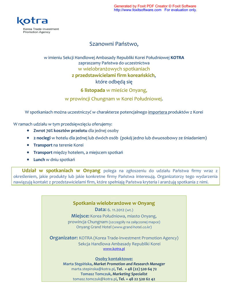Generated by Foxit PDF Creator © Foxit Software http://www.foxitsoftware.com For evaluation only. Szanowni Państwo, w imieniu Sekcji Handlowej Ambasady Republiki Korei Południowej KOTRA zapraszamy Państwa do uczestnictwa w wielobranżowych spotkaniach z przedstawicielami firm koreańskich, które odbędą się 6 listopada w mieście Onyang, w prowincji Chungnam w Korei Południowej. W spotkaniach można uczestniczyć w charakterze potencjalnego importera produktów z Korei W ramach udziału w tym przedsięwzięciu oferujemy: Zwrot 70% kosztów przelotu dla jednej osoby 2 noclegi w hotelu dla jednej lub dwóch osób (pokój jedno lub dwuosobowy ze śniadaniem) Transport na terenie Korei Transport między hotelem, a miejscem spotkań Lunch w dniu spotkań Udział w spotkaniach w Onyang polega na zgłoszeniu do udziału Państwa firmy wraz z określeniem, jakie produkty lub jakie konkretne firmy Państwa interesują. Organizatorzy tego wydarzenia nawiązują kontakt z przedstawicielami firm, które spełniają Państwa kryteria i aranżują spotkania z nimi. .net / Spotkania wielobranżowe w Onyang Data: 6. 11.2012 (wt.) Miejsce: Korea Południowa, miasto Onyang, prowincja Chungnam (szczegóły na załączonej mapce) Onyang Grand Hotel (www.grand-hotel.co.kr) Organizator: KOTRA (Korea Trade-Investment Promotion Agency) Sekcja Handlowa Ambasady Republiki Korei www.kotra.pl Osoby kontaktowe: Marta Stępińska, Market Promotion and Research Manager [email protected], Tel. + 48 (22) 520 64 72 Tomasz Tomczuk, Marketing Specialist [email protected], Tel. + 48 22 520 62 42 Generated by Foxit PDF Creator © Foxit Software http://www.foxitsoftware.com For evaluation only. Udział w rozmowach jest bezpłatny, ze swojej strony zapewniamy tłumacza koreańskoangielskiego (na życzenie koreańsko-polskiego) Rozmowy mają charakter indywidualny. Udział w spotkaniach nie zobowiązuje do podjęcia współpracy. Służymy pośrednictwem w rezerwacji i zakupie biletu lotniczego (koszt biletu w dwie strony waha się w granicach 2 500 – 4 500 pln) W podróży może uczestniczyć więcej osób z Państwa firmy; oferujemy wówczas pokój dwuosobowy, zwracamy część kosztów przelotu dla jednej. Jeśli są Państwo zainteresowani uczestnictwem w powyższym przedsięwzięciu, proszę o kontakt telefoniczny lub mailowy z naszym biurem. Z poważaniem, Marta Stępińska Marta Stępińska Market Promotion and Research Manager [email protected] Korea Business Center (KOTRA) Sekcja Handlowa Ambasada Republiki Korei w Polsce Warszawskie Centrum Finansowe ul. Emilii Plater 53, 21 piętro, 00-113 Warszawa, Polska Tel: + 48 (22) 520 64 72 Fax: + 48 (22) 520 62 31 www.kotra.pl