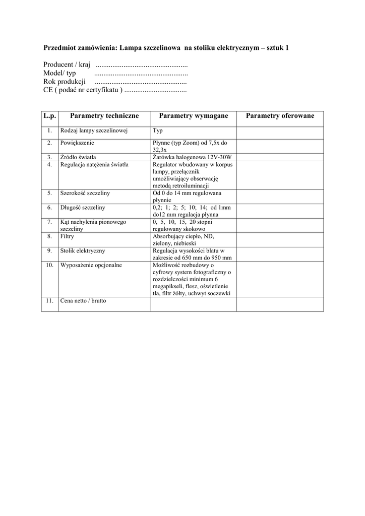 Przedmiot zamówienia: Lampa szczelinowa na stoliku elektrycznym – sztuk 1 Producent / kraj .................................................. Model/ typ ................................................... Rok produkcji .................................................. CE ( podać nr certyfikatu ) .................................. L.p. Parametry techniczne Parametry wymagane 1. Rodzaj lampy szczelinowej Typ 2. Powiększenie 3. 4. Źródło światła Regulacja natęŜenia światła 5. Szerokość szczeliny 6. Długość szczeliny 7. 8. Kąt nachylenia pionowego szczeliny Filtry 9. Stolik elektryczny 10. WyposaŜenie opcjonalne Płynne (typ Zoom) od 7,5x do 32,3x śarówka halogenowa 12V-30W Regulator wbudowany w korpus lampy, przełącznik umoŜliwiający obserwację metodą retroiluminacji Od 0 do 14 mm regulowana płynnie 0,2; 1; 2; 5; 10; 14; od 1mm do12 mm regulacja płynna 0, 5, 10, 15, 20 stopni regulowany skokowo Absorbujący ciepło, ND, zielony, niebieski Regulacja wysokości blatu w zakresie od 650 mm do 950 mm MoŜliwość rozbudowy o cyfrowy system fotograficzny o rozdzielczości minimum 6 megapikseli, flesz, oświetlenie tła, filtr Ŝółty, uchwyt soczewki 11. Cena netto / brutto Parametry oferowane