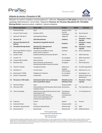 Receptura H022 Odżywka do włosów z Floraesters K-100 Odżywka nie zawiera związków czwartorzędowych i silikonów. Floraesters K-100 Jojoba kondycjonuje włosy, zapobiega elektryzowaniu i chroni kolor. Połączenie Floramac 10, Floramac Macadamia Oil i Floralipids Moringa Butter zapewnia połysk, miękkość i ułatwia układanie. Nazwa zwyczajowa Nazwa INCI Funkcja 1 Deionized Water Aqua q.s. 2 Versene® Na2 Crystals Disodium EDTA Rozpuszczalnik Czynnik chelatujący 0,1 Dow Chemical 3 Natrosol® 250 HR CS Hydroxyethylcellulose Zagęstnik 0,1 Ashland, Inc. 4 Floramac 10 Ethyl Macadamiate Emolient 1 5 Floramac Macadamia Oil Refined Macadamia Integrifolia Seed Oil 6 Floralipids Moringa Butter Moringa Oil / Hydrogenated Moringa Oil Esters 7 Theobroma Grandiflorum Seed Butter (and) Tocopherol Ethylhexyl Methoxycinnamate (&) BHT Emolient 8 Rain Forest RF3410- Cupaucu Butter Refined Eusolex® 2292 Filtr UV 1 EMD Chemicals 9 Lanette® 16 Cetyl Alcohol Ko-emulgator 2 BASF Corporation 10 Crodacol S95-PA-(MH) Stearyl Alcohol Ko-emulgator 2 Croda, Inc. 11 Ritamulse SCG Glceryl Stearate (and) Cetearyl Alcohol (and) Sodium Stearoyl Lactylate Emulgator 5 Rita Corporation 12 Vitamin E Acetate Tocopheryl Acetate Witamina E 0,5 Essential Ingredients 13 Amihope® LL Lauroyl Lysine Skłądnik tekturyzujący 0,2 Ajinomoto Co. Inc. 14 Botanimulse® DGMS Polyglyceryl-2 Stearate Ko-emulgator 1 Botanigenics, Inc. 15 Zemea® Propanediol Propanediol Humektant 1 DuPont Tate & Lyle BioProducts 16 Floraesters K-100 Jojoba Hydrolyzed Jojoba Esters (and) Jojoba Esters (and) Water (Aqua) Składnik przeciw blaknięciu farby 1 Floratech / Protec Ingredia 17 Deionized Water Aqua Rozpuszczalnik 18 Microcare PHD Phenoxyethanol (and) Decylene Glycol (and) Konserwant Propylene Glycol 19 Fision KeraVeg18 Wheat Amino Acids (and) Soy Amino Acids (and) Arginine HCl (and) Serine (and) Threonine Amino Acids (and) Arginine HCl (and) Serine (and) Threonine Aminokwasy identyczne z aminokwasami włosa 20 Fragrance Parfum Zapach q.s. 21 Deionized Water Aqua Rozpuszczalnik q.s. 22 Pyridoxine Hydrochloride Pyridoxine Hydrochloride Witamina B6 0,1 DSM 23 Niacinamide PC Niacinamide Witamina B3 0,25 DSM Nutritional Emolient Emolient %W/W 1 0,5 0,5 Dostawca Floratech / Protec Ingredia Floratech / Protec Ingredia Floratech / Protec Ingredia Beraca Ingredients q.s. q.s. 2 Thor Specialties, Ltd. Tri-K Industries Inc. Premier ProTec Ingredia Polska ul. Berezynska 6A/1, 03-904 Warszawa www.protecingredia.pl NIP: 113-28-31-922 Informacje podajemy według naszej najlepszej wiedzy i uważamy je za prawidłowe,jednakże nie możemy zagwarantować ich dokładności. Potencjalni nabywcy wszelkich produktów nie powinni polegać tylko na informacjach podanych w niniejszym dokumencie, ale powinni przeprowadzać własne badania, aby ustalić, czy produkty te są odpowiednie dla konkretnego zastosowania. Państwa zadaniem jest, aby dokładnie przetestować wszystkie preparaty. Wszelkie gwarancje, odszkodowania lub zobowiązania podane przez prawo wyłączają z odpowiedzialnośći ProTec Ingredia Polska w najszerszym zakresie dozwolonym przez prawo. Polska w najszerszym zakresie dozwolonym przez prawo. Sposób przygotowania Do głównej kolby dodać: Purified Water Rozpocząć mieszanie ze średnią prędkością Disodium EDTA Mieszać do rozpuszczenia Podgrzać do 80C Do głównej kolby powoli dodać: Natrosol 250HR CS Mieszać, aż Natrosol ulegnie uwodnieniu W odpowiedniej dodatkowej kolbie zmieszać: Floramac 10 Floramac Macadamia Oil Refined Floralipids Moringa Butter Rain Forest RF3410- Cupaucu Butter Refined Eusolex® 2292 Lanette® 16 Crodacol S95-PA-(MH) Ritamulse SCG Vitamin E Acetate Amihope® LL Botanimulse® DGMS Podgrzać do temperatury 75 - 80C. Mieszać do uzyskania homogenicznej mieszaniny. Mieszaninę z kolby dodatkowej dodać do kolby głównej, mieszać szybko do uzyskania jednolitej emulsji. Schłodzić do temperatury 50 -55C. Do dodatkowej kolby dodać: Floraesters K-100 Propanediol Water Mieszać do uzyskania jednolitej mieszaniny Mieszaninę z kolby dodatkowej dodać do kolby głównej. Mieszać ze średnią prędkością w temp. 50 - 55oC. Do głównej kolby dodać: Preservative Fision KeraVeg18 Fragrance Mieszać ze średnią prędkością w temp. 45 - 50 oC Do oddzielnej kolby dodać: Water Pyridoxine Hydrochloride Niacinamide PC Mieszać ze średnią prędkością Zawartość kolby dodatkowej dodać do kolby głównej, mieszając ze średnią prędkością w temp. 45 - 50 oC Schłodzić do temp. 23C i sprawdzić specyfikację. Specyfikacja pH 5.0 - 6.0 Lepkość 1800 - 9700cP Kolor Biały Wygląd Opalizująca mobilna ciecz ProTec Ingredia Polska ul. Berezynska 6A/1, 03-904 Warszawa www.protecingredia.pl NIP: 113-28-31-922 Informacje podajemy według naszej najlepszej wiedzy i uważamy je za prawidłowe,jednakże nie możemy zagwarantować ich dokładności. Potencjalni nabywcy wszelkich produktów nie powinni polegać tylko na informacjach podanych w niniejszym dokumencie, ale powinni przeprowadzać własne badania, aby ustalić, czy produkty te są odpowiednie dla konkretnego zastosowania. Państwa zadaniem jest, aby dokładnie przetestować wszystkie preparaty. Wszelkie gwarancje, odszkodowania lub zobowiązania podane przez prawo wyłączają z odpowiedzialnośći ProTec Ingredia Polska w najszerszym zakresie dozwolonym przez prawo.