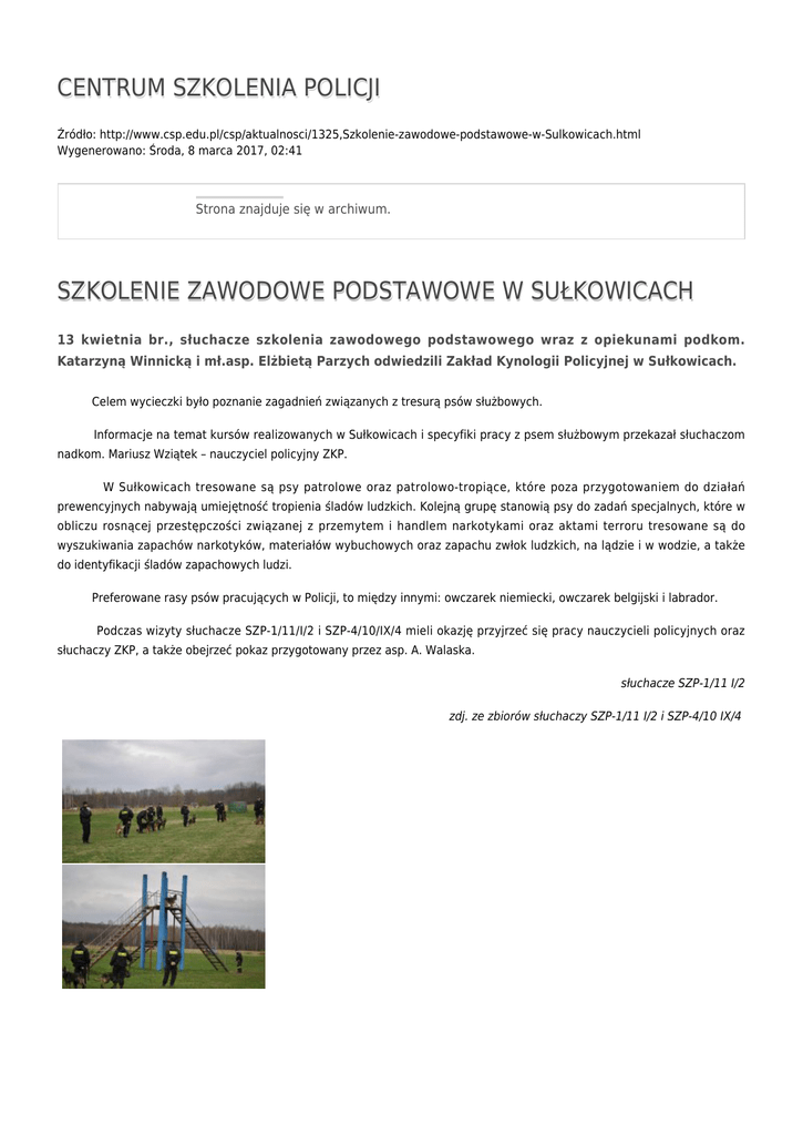 CENTRUM SZKOLENIA POLICJI Źródło: http://www.csp.edu.pl/csp/aktualnosci/1325,Szkolenie-zawodowe-podstawowe-w-Sulkowicach.html Wygenerowano: Środa, 8 marca 2017, 02:41 Strona znajduje się w archiwum. SZKOLENIE ZAWODOWE PODSTAWOWE W SUŁKOWICACH 13 kwietnia br., słuchacze szkolenia zawodowego podstawowego wraz z opiekunami podkom. Katarzyną Winnicką i mł.asp. Elżbietą Parzych odwiedzili Zakład Kynologii Policyjnej w Sułkowicach. Celem wycieczki było poznanie zagadnień związanych z tresurą psów służbowych. Informacje na temat kursów realizowanych w Sułkowicach i specyfiki pracy z psem służbowym przekazał słuchaczom nadkom. Mariusz Wziątek – nauczyciel policyjny ZKP. W Sułkowicach tresowane są psy patrolowe oraz patrolowo-tropiące, które poza przygotowaniem do działań prewencyjnych nabywają umiejętność tropienia śladów ludzkich. Kolejną grupę stanowią psy do zadań specjalnych, które w obliczu rosnącej przestępczości związanej z przemytem i handlem narkotykami oraz aktami terroru tresowane są do wyszukiwania zapachów narkotyków, materiałów wybuchowych oraz zapachu zwłok ludzkich, na lądzie i w wodzie, a także do identyfikacji śladów zapachowych ludzi. Preferowane rasy psów pracujących w Policji, to między innymi: owczarek niemiecki, owczarek belgijski i labrador. Podczas wizyty słuchacze SZP-1/11/I/2 i SZP-4/10/IX/4 mieli okazję przyjrzeć się pracy nauczycieli policyjnych oraz słuchaczy ZKP, a także obejrzeć pokaz przygotowany przez asp. A. Walaska. słuchacze SZP-1/11 I/2 zdj. ze zbiorów słuchaczy SZP-1/11 I/2 i SZP-4/10 IX/4 Ocena: 0/5 (0) Tweetnij