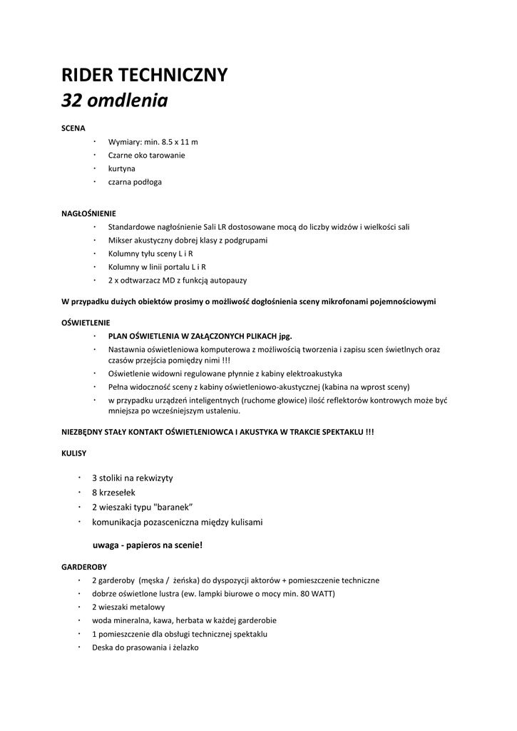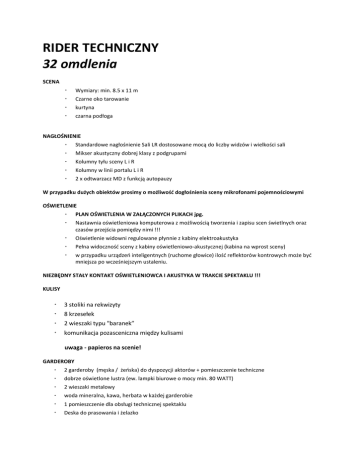 RIDER TECHNICZNY 32 omdlenia SCENA Wymiary: min. 8.5 x 11 m Czarne oko tarowanie kurtyna czarna podłoga NAGŁOŚNIENIE Standardowe nagłośnienie Sali LR dostosowane mocą do liczby widzów i wielkości sali Mikser akustyczny dobrej klasy z podgrupami Kolumny tyłu sceny L i R Kolumny w linii portalu L i R 2 x odtwarzacz MD z funkcją autopauzy W przypadku dużych obiektów prosimy o możliwość dogłośnienia sceny mikrofonami pojemnościowymi OŚWIETLENIE PLAN OŚWIETLENIA W ZAŁĄCZONYCH PLIKACH jpg. Nastawnia oświetleniowa komputerowa z możliwością tworzenia i zapisu scen świetlnych oraz czasów przejścia pomiędzy nimi !!! Oświetlenie widowni regulowane płynnie z kabiny elektroakustyka Pełna widoczność sceny z kabiny oświetleniowo-akustycznej (kabina na wprost sceny) w przypadku urządzeń inteligentnych (ruchome głowice) ilość reflektorów kontrowych może być mniejsza po wcześniejszym ustaleniu. NIEZBĘDNY STAŁY KONTAKT OŚWIETLENIOWCA I AKUSTYKA W TRAKCIE SPEKTAKLU !!! KULISY 3 stoliki na rekwizyty 8 krzesełek 2 wieszaki typu "baranek” komunikacja pozasceniczna między kulisami uwaga - papieros na scenie! GARDEROBY 2 garderoby (męska / żeńska) do dyspozycji aktorów + pomieszczenie techniczne dobrze oświetlone lustra (ew. lampki biurowe o mocy min. 80 WATT) 2 wieszaki metalowy woda mineralna, kawa, herbata w każdej garderobie 1 pomieszczenie dla obsługi technicznej spektaklu Deska do prasowania i żelazko NIEZBĘDNA MIEJSCOWA OBSŁUGA SPEKTAKLU przy montażu i demontażu Kierownik sceny Inspicjent 1 akustyk 1 oświetleniowiec 1 montażysta ROZSTAWIENIE SCENOGRAFII Montaż scenografii: ok. 1 godz. Ustawienie świateł: co najmniej . 7 godz. Ustawienie dźwięku: ok. 2 godz. Próba: 1.5 godziny Osoba kontaktowa w sprawach oświetlenia: Adam Czaplicki tel. 0501 527 988 Osoba kontaktowa w sprawach nagłośnienia: Agnieszka Szczepanowska tel. 0693 050 258 IMPRESARIAT TEATRU POLONIA I OCH-TEATRU Iwona Gradkowska, kom. 609 062 817 email: [email protected]