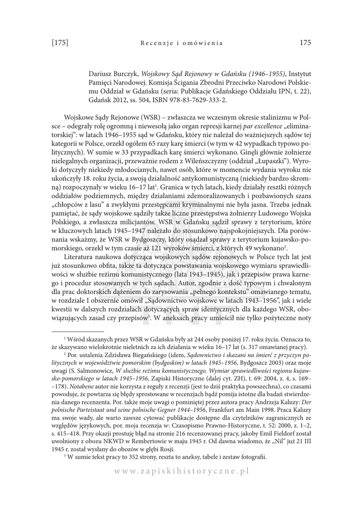[175] Recenzje i omówienia 175 Dariusz Burczyk, Wojskowy Sąd Rejonowy w Gdańsku (1946–1955), Instytut Pamięci Narodowej. Komisja Ścigania Zbrodni Przeciwko Narodowi Polskiemu Oddział w Gdańsku (seria: Publikacje Gdańskiego Oddziału IPN, t. 22), Gdańsk 2012, ss. 504, ISBN 978-83-7629-333-2. Wojskowe Sądy Rejonowe (WSR) – zwłaszcza we wczesnym okresie stalinizmu w Polsce – odegrały rolę ogromną i niewesołą jako organ represji karnej par excellence „eliminatorskiej”: w latach 1946–1955 sąd w Gdańsku, który nie należał do ważniejszych sądów tej kategorii w Polsce, orzekł ogółem 65 razy karę śmierci (w tym w 42 wypadkach typowo politycznych). W sumie w 33 przypadkach karę śmierci wykonano. Ginęli głównie żołnierze nielegalnych organizacji, przeważnie rodem z Wileńszczyzny (oddział „Łupaszki”). Wyroki dotyczyły niekiedy młodocianych, nawet osób, które w momencie wydania wyroku nie ukończyły 18. roku życia, a swoją działalność antykomunistyczną (niekiedy bardzo skromną) rozpoczynały w wieku 16–17 lat1. Granica w tych latach, kiedy działały resztki różnych oddziałów podziemnych, między działaniami zdemoralizowanych i pozbawionych szans „chłopców z lasu” a zwykłymi przestępcami kryminalnymi nie była jasna. Trzeba jednak pamiętać, że sądy wojskowe sądziły także liczne przestępstwa żołnierzy Ludowego Wojska Polskiego, a zwłaszcza milicjantów. WSR w Gdańsku sądził sprawy z terytorium, które w kluczowych latach 1945–1947 należało do stosunkowo najspokojniejszych. Dla porównania wskażmy, że WSR w Bydgoszczy, który osądzał sprawy z terytorium kujawsko-pomorskiego, orzekł w tym czasie aż 121 wyroków śmierci, z których 49 wykonano2. Literatura naukowa dotycząca wojskowych sądów rejonowych w Polsce tych lat jest już stosunkowo obfita, także ta dotycząca powstawania wojskowego wymiaru sprawiedliwości w służbie reżimu komunistycznego (lata 1943–1945), jak i przepisów prawa karnego i procedur stosowanych w tych sądach. Autor, zgodnie z dość typowym i chwalonym dla prac doktorskich dążeniem do zarysowania „pełnego kontekstu” omawianego tematu, w rozdziale I obszernie omówił „Sądownictwo wojskowe w latach 1943–1956”, jak i wiele kwestii w dalszych rozdziałach dotyczących spraw identycznych dla każdego WSR, obowiązujących zasad czy przepisów3. W aneksach pracy umieścił nie tylko pożyteczne noty 1 Wśród skazanych przez WSR w Gdańsku były aż 244 osoby poniżej 17. roku życia. Oznacza to, że skazywano wielokrotnie nieletnich za ich działania w wieku 16–17 lat (s. 317 omawianej pracy). 2 Por. ustalenia Zdzisława Biegańskiego (idem, Sądownictwo i skazani na śmierć z przyczyn politycznych w województwie pomorskim (bydgoskim) w latach 1945–1956, Bydgoszcz 2003) oraz moje uwagi (S. Salmonowicz, W służbie reżimu komunistycznego. Wymiar sprawiedliwości regionu kujawsko-pomorskiego w latach 1945–1956, Zapiski Historyczne (dalej cyt. ZH), t. 69: 2004, z. 4, s. 169– –178). Notabene autor nie korzysta z reguły z recenzji (jest to dziś praktyka powszechna), co czasami powoduje, że powtarza się błędy sprostowane w recenzjach bądź pomija istotne dla badań stwierdzenia danego recenzenta. Por. także moje uwagi o pominiętej przez autora pracy Andrzeja Kaluzy: Der polnische Parteistaat und seine polnische Gegner 1944–1956, Frankfurt am Main 1998. Praca Kaluzy ma swoje wady, ale warto zawsze cytować publikacje dostępne dla czytelników zagranicznych ze względów językowych, por. moja recenzja w: Czasopismo Prawno-Historyczne, t. 52: 2000, z. 1–2, s. 415–418. Przy okazji prostuję błąd na stronie 216 recenzowanej pracy, jakoby Emil Fieldorf został uwolniony z obozu NKWD w Rembertowie w maju 1945 r. Od dawna wiadomo, że „Nil” już 21 III 1945 r. został wysłany do obozów w głębi Rosji. 3 W sumie tekst pracy to 352 strony, reszta to aneksy, tabele i zestaw fotografii. w w w. z a p i s k i h i s t o r y c z n e . p l 176 Recenzje i omówienia [176] biograficzne osób skazanych na kary śmierci, noty biograficzne sędziów i oficerów WSR w Gdańsku, ale także nie poskąpił, z pełną akrybią, not biograficznych pracowników cywilnych WSR (w tym kierowców i sprzątaczki), a także wykazu szeregowców i podoficerów służby zasadniczej u boku WSR (s. 417–427), co ilustrują częściowo także zdjęcia wielu pracowników WSR na dalszych stronach. W niedrukowanej pracy doktorskiej nikt nie kwestionuje przekazywania przez doktoranta niemal całej wiedzy, jaką zdobył w trakcie pracy nad dysertacją. Niekoniecznie jednak należy wszystko uwieczniać drukiem4. Pomijając jednak tę uwagę, czy pewną przestrogę dla tego typu prac, należy generalnie podkreślić, że omawiana monografia wykazuje się pełną rzetelnością co do wykorzystania badanych materiałów, także absolutnie wystarczającą erudycją co do stanu badań5 i stąd już w tym miejscu zaznaczam, iż moja ogólna ocena pracy jako pożytecznej jest w pełni pozytywna. Na szczególne podkreślenie zasługuje fakt, iż, poza oczywiście pierwszoplanowymi aktami WSR, autor wykorzystał także dalsze rozliczne archiwalia, m.in. z Archiwum Państwowego w Gdańsku, archiwa PZPR, rad adwokackich i wiele istotnych dalszych zespołów archiwalnych. Można powiedzieć, iż z punktu widzenia aparatu naukowego (w tym szeregu tabel, wykresów) praca zasługuje na określenie wzorowej. Przechodząc po tych uwagach ogólnych do rozważań o ciekawych ustaleniach autora, podkreślić należy, że rozdział II zawarł wszystkie istotne elementy wynikające z jego tytułu: „Organizacja i funkcjonowanie Wojskowego Sądu Rejonowego w Gdańsku w latach 1946–1955”. Rozdział III omawia współpracę WSR z „instytucjami zewnętrznymi”, jak to określił autor, tj. z prokuraturą, UB, MO, PZPR i innymi. Fakt istotny, że gros instytucji reżimowych z reguły kry