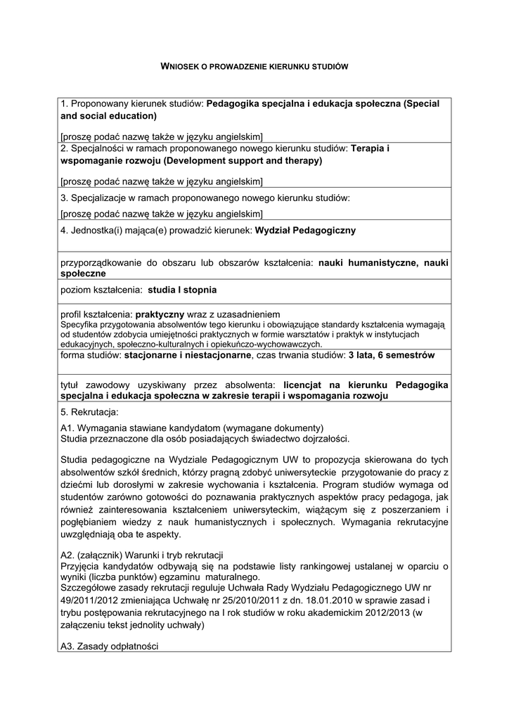 WNIOSEK O PROWADZENIE KIERUNKU STUDIÓW 1. Proponowany kierunek studiów: Pedagogika specjalna i edukacja społeczna (Special and social education) [proszę podać nazwę także w języku angielskim] 2. Specjalności w ramach proponowanego nowego kierunku studiów: Terapia i wspomaganie rozwoju (Development support and therapy) [proszę podać nazwę także w języku angielskim] 3. Specjalizacje w ramach proponowanego nowego kierunku studiów: [proszę podać nazwę także w języku angielskim] 4. Jednostka(i) mająca(e) prowadzić kierunek: Wydział Pedagogiczny przyporządkowanie do obszaru lub obszarów kształcenia: nauki humanistyczne, nauki społeczne poziom kształcenia: studia I stopnia profil kształcenia: praktyczny wraz z uzasadnieniem Specyfika przygotowania absolwentów tego kierunku i obowiązujące standardy kształcenia wymagają od studentów zdobycia umiejętności praktycznych w formie warsztatów i praktyk w instytucjach edukacyjnych, społeczno-kulturalnych i opiekuńczo-wychowawczych. forma studiów: stacjonarne i niestacjonarne, czas trwania studiów: 3 lata, 6 semestrów tytuł zawodowy uzyskiwany przez absolwenta: licencjat na kierunku Pedagogika specjalna i edukacja społeczna w zakresie terapii i wspomagania rozwoju 5. Rekrutacja: A1. Wymagania stawiane kandydatom (wymagane dokumenty) Studia przeznaczone dla osób posiadających świadectwo dojrzałości. Studia pedagogiczne na Wydziale Pedagogicznym UW to propozycja skierowana do tych absolwentów szkół średnich, którzy pragną zdobyć uniwersyteckie przygotowanie do pracy z dziećmi lub dorosłymi w zakresie wychowania i kształcenia. Program studiów wymaga od studentów zarówno gotowości do poznawania praktycznych aspektów pracy pedagoga, jak również zainteresowania kształceniem uniwersyteckim, wiążącym się z poszerzaniem i pogłębianiem wiedzy z nauk humanistycznych i społecznych. Wymagania rekrutacyjne uwzględniają oba te aspekty. A2. (załącznik) Warunki i tryb rekrutacji Przyjęcia kandydatów odbywają się na podstawie listy rankingowej ustalanej w oparciu o wyniki (liczba punktów) egzaminu maturalnego. Szczegółowe zasady rekrutacji reguluje Uchwała Rady Wydziału Pedagogicznego UW nr 49/2011/2012 zmieniająca Uchwałę nr 25/2010/2011 z dn. 18.01.2010 w sprawie zasad i trybu postępowania rekrutacyjnego na I rok studiów w roku akademickim 2012/2013 (w załączeniu tekst jednolity uchwały) A3. Zasady odpłatności Na podstawie art. 99 ust. 2 ustawy z dnia 27 lipca 2005 r. – Prawo o szkolnictwie wyższym (Dz. U. Nr 164, poz. 1365, z późn. zm.) oraz § 3 ust. 1 uchwały nr 135 Senatu Uniwersytetu warszawskiego z dnia 27 września 2006 r. w sprawie szczegółowych zasad pobierania opłat za usługi edukacyjne (Monitor UW z 2006 r. Nr 8, poz. 125) Wydział pobiera opłaty za usługi edukacyjne. Czesne dla studentów studiów niestacjonarnych, zgodnie z załącznikiem D, wynosi 3750zł. A4. Przewidywana liczba studentów/limit przyjęć (z uwzględnieniem liczby studentów oddzielnie w każdym profilu: akademickim i praktycznym): Limit przyjęć na studia stacjonarne (łączny dla wszystkich kierunków i specjalności studiów I stopnia: 220 Limit przyjęć na studia niestacjonarne (łączny dla wszystkich kierunków i specjalności studiów I stopnia: 120 6. Opis studiów: załącznik B: B. CELE KSZTAŁCENIA Absolwent jest specjalistą w zakresie wybranych obszarów pedagogiki specjalnej i edukacji społecznej. Prezentuje postawę humanistyczną: otwartości, dialogu, szacunku i wrażliwości na potrzeby ludzi marginalizowanych, wykluczonych, wymagających wsparcia i pomocy. Charakteryzuje się postawą zaangażowaną i krytyczną, przeciwstawia się zagrożeniom rozwojowym, działa w imię solidarności i sprawiedliwości społecznej. Posiada interdyscyplinarną wiedzę z zakresu pedagogiki specjalnej, pedagogiki społecznej oraz edukacji inkluzyjnej. Jest przygotowany do wspierania rozwoju osób z niepełnosprawnościami, marginalizowanych, wykluczonych, wymagających wsparcia i pomocy. Profesjonalnie posługuje się metodami, technikami oraz procedurami organizowania optymalnych warunków edukacyjnych, socjalnych, kulturowych, aktywizacji społecznej, pomocy rozwojowej oraz wolontariatu. Odznacza się umiejętnością planowania i oceny programów pomocowych, projektów aktywizacji i rozwoju środowiska lokalnego, projektów edukacyjnych, terapeutycznych dla osób niepełnosprawnych i wykluczonych społecznie. Terapia- wspomaganie rozwoju osób niepełnosprawnych - przygotowuje do pracy na stanowisku wychowawcy, pedagoga specjalnego- terapeuty. Absolwent otrzymuje tytuł zawodowy pedagoga specjalnego. Absolwenci specjalności Terapia- wspomaganie rozwoju osób niepełnosprawnych dostrzegają i diagnozują problemy rozwojowe, projektują i realizują działania terapeutyczne dla osób niepełnosprawnych. Absolwenci posiadają wiedzę z zakresu diagnozowania, układania programów terapeutycznych, udzielania pomocy oraz wsparcia rozwoju osobom niepełnosprawnych w cyklu życia. Mogą podjąć pracę jako terapeuci w ośrodkach wczesnej interwencji, zespołach wczesnego wspomagania, poradniach pedagogiczno psychologicznych, warsztatach terapii zajęciowej, domach pomocy społecznej, a także jako pedagog specjalny w internatach, placówkach wychowawczych, organizacjach rządowych samorządowych i pozarządowych, placówkach służby zdrowia. EFEKTY KSZTAŁCENIA B1 (załącznik) komentarzami tabela odniesień efektów kierunkowych do efektów obszarowych – z B2 (załącznik) matryca efektów kształcenia B3 (załącznik) PROGRAM STUDIÓW B4 (załącznik) Plan studiów stacjonarnych B5 (załącznik) Plan studiów niestacjonarnych 7. Informacja o jednostce prowadzącej studia: załącznik C: C1 (załącznik). Informacja o minimum kadrowym: C2. (załącznik) Informacja o infrastrukturze zapewniającej prawidłową realizację celów kształcenia C3. (załącznik) Informacja o do