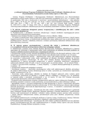 SPRAWOZDANIE z realizacji Gminnego Programu Profilaktyki i Rozwiązywania Problemów Alkoholowych oraz Przeciwdziałania Narkomanii na terenie Gminy Lipowa w 2012 roku. Gminny Program Profilaktyki i Rozwiązywania Problemów Alkoholowych oraz Przeciwdziałania Narkomanii na terenie Gminy Lipowa w roku 2012 był realizowany na podstawie art. 41 ust. 1 i 2 ustawy z dnia 26 października 1982 roku o wychowaniu w trzeźwości i przeciwdziałaniu alkoholizmowi / tekst jednolity Dz.U. z 2007 r. Nr 70, poz. 473. z póź.zm./, art. 10 ust. 1 ustawy o przeciwdziałaniu narkomanii z dnia 29 lipca 2005 roku /Dz.U. z 2005 r. Nr 179, poz. 1485 z póź. zm./ oraz Uchwały Rady Gminy Lipowa Nr XXI/114/12 z dnia 10 lutego 2012 roku w sprawie uchwalenia Gminnego Programu Profilaktyki i Rozwiązywania Problemów Alkoholowych oraz Przeciwdziałania Narkomanii w Gminie Lipowa na rok 2012: I. W zakresie zwiększenia dostępności pomocy terapeutycznej i rehabilitacyjnej dla osób i rodzin z problemem alkoholowym: 1. Współpracowano z poradniami lecznictwa odwykowego i innymi ośrodkami wspomagającymi proces zdrowienia osób uzależnionych na terenie gminy: - Dofinansowano działanie Ośrodka Leczenia Uzależnień w Żywcu i Bielsku - Białej. - W zamian za patrolowanie miejsc publicznych, miejsc zgromadzeń na wolnym powietrzu i innych imprez organizowanych przez Gminę, za kontrolowanie profilaktyczne miejsc publicznych oraz za prowadzenie zajęć profilaktycznych z dziećmi i młodzieżą zwłaszcza o tematyce poświęconej narkomanii dofinansowano zakup paliwa dla Straży Granicznej. II. W zakresie pomocy psychospołecznej i prawnej dla rodzin z problemem alkoholowym, a w szczególności ochrony przed przemocą realizowano następujące zadania: 1. Podejmowano czynności przez Gminną Komisję Rozwiązywania Problemów Alkoholowych w Lipowej zmierzające do orzeczenia o zastosowaniu wobec osoby uzależnionej od alkoholu obowiązku poddania się leczeniu w zakładzie lecznictwa odwykowego, w następującym zakresie: a. Przyjmowano wnioski od osób, instytucji posiadających interes prawny lub obowiązek społeczny wobec osób nadużywających alkoholu powodujących na skutek nadużywania alkoholu skutki określone w art. 24 ustawy. b. Prowadzono postępowania prawno – administracyjne wobec osób nadużywających alkoholu zmierzające do orzeczenia o zastosowaniu wobec osoby uzależnionej od alkoholu obowiązku poddania się leczeniu w zakładzie lecznictwa odwykowego. W roku 2012 Gminna Komisja Rozwiązywania Problemów Alkoholowych w Lipowej prowadziła postępowanie w sprawie wyjaśnienia okoliczności wskazujących nadużywanie alkoholu wobec 48 osób, w tym 31 nowych spraw: na wniosek rodziny – 10, na wniosek Policji – 3, innych w tym pracownika socjalnego - 3, Straży Miejskiej – 1, Zespołu Interdyscyplinarnego ds. przemocy w rodzinie – 14. c. Postępowanie obejmowało następujące czynności: - Prowadzono rozmowy - interwencje, psychologiczne wobec osób nadużywających alkoholu, prowadzące do podjęcia dobrowolnego leczenia odwykowego przez te osoby i pouczenie jej o konieczności zaprzestania działań wymienionych w art. 24, - Kierowano osoby nadużywające alkoholu na badanie do biegłych sądowych celem wydania opinii w przedmiocie uzależnienia od alkoholu w wypadku odmowy współpracy z Komisją r.p.a., po spełnieniu co najmniej jednej z przesłanek wymienionych w art. 24 ustawy. W roku 2012 Komisja skorzystała z powyższego uprawnienia i skierowała na badanie 11 osób, - Przygotowywano dokumentację związaną z postępowaniem sądowym: opinię wydaną przez biegłego, wniosek do Komisji, protokół z rozmowy z osobą uzależnioną, wywiad środowiskowy, a także informacje z policji, - Sporządzano wnioski o wszczęcie postępowania do Sądu Rejonowego w Żywcu o zastosowanie obowiązku poddania się leczeniu w zakładzie lecznictwa odwykowego. W 2012 roku Komisja po zebraniu odpowiedniego materiału dowodowego skierowała do Sądu Rejonowego w Żywcu – 8 wniosków o zastosowanie obowiązku leczenia odwykowego. d. Prowadzono punkt informacyjno – konsultacyjny dla osób i rodzin z problemem alkoholowym w godzinach pracy Gminnego Ośrodka Pomocy Społecznej, udzielano informacji o chorobie alkoholowej i możliwościach leczenia osób uzależnionych od alkoholu i członków rodzin, udzielano pomocy prawnej wobec przemocy i innych zaburzeń funkcjonowania rodziny powodowanych przez picie alkoholu, przyjmowano wnioski do Komisji r.p.a. 2. W szkołach podstawowych w świetlicach szkolnych w Lipowej, Leśnej, Twardorzeczce, Siennej i Słotwinie prowadzono zajęcia socjoterapeutyczne dla dzieci i młodzieży z grup podwyższonego ryzyka. 3. Prowadzono punkt informacyjno – konsultacyjny dla osób i rodzin z problemem alkoholowym oraz udzielano pomocy psychoterapeutycznej dla osób współuzależnionych w Urzędzie Gminy Lipowa oraz przy Kościele Parafialnym pw. Świętego Michała Archanioła w Leśnej. III. W zakresie profilaktycznej działalności informacyjnej i edukacyjnej w szczególności dla dzieci i młodzieży zrealizowano: 1. W szkołach podstawowych i gimnazjum organizowano akcje i spotkania o tematyce profilaktycznej: - w Gimnazjum im. Jana Pawła II w Twardorzeczce zorganizowano VI Regionalny Konkurs Wiedzy z Zakresu Uzależnień, Szkolny Dzień Profilaktyki oraz przystąpiono do kampanii „Młodzież Kibicuje Bezpiecznie” - W Szkole Podstawowej im. K. K. Baczyńskiego w Lipowej, K. Makuszyńskiego w Leśnej i im. M. Konopnickiej w Twardorzeczce wystawiono spektakle profilaktyczne dla klas I – III „Planeta zagadek” klasy IV – VI „Reguły Gry”. - Szkoła Podstawowa im. K. Makuszyńskiego w Leśnej wraz z Policją i Strażą Pożarną zorganizowała Dzień Bezpieczeństwa i konkurs plastyczny o tematyce profilaktycznej dotyczącego biernego palenia . - Zespół Szkolno – Przedszkolny w Słotwinie zorganizował Szkolny dzień „AGRESJI – NIE”.