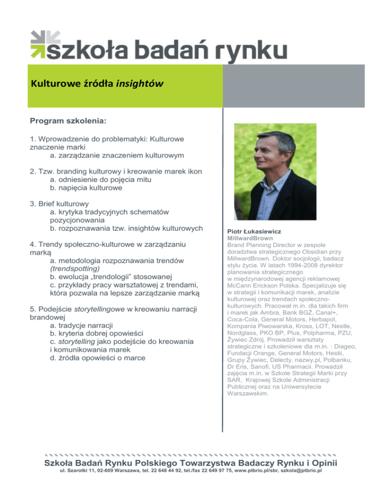 Kulturowe źródła insightów Program szkolenia: 1. Wprowadzenie do problematyki: Kulturowe znaczenie marki a. zarządzanie znaczeniem kulturowym 2. Tzw. branding kulturowy i kreowanie marek ikon a. odniesienie do pojęcia mitu b. napięcia kulturowe 3. Brief kulturowy a. krytyka tradycyjnych schematów pozycjonowania b. rozpoznawania tzw. insightów kulturowych 4. Trendy społeczno-kulturowe w zarządzaniu marką a. metodologia rozpoznawania trendów (trendspotting) b. ewolucja „trendologii” stosowanej c. przykłady pracy warsztatowej z trendami, która pozwala na lepsze zarządzanie marką 5. Podejście storytellingowe w kreowaniu narracji brandowej a. tradycje narracji b. kryteria dobrej opowieści c. storytelling jako podejście do kreowania i komunikowania marek d. źródła opowieści o marce Piotr Łukasiewicz MillwardBrown Brand Planning Director w zespole doradztwa strategicznego Obsidian przy MillwardBrown. Doktor socjologii, badacz stylu życia. W latach 1994-2008 dyrektor planowania strategicznego w międzynarodowej agencji reklamowej McCann Erickson Polska. Specjalizuje się w strategii i komunikacji marek, analizie kulturowej oraz trendach społecznokulturowych. Pracował m.in. dla takich firm i marek jak Ambra, Bank BGŻ, Canal+, Coca-Cola, General Motors, Herbapol, Kompania Piwowarska, Kross, LOT, Nestle, Nordglass, PKO BP, Plus, Polpharma, PZU, Żywiec Zdrój. Prowadził warsztaty strategiczne i szkoleniowe dla m.in. : Diageo, Fundacji Orange, General Motors, Hestii, Grupy Żywiec, Delecty, nazwy.pl, Polbanku, Dr Eris, Sanofi, US Pharmacii. Prowadził zajęcia m.in. w Szkole Strategii Marki przy SAR, Krajowej Szkole Administracji Publicznej oraz na Uniwersytecie Warszawskim. Szkoła Badań Rynku Polskiego Towarzystwa Badaczy Rynku i Opinii ul. Szarotki 11, 02-609 Warszawa, tel. 22 648 44 92, tel./fax 22 649 97 75, www.ptbrio.pl/sbr, [email protected]